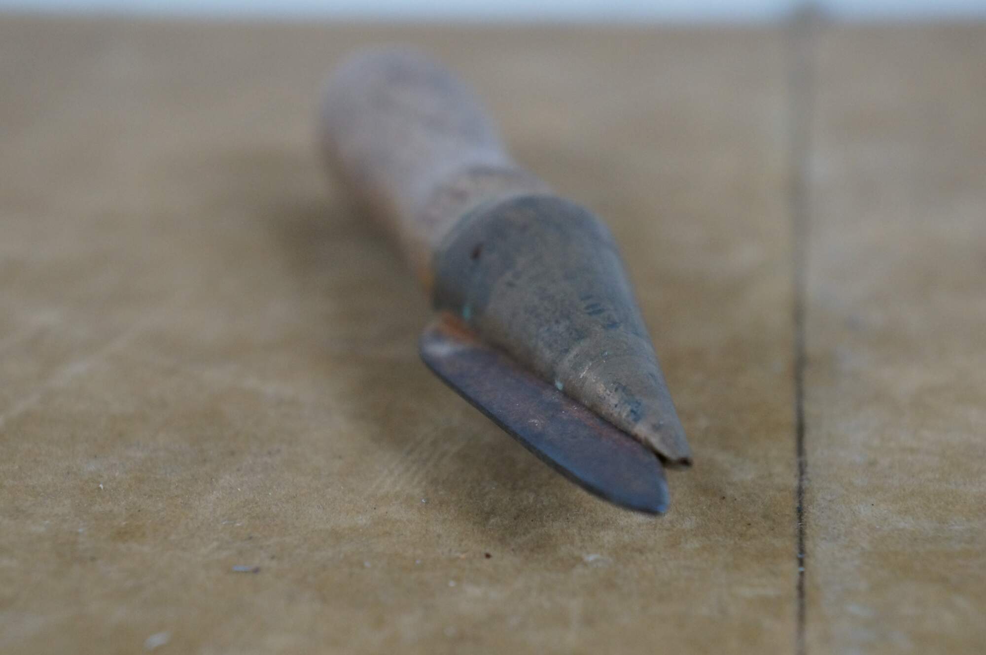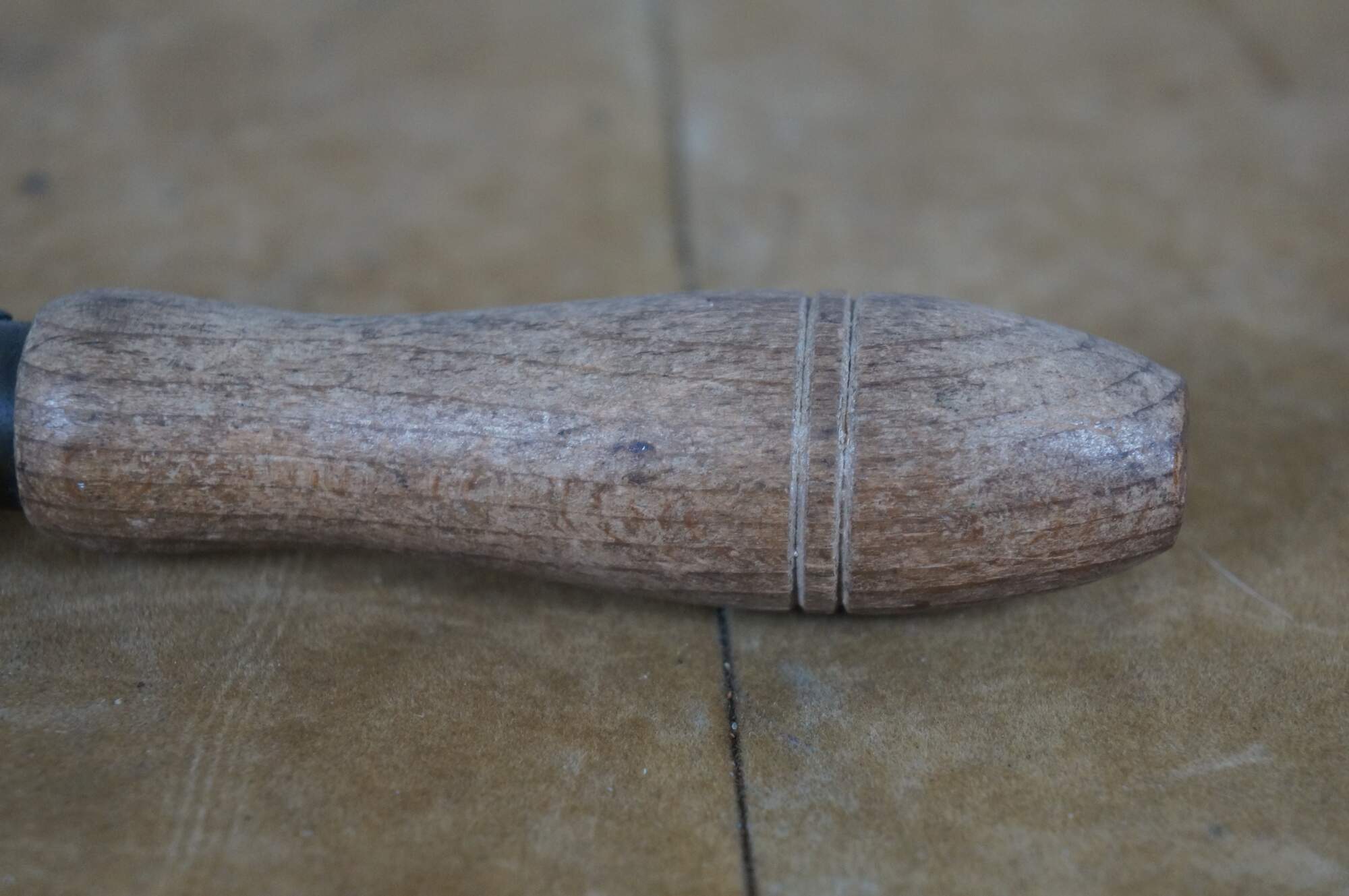 Vintage 20th century cork borer sharpener. Comprised of a solid brass cone and hinged blade in a slot; turned wood handle. Designed to sharpen cork borers in a variety of sizes.
