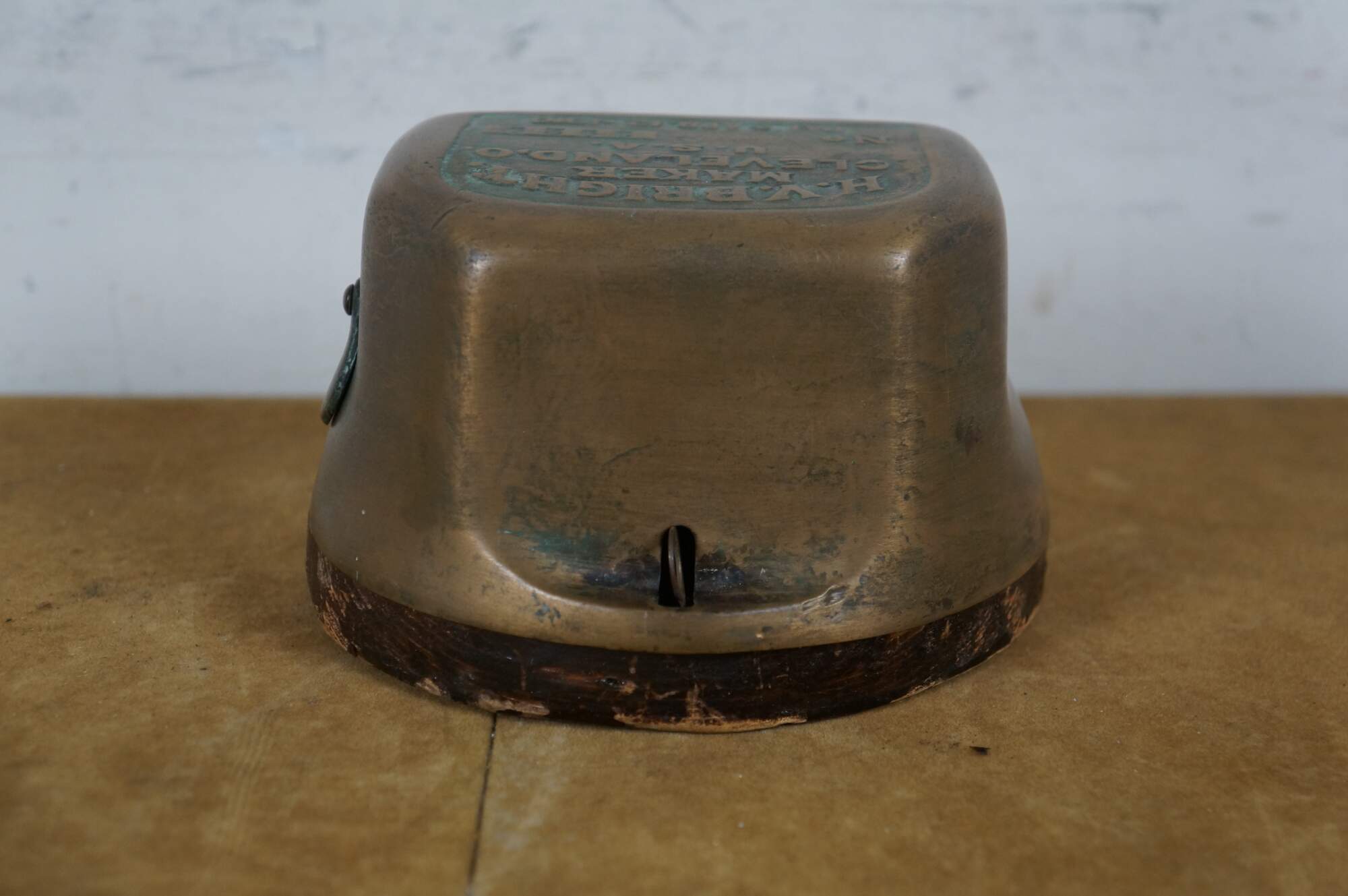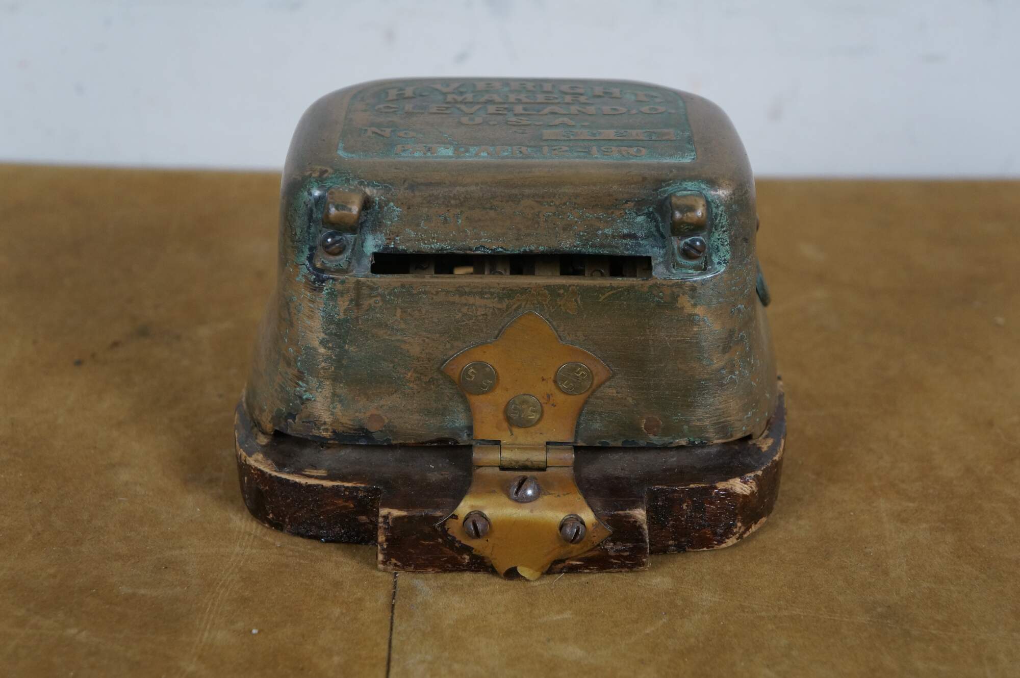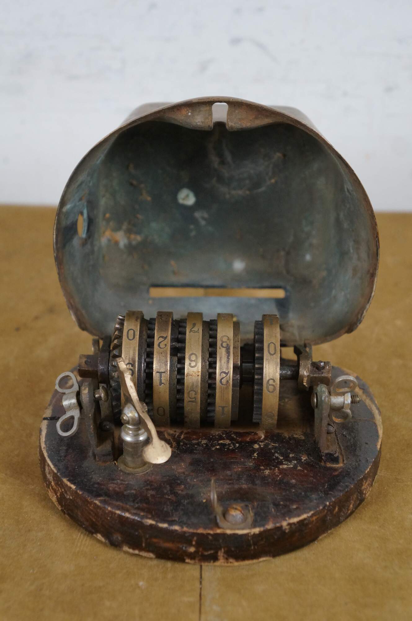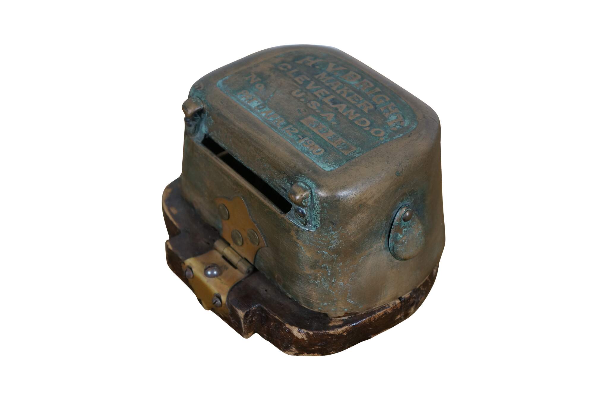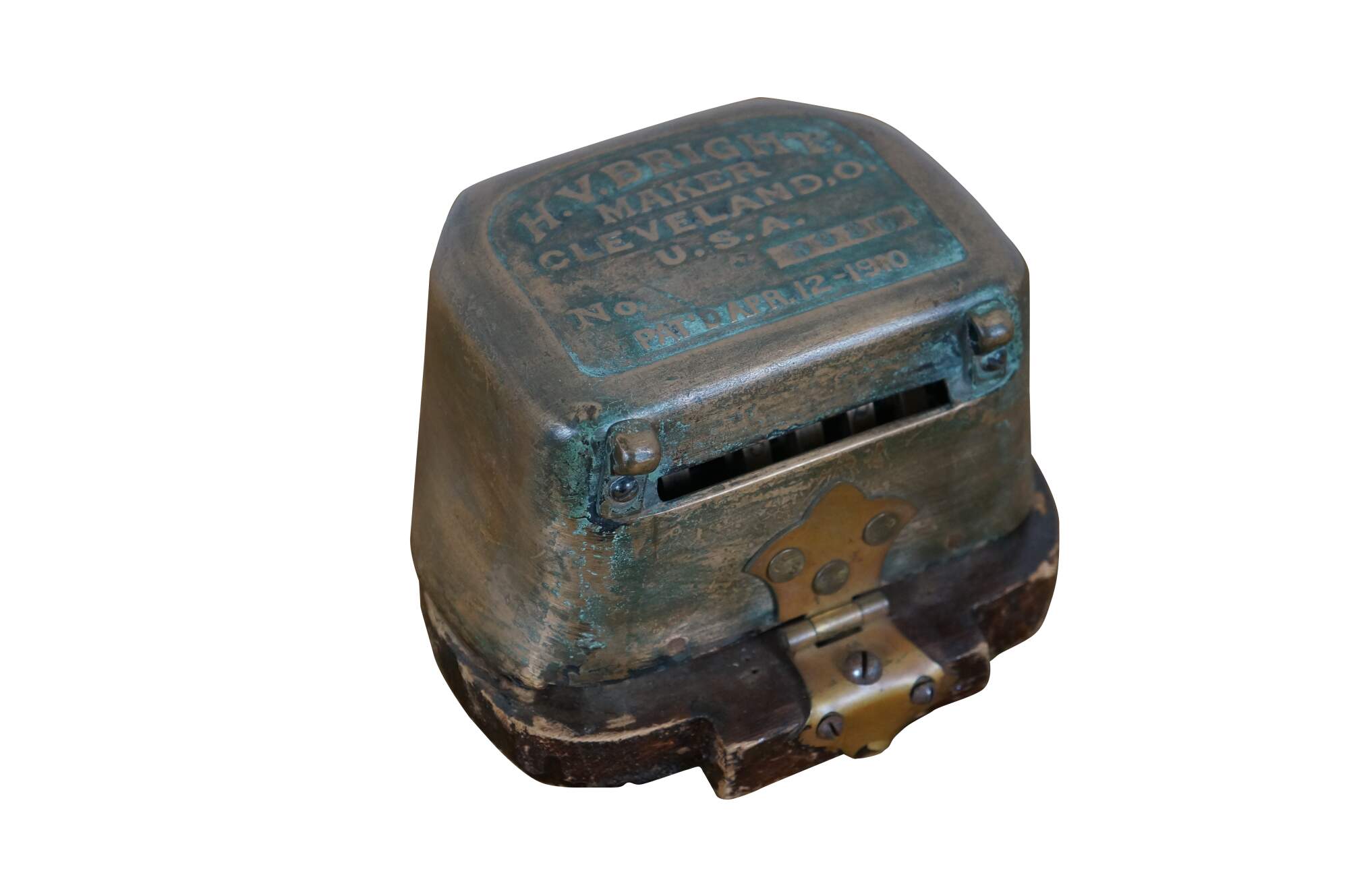 Rare early 20th century brass cap / topper for a turstile. Wood base with a flip top brass lid, opens to reveal a five digit counting mechanism. H.V. Bright, Maker, Cleveland, O, USA - No. 3929 - Pat'd Apr. 12-1910.