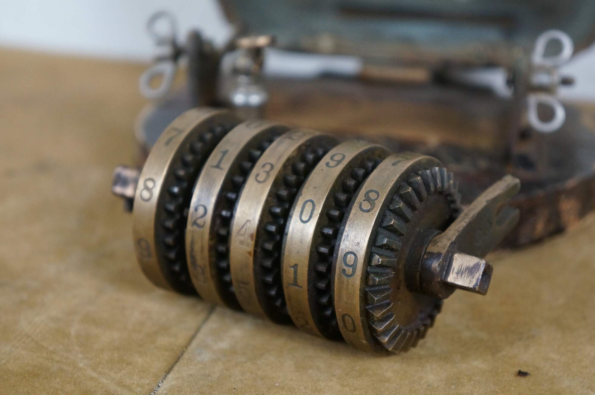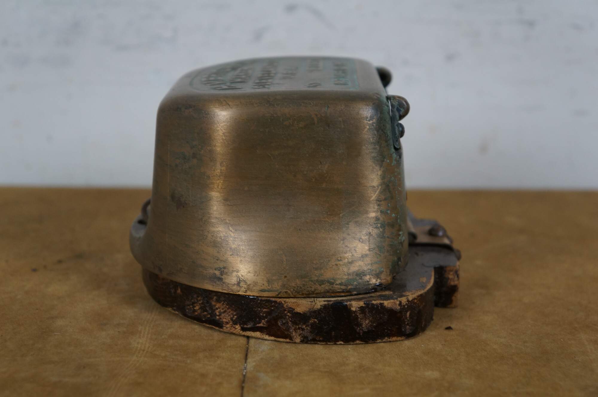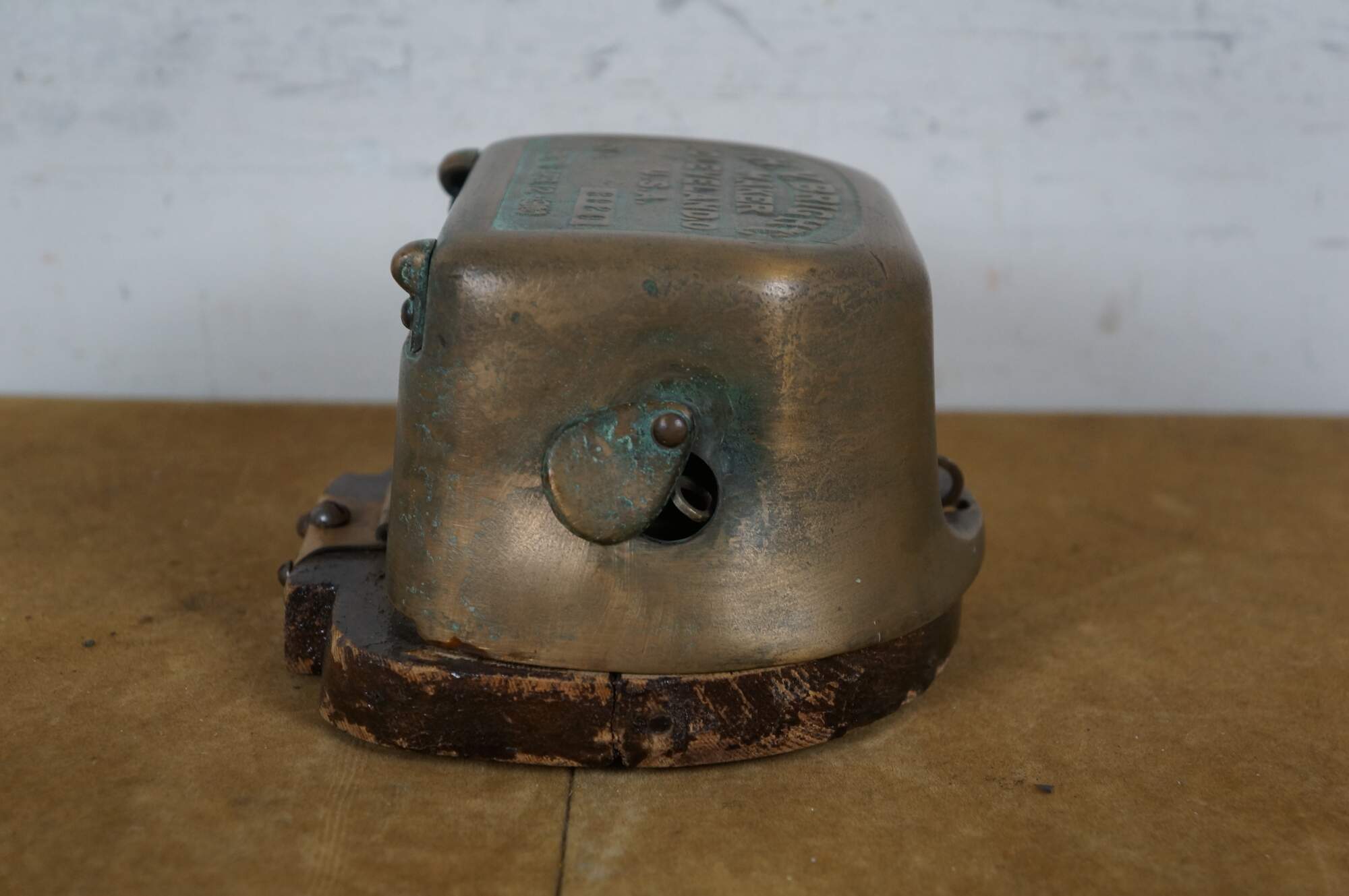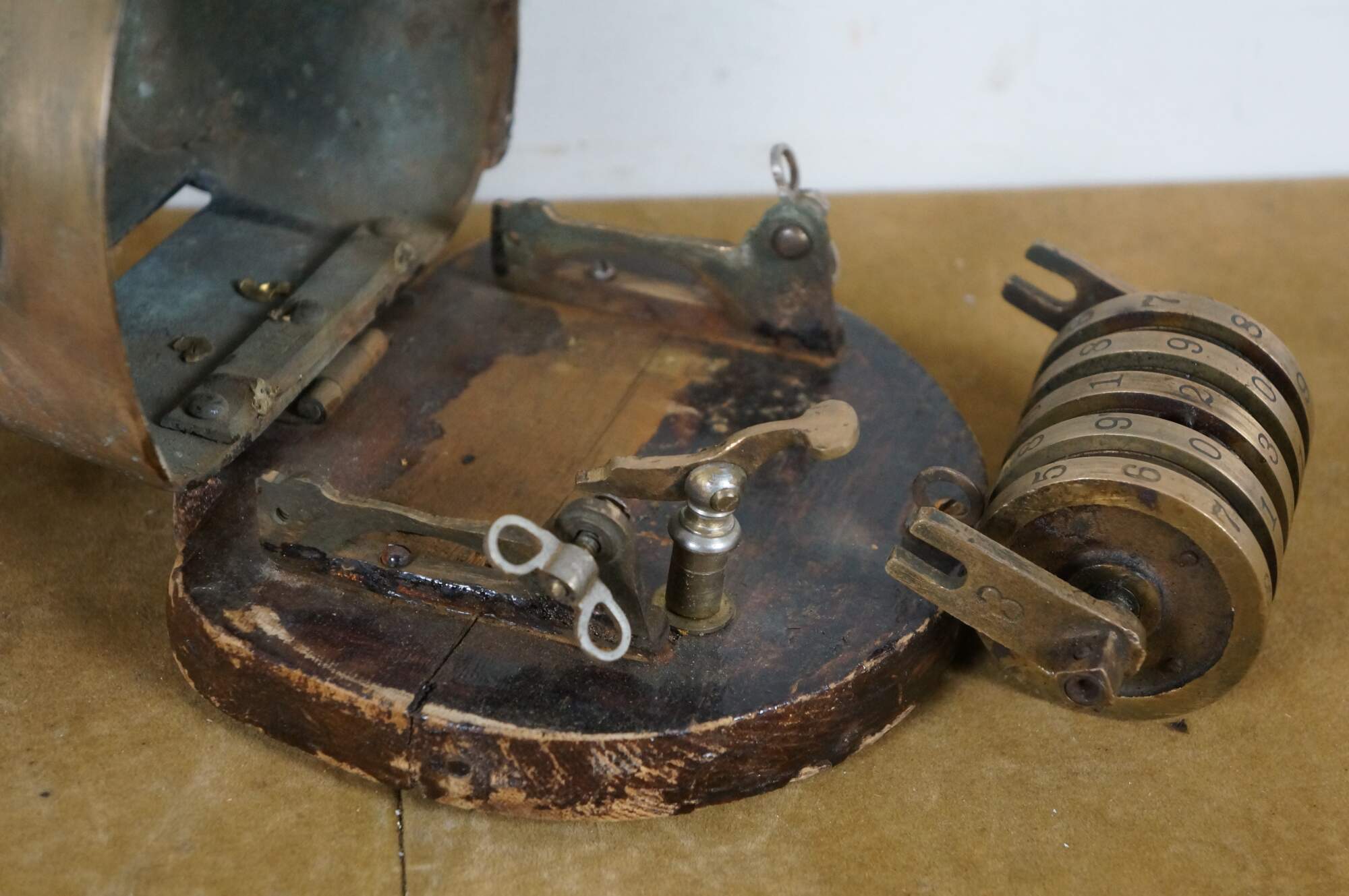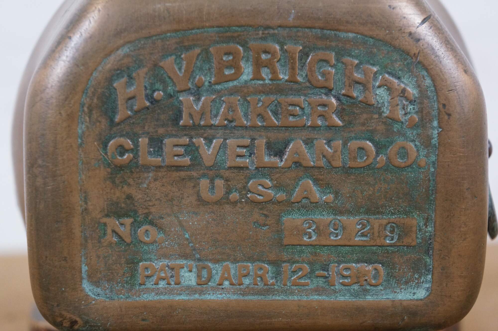 Rare early 20th century brass cap / topper for a turstile. Wood base with a flip top brass lid, opens to reveal a five digit counting mechanism. H.V. Bright, Maker, Cleveland, O, USA - No. 3929 - Pat'd Apr. 12-1910.