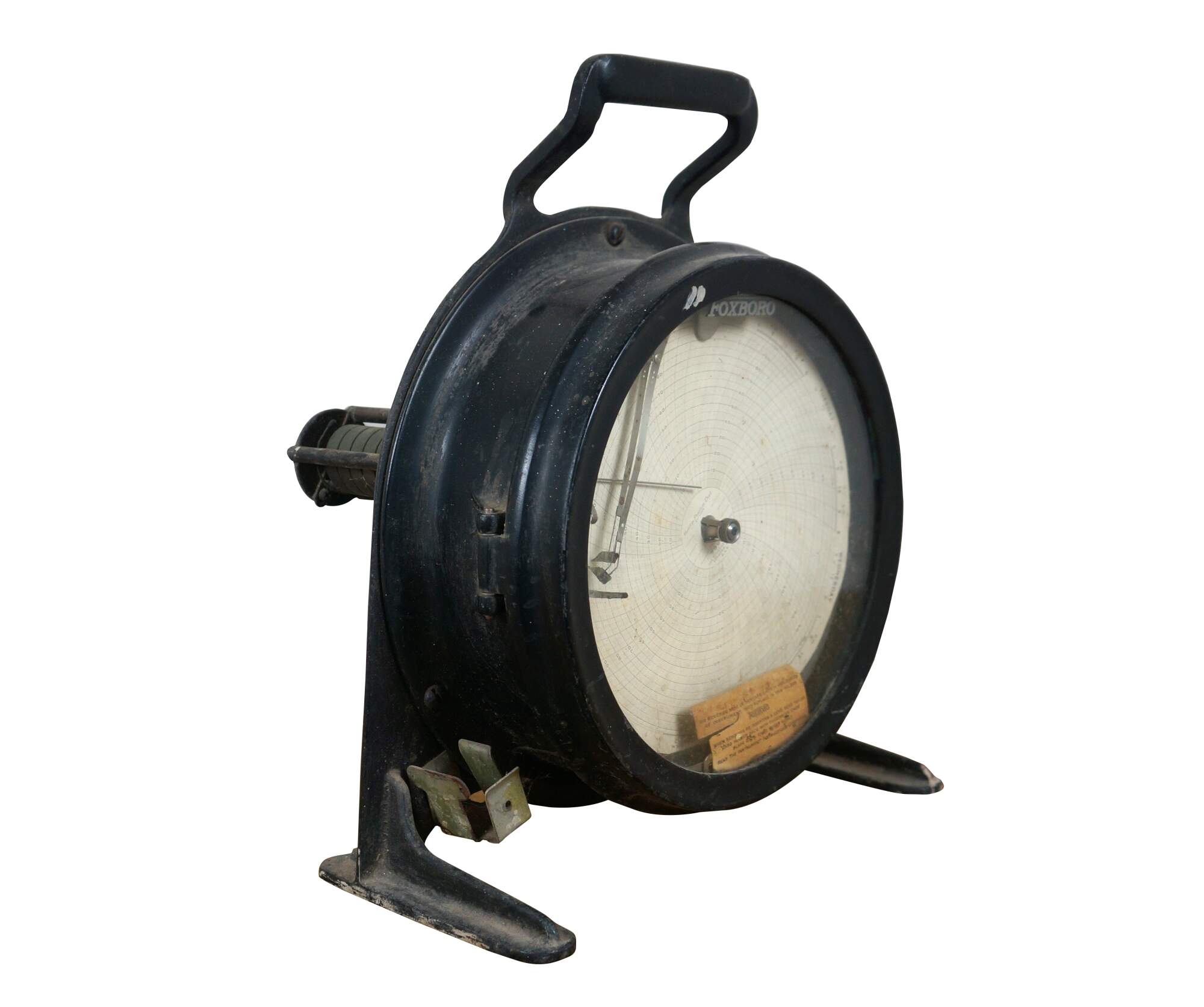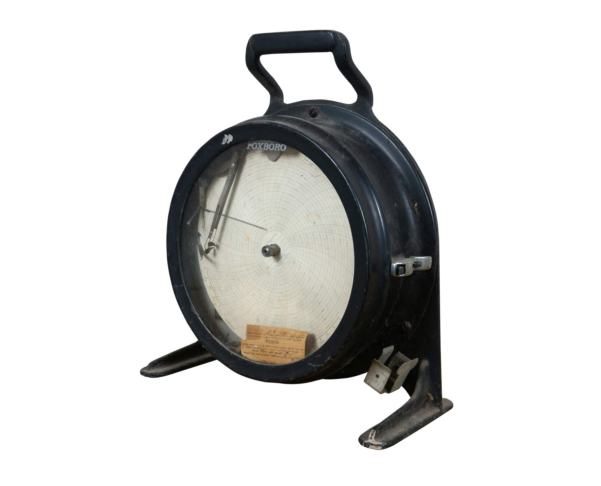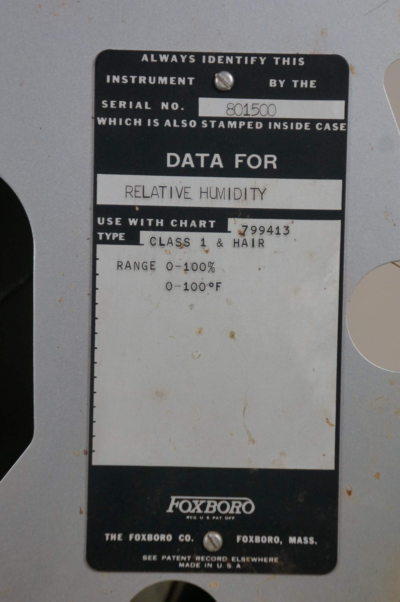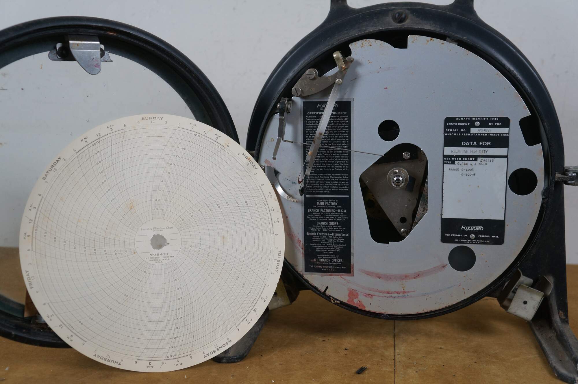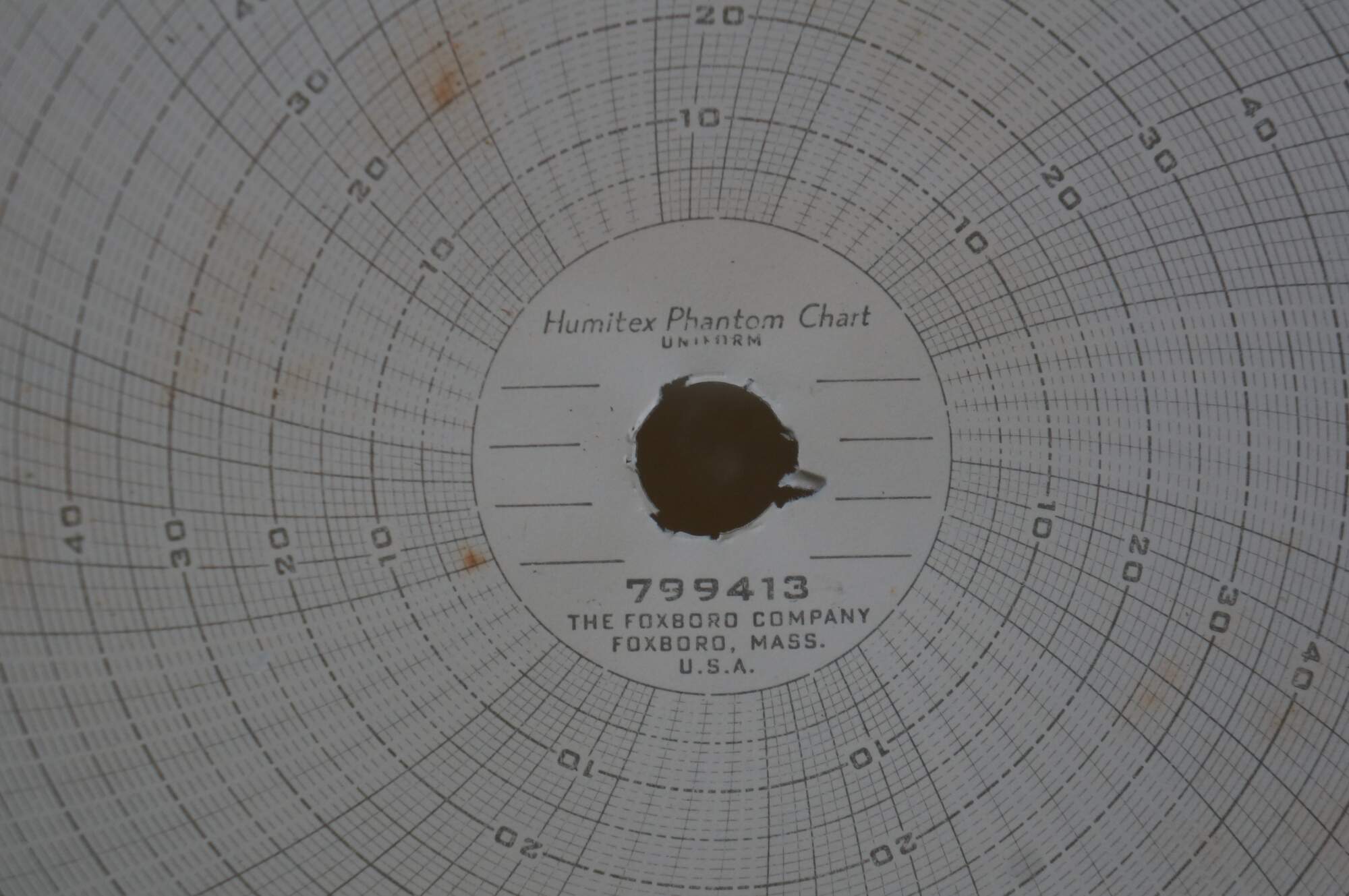 Mid 20th century Foxboro 7 Day humidity / temperature chart recorder. Serial No. 801500 - Data for Relative Humidity - Use with Chart Type 799413 Class 1 & Hair - Range 0-100% 0-100F. Telechron Motor Movement - Type IM2-7D - V 100 130 - MOT/MOD 538M2762 - CY 60 - W 4 - NP 290 - Manufactured for The Foxboro Company, Foxboro, Mass - Made in USA. Last calibrated 1964. Humitex Phantom Chart Uniform - 799413. Plug in; 3 prong cord.