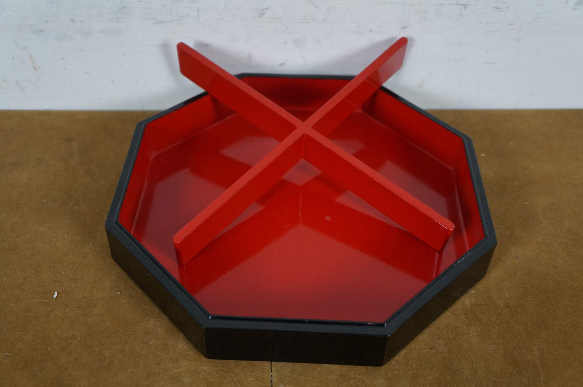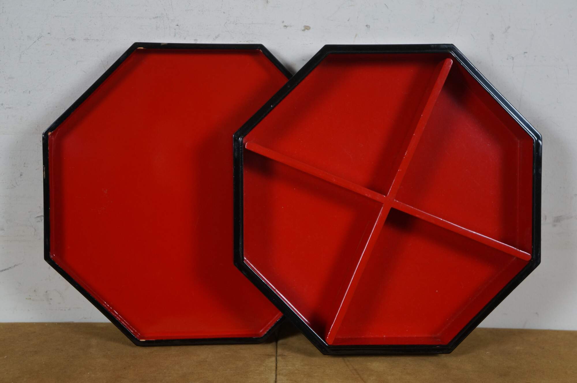 1970s octagonal red and black lacquerware bento or trinket box with floral mother of pearl design inlaid on the lid. Red interior with removable four section divider.