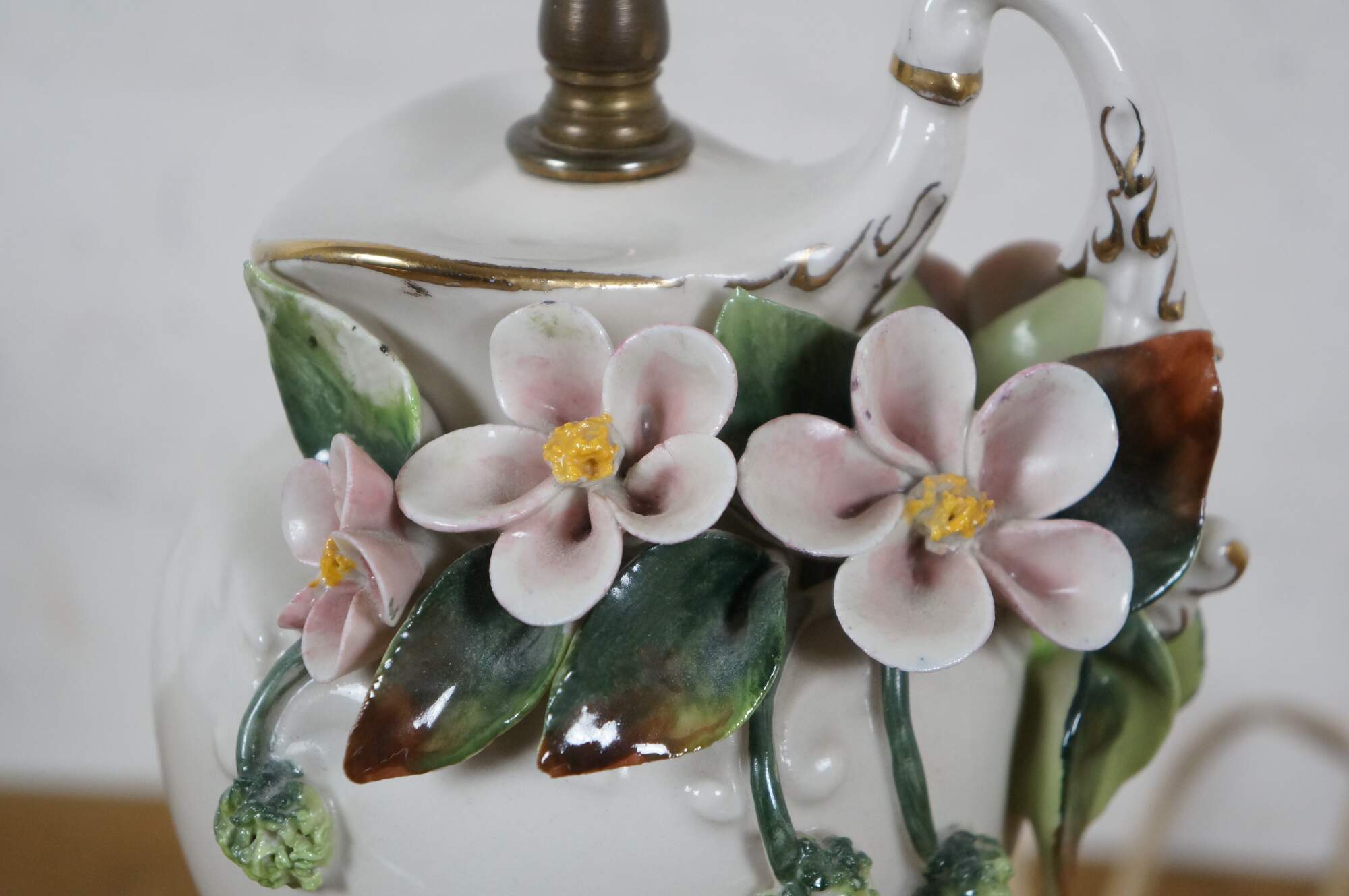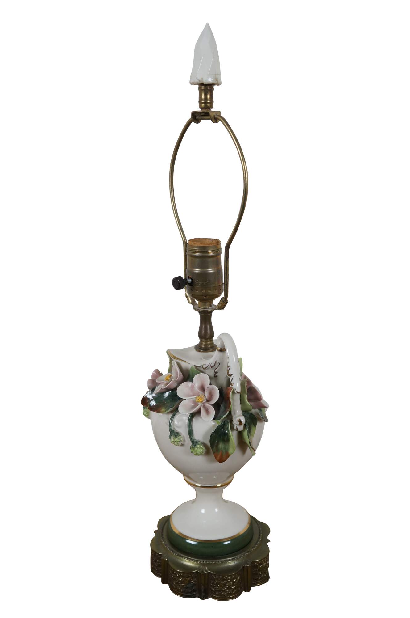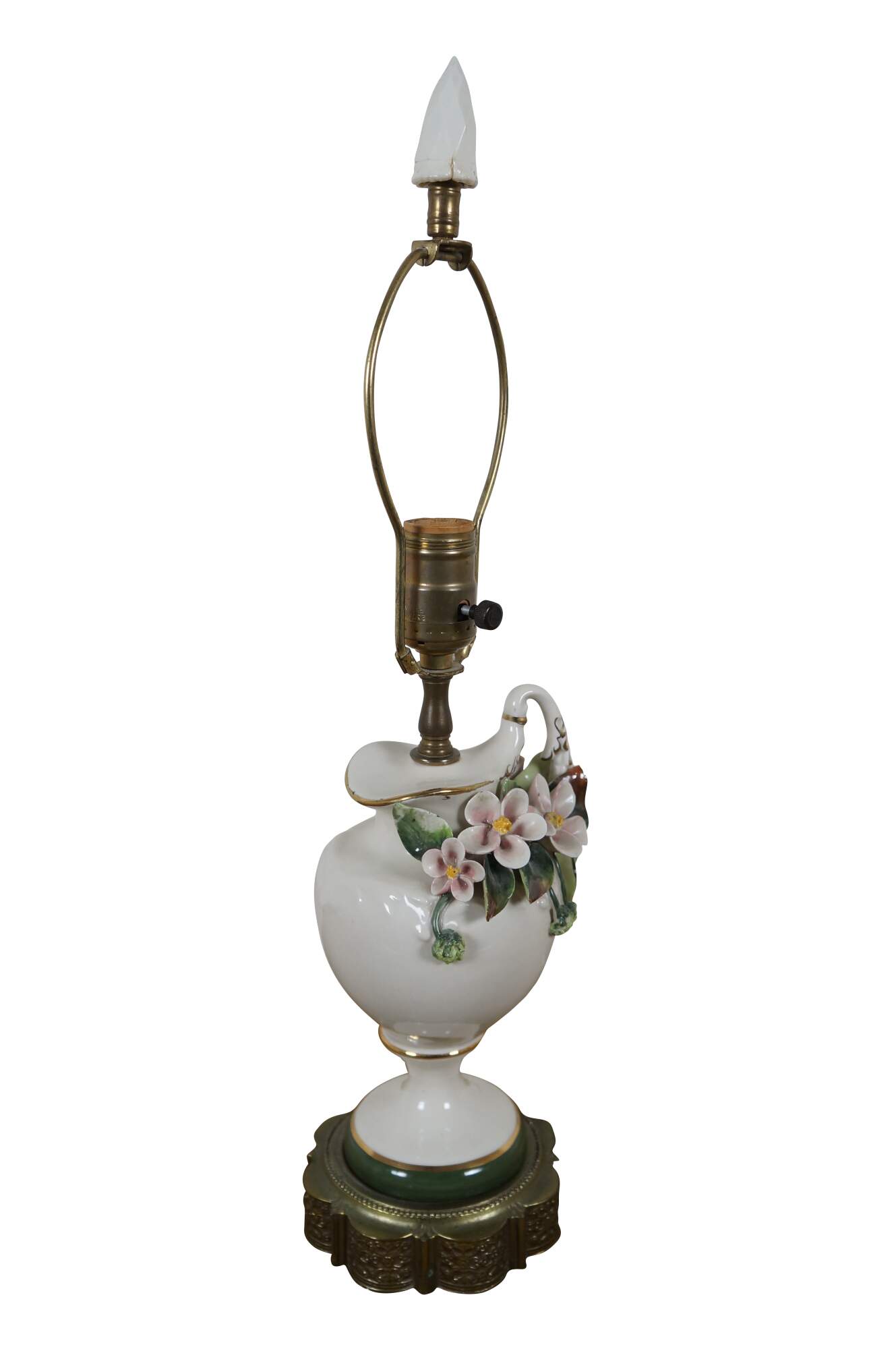 Mid to late 20th century porcelain table / budoir lamp by Cordey China Company. Scalloped repousse brass base topped with a lamp in the shape of a white porcelain pitcher, decorated with three dimensional flowers and leaves. Includes harp and faceted cone shaped white Bakelite finial.