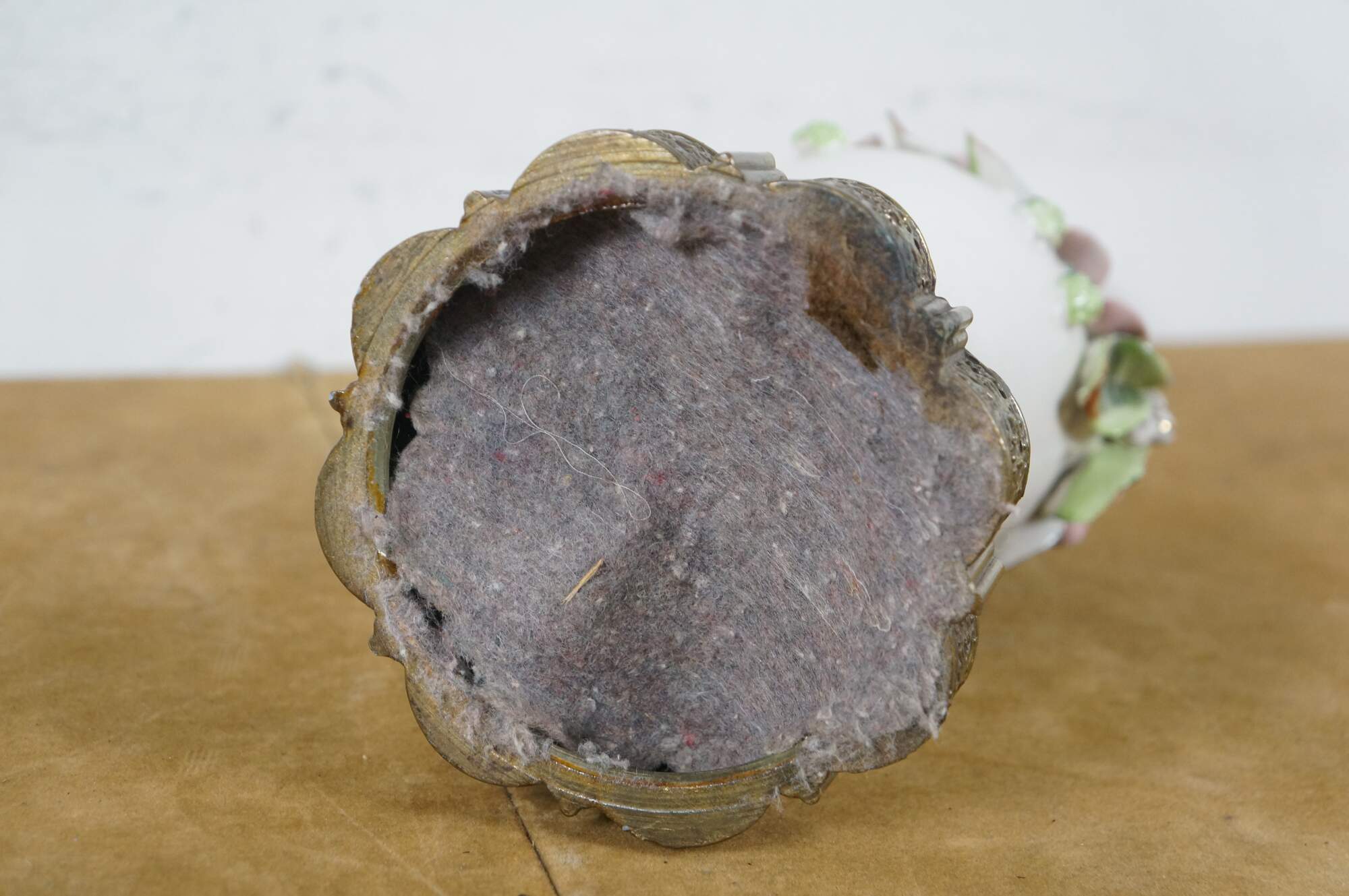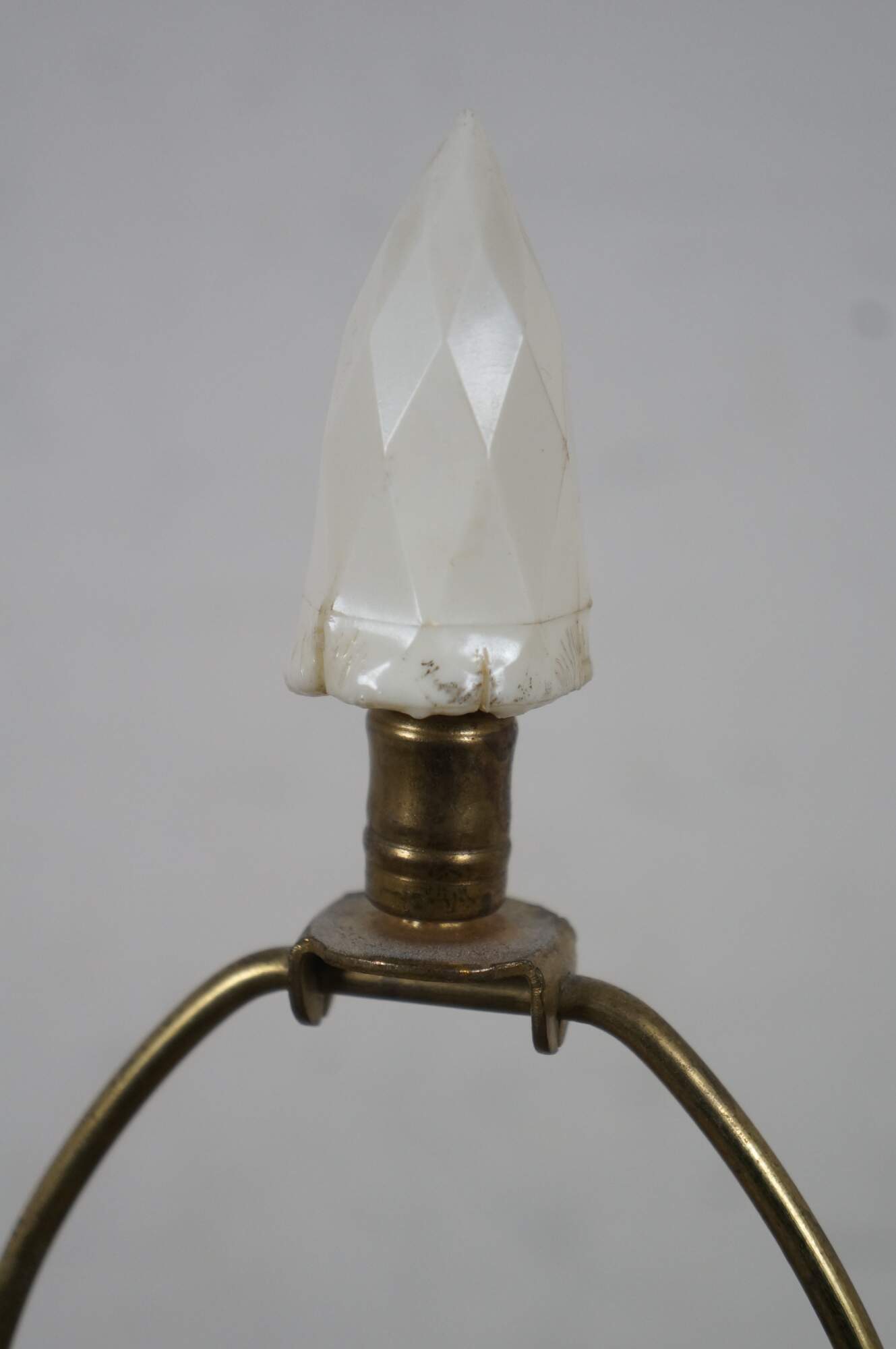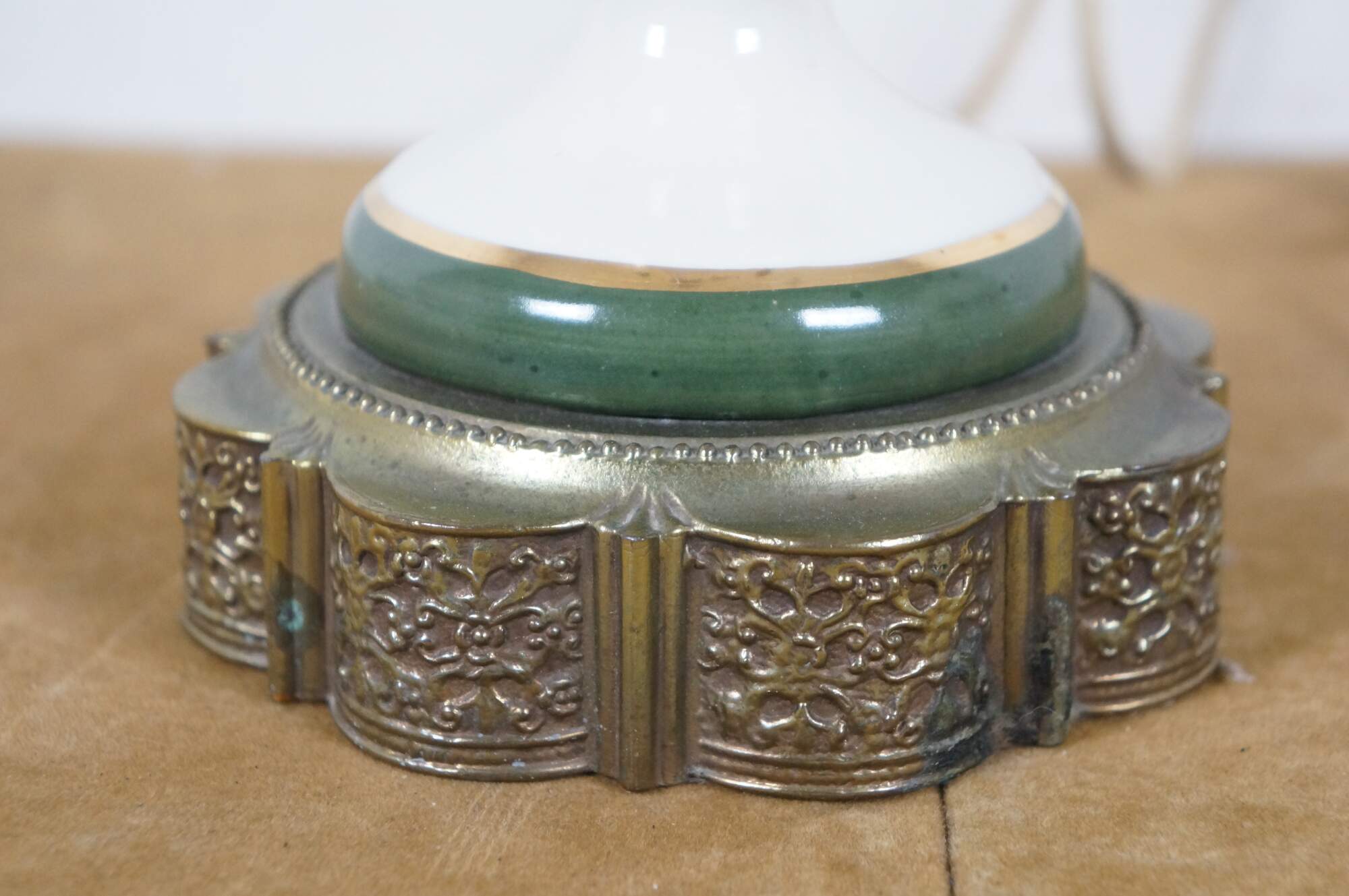 Mid to late 20th century porcelain table / budoir lamp by Cordey China Company. Scalloped repousse brass base topped with a lamp in the shape of a white porcelain pitcher, decorated with three dimensional flowers and leaves. Includes harp and faceted cone shaped white Bakelite finial.
