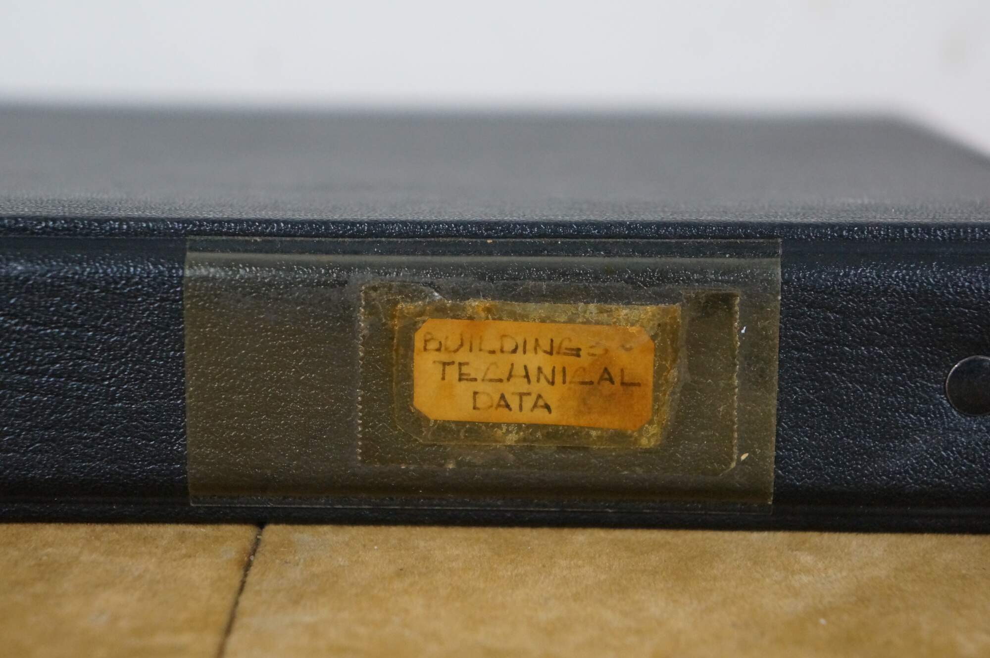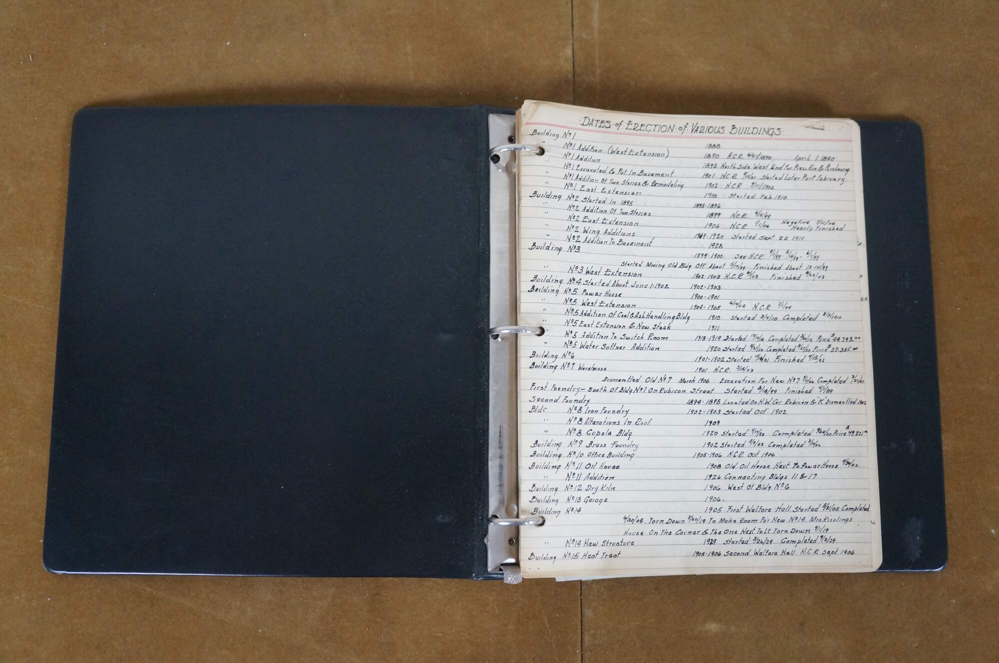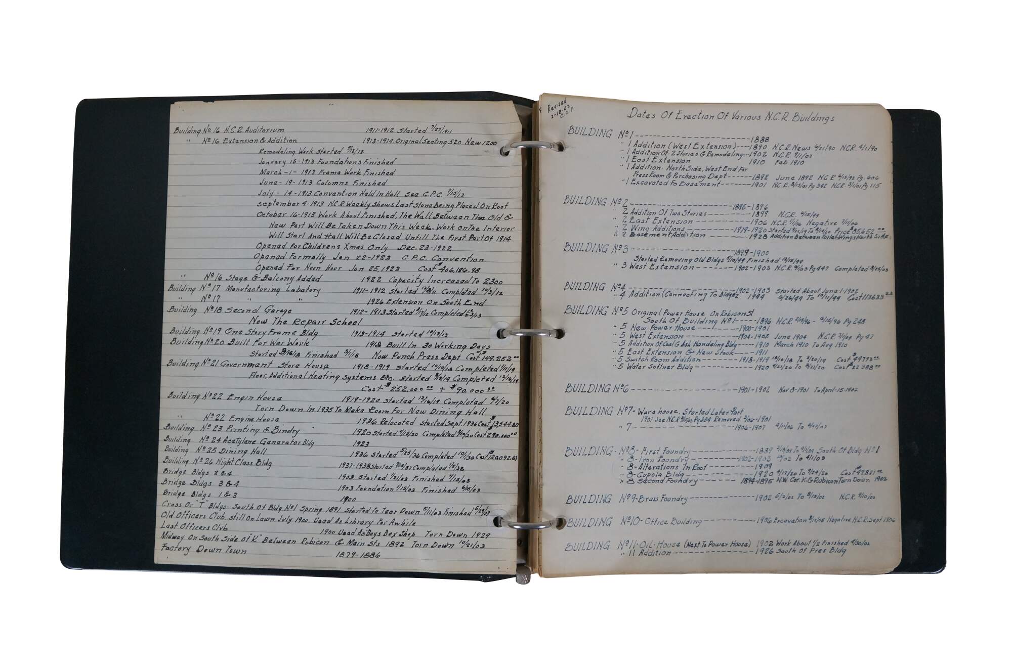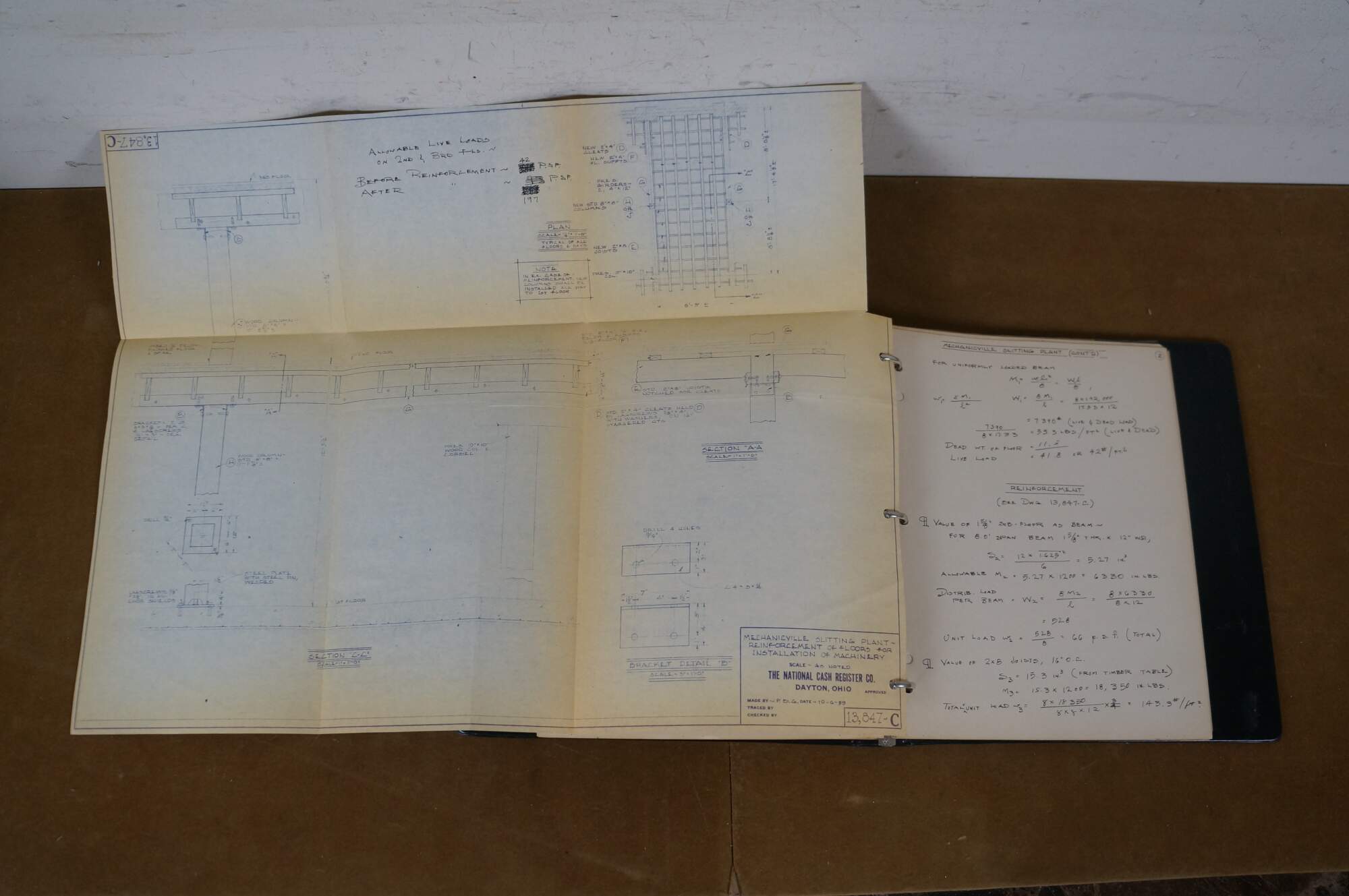Rare early to mid 20th century binder of Building Techinical Data from The National Cash Register Company, containing hand written notes tracking information such as the erection dates of NCR buildings, building values for insurance purposes, and technical notes and blue prints for structures and parts of structures. Black vinyl binder manufactured by The Inter-City Manufacturing Company of St Louis, MO.