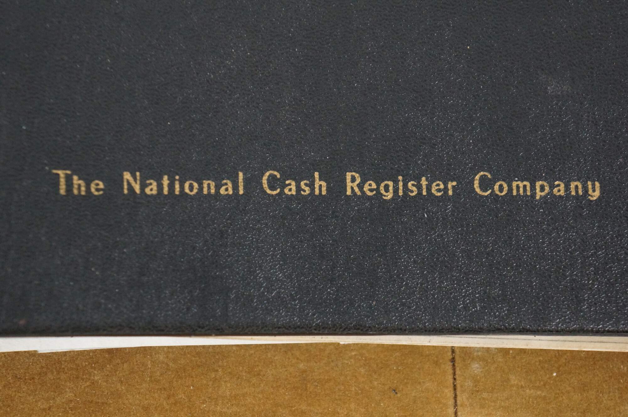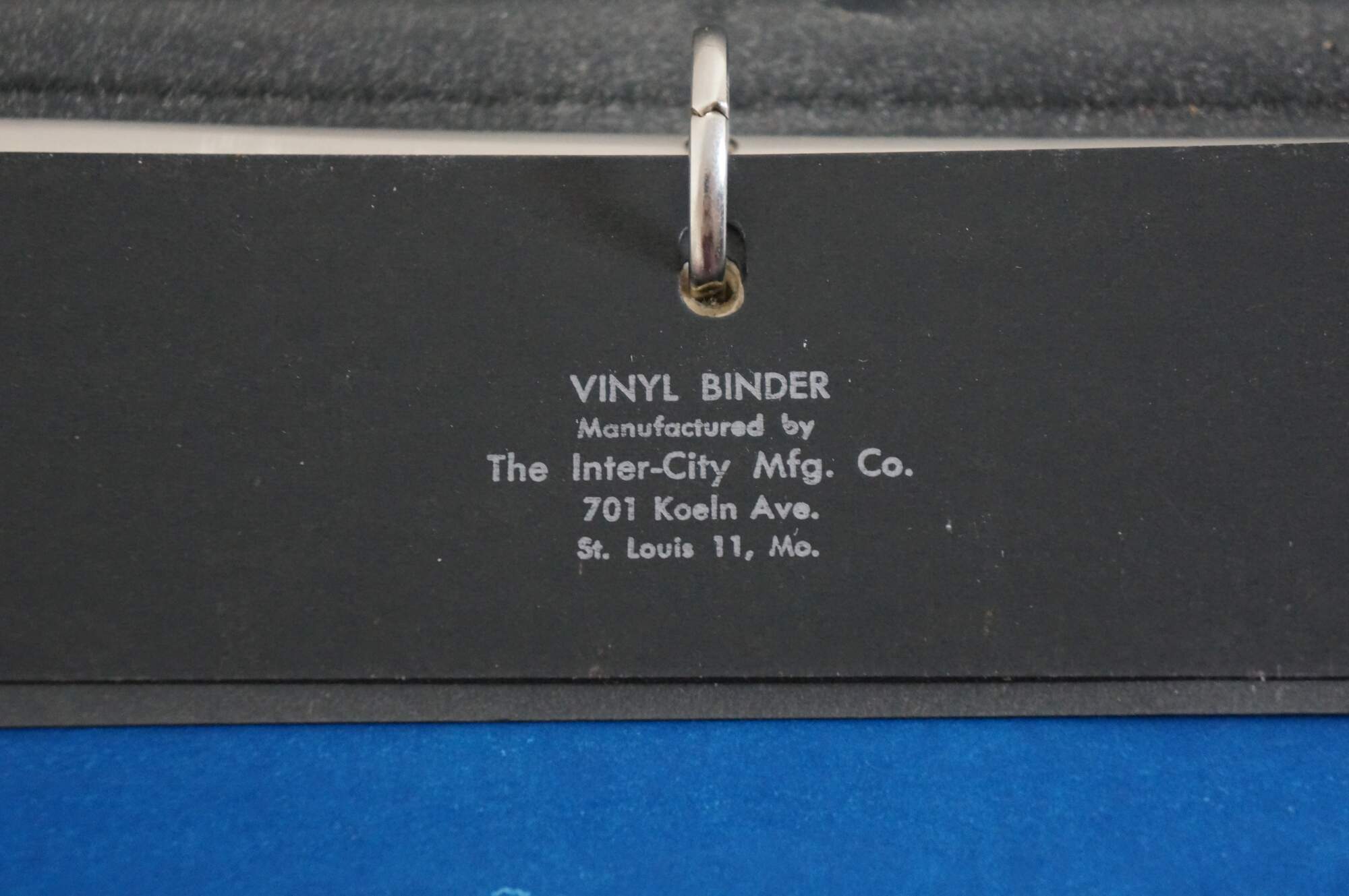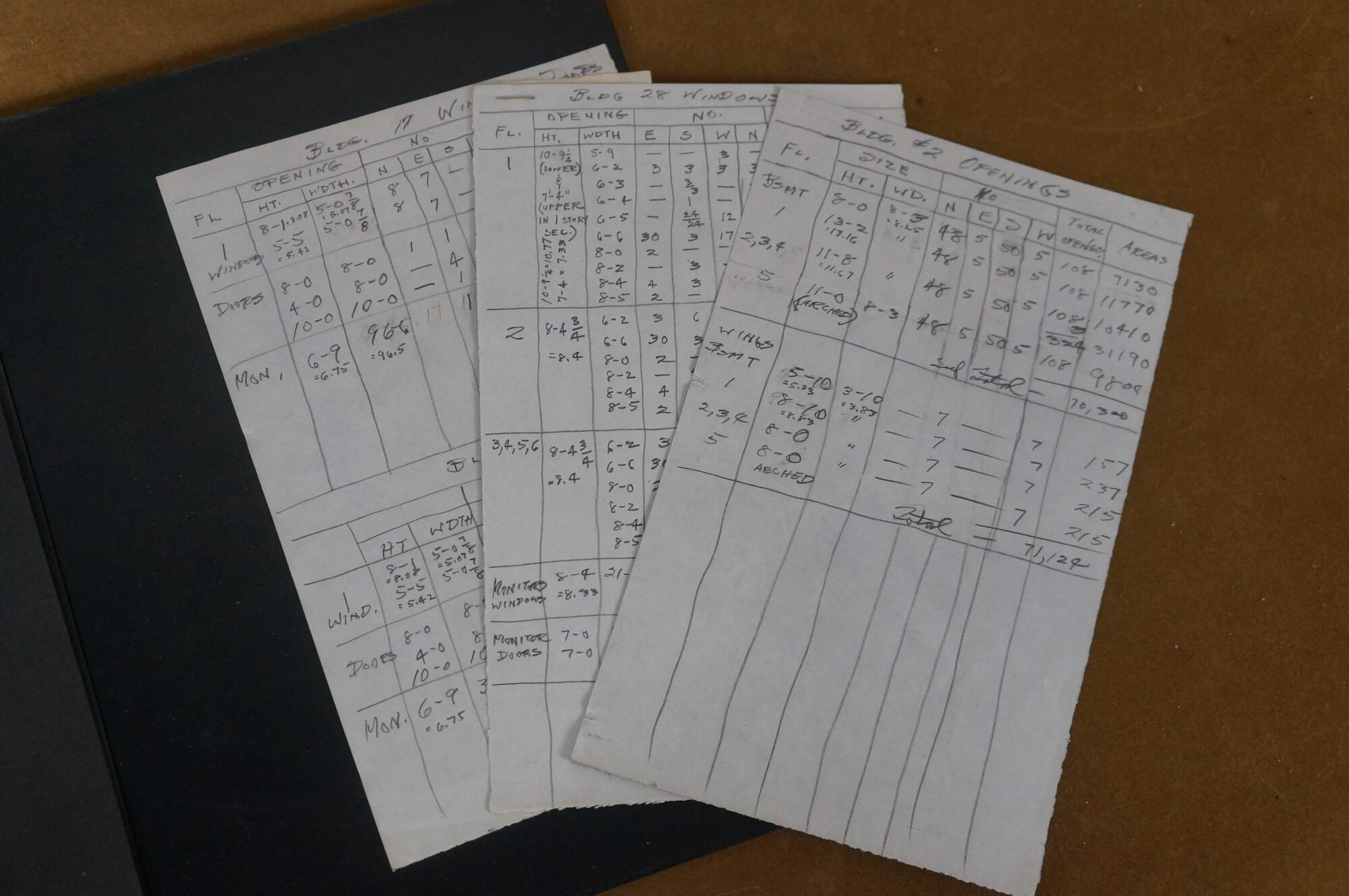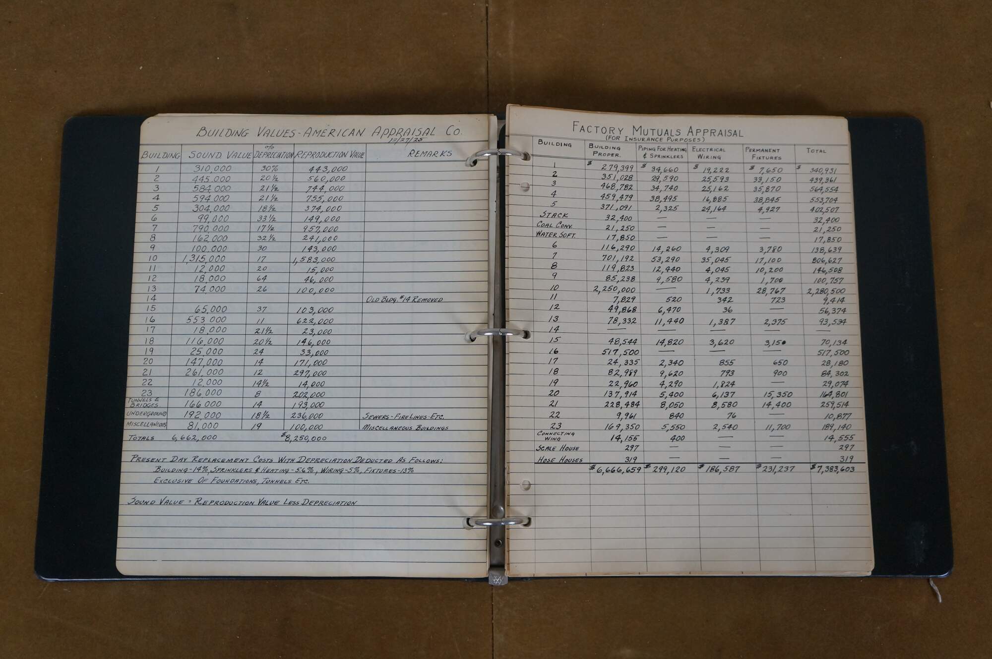 Rare early to mid 20th century binder of Building Techinical Data from The National Cash Register Company, containing hand written notes tracking information such as the erection dates of NCR buildings, building values for insurance purposes, and technical notes and blue prints for structures and parts of structures. Black vinyl binder manufactured by The Inter-City Manufacturing Company of St Louis, MO.