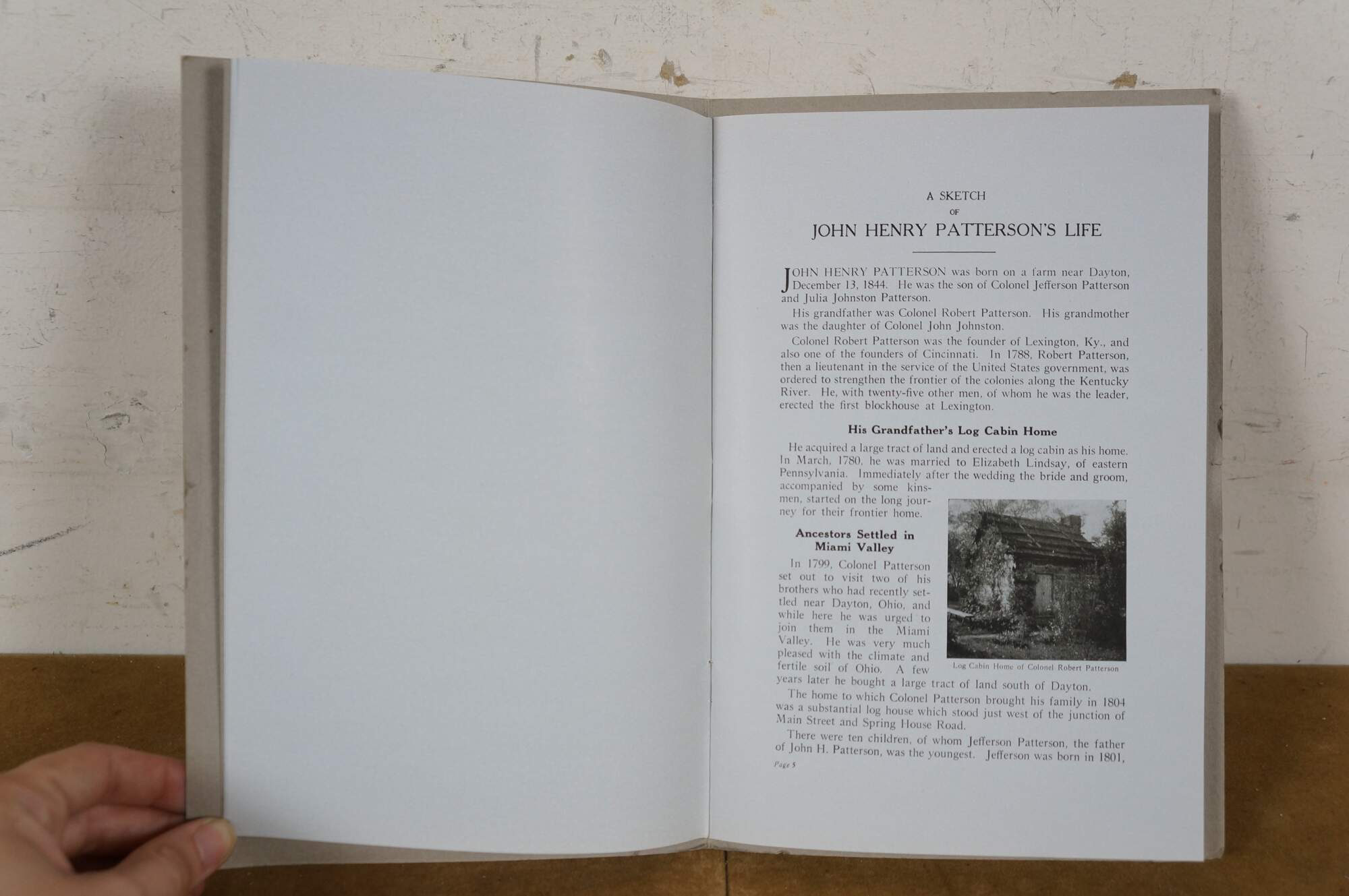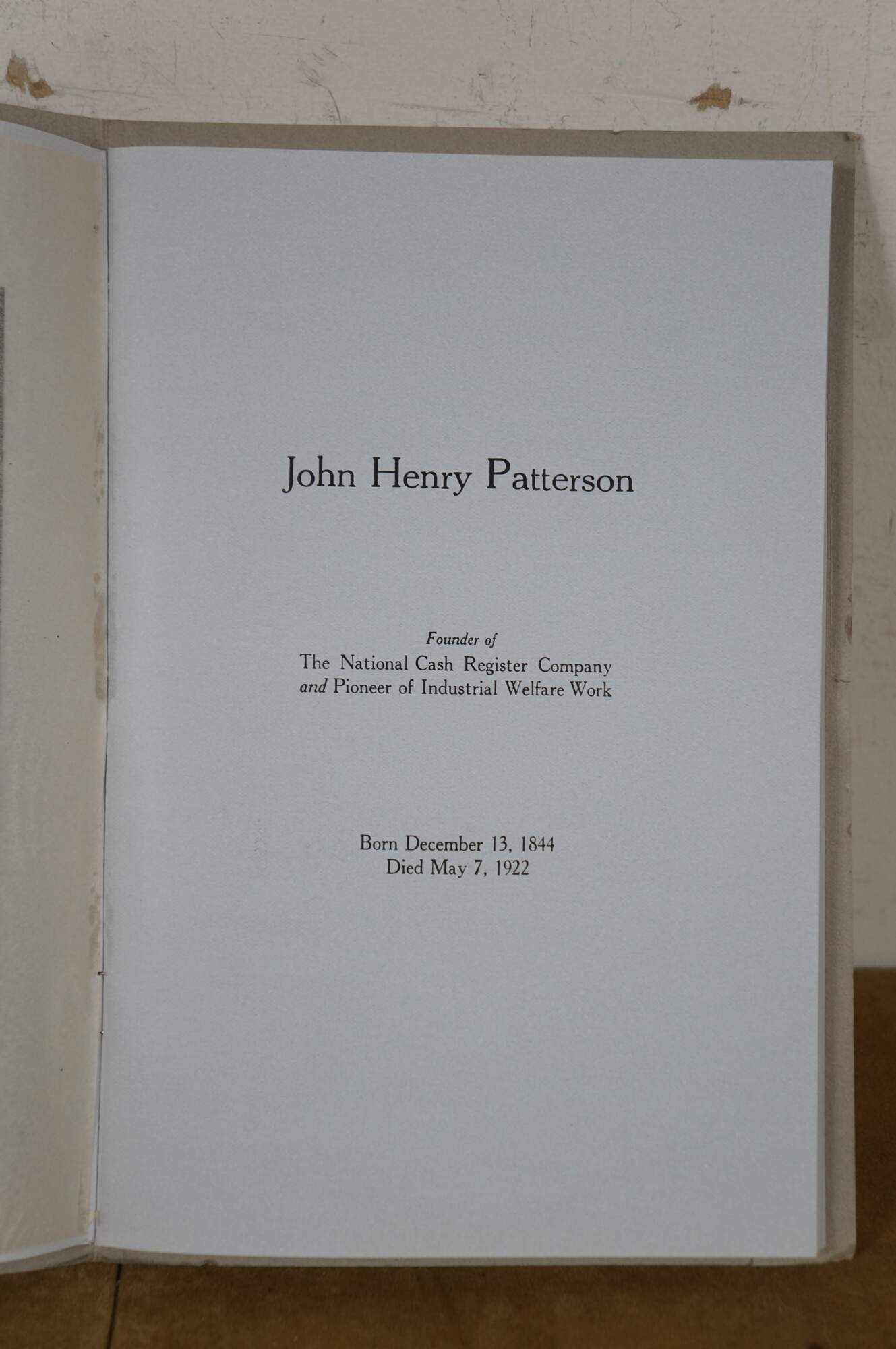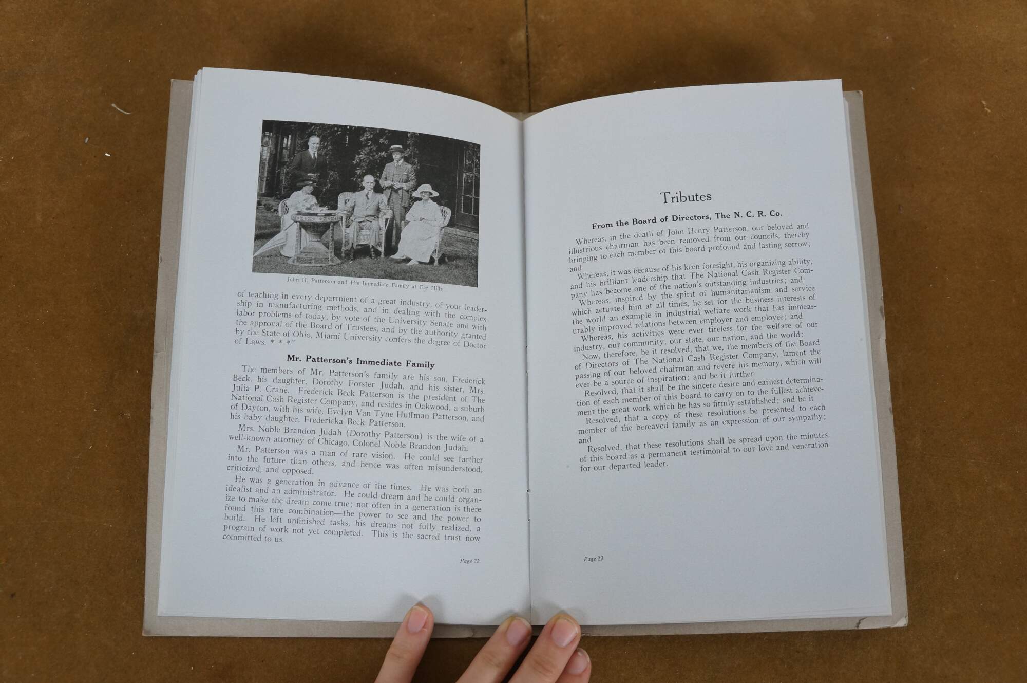 Antique booklet titled "In Memory of John Henry Patterson 1844-1922" published by the National Cash Register Company, commemorating the life of the NCR founder. Gray paper cover.