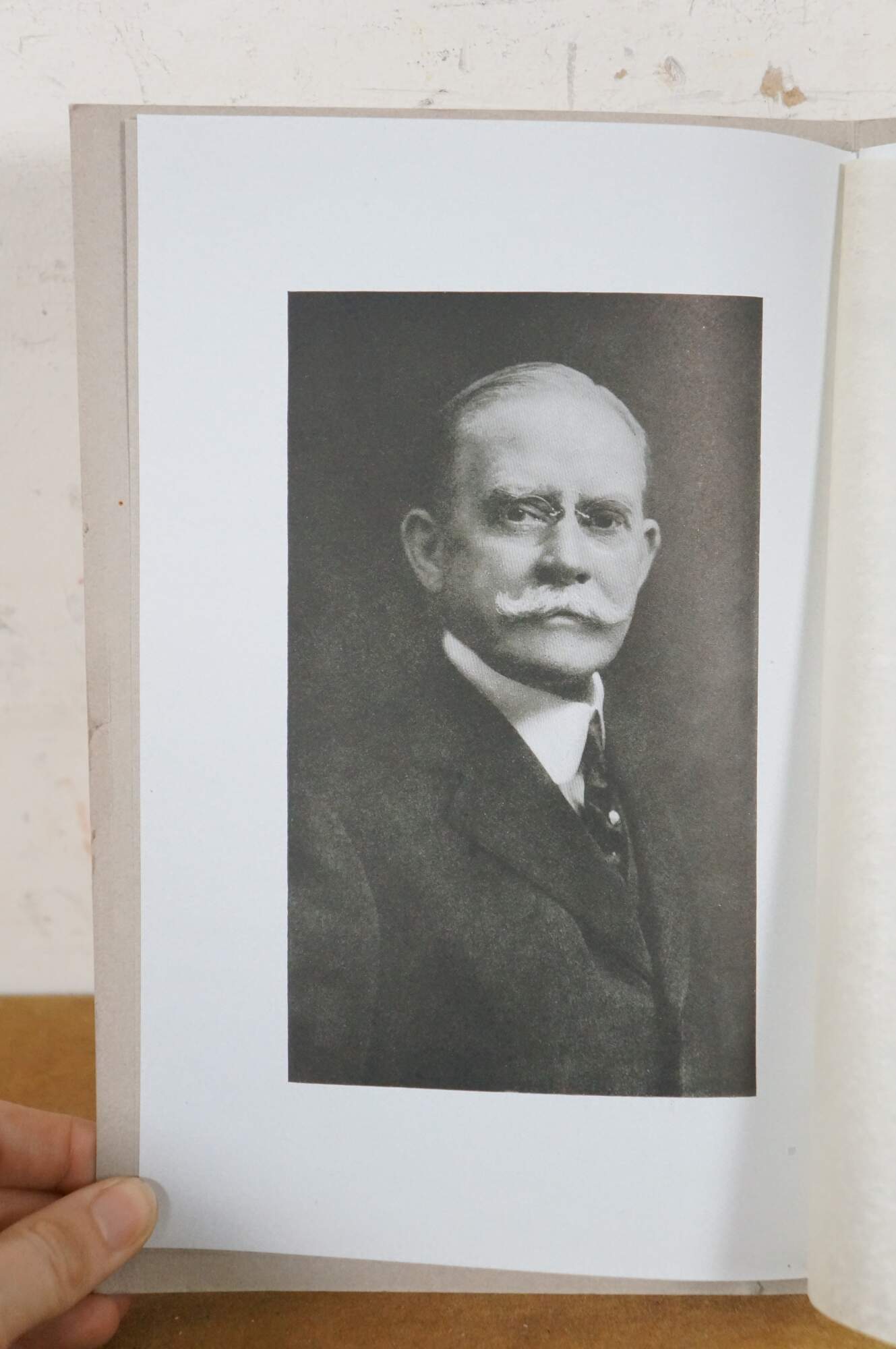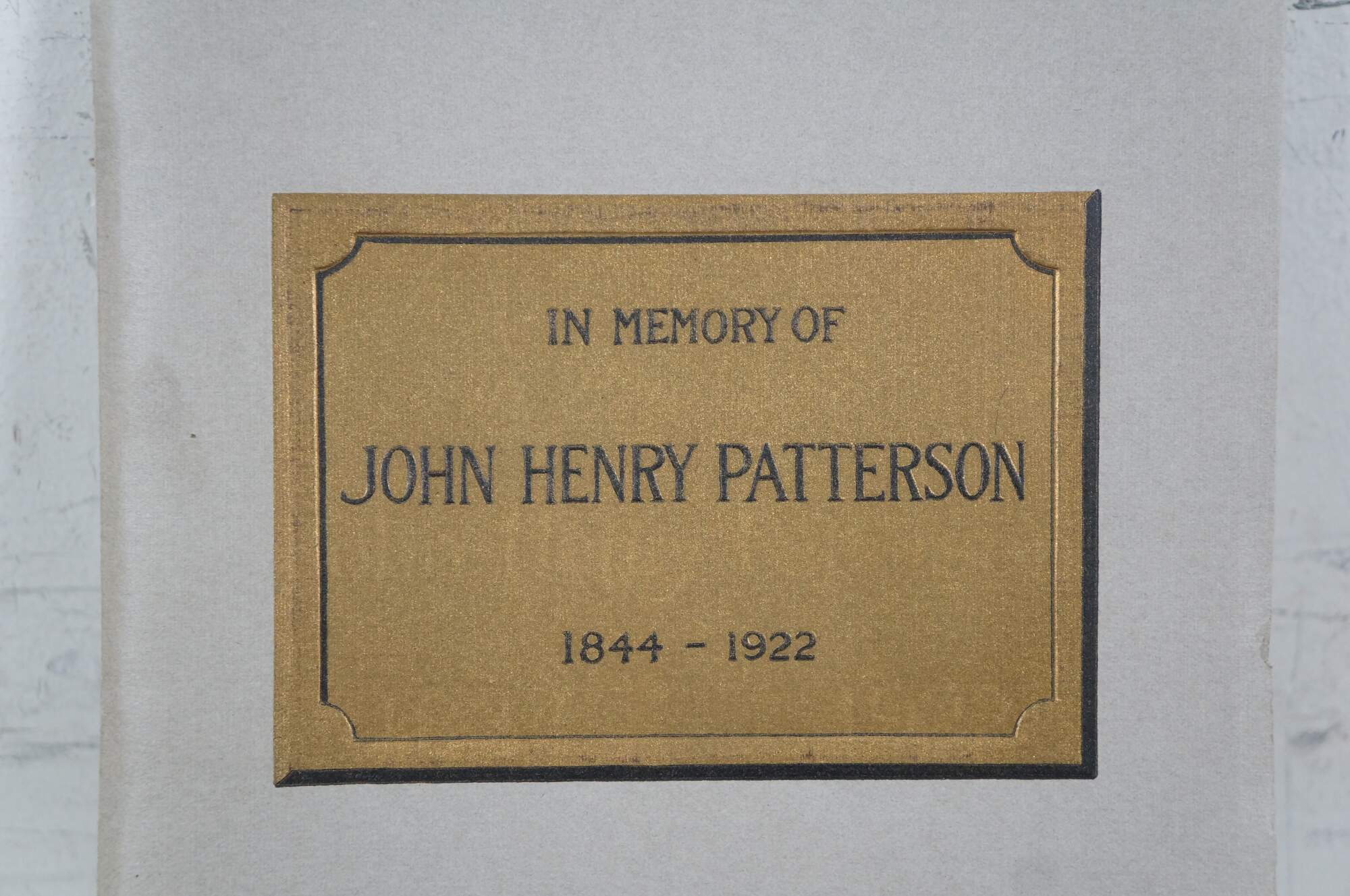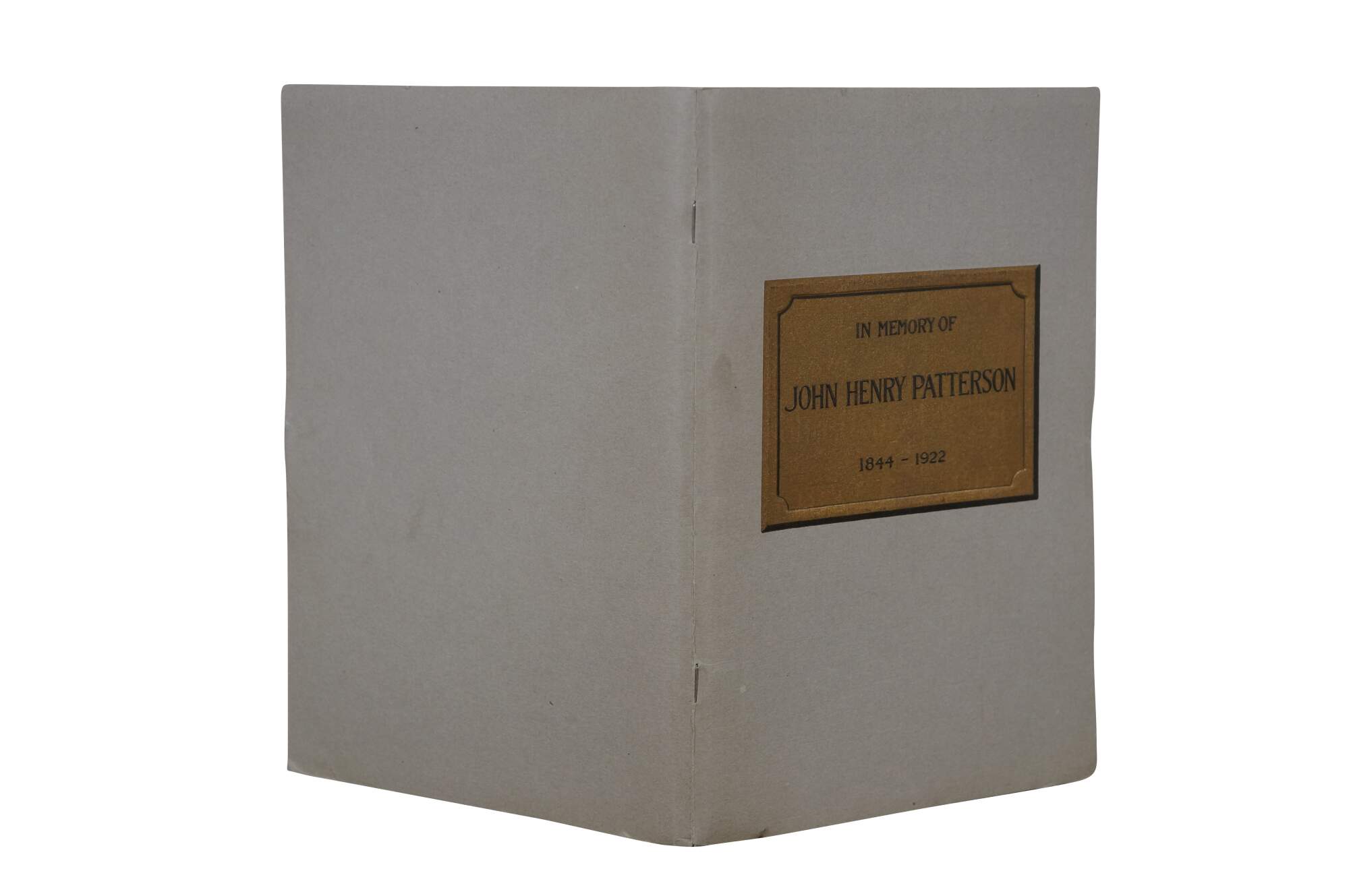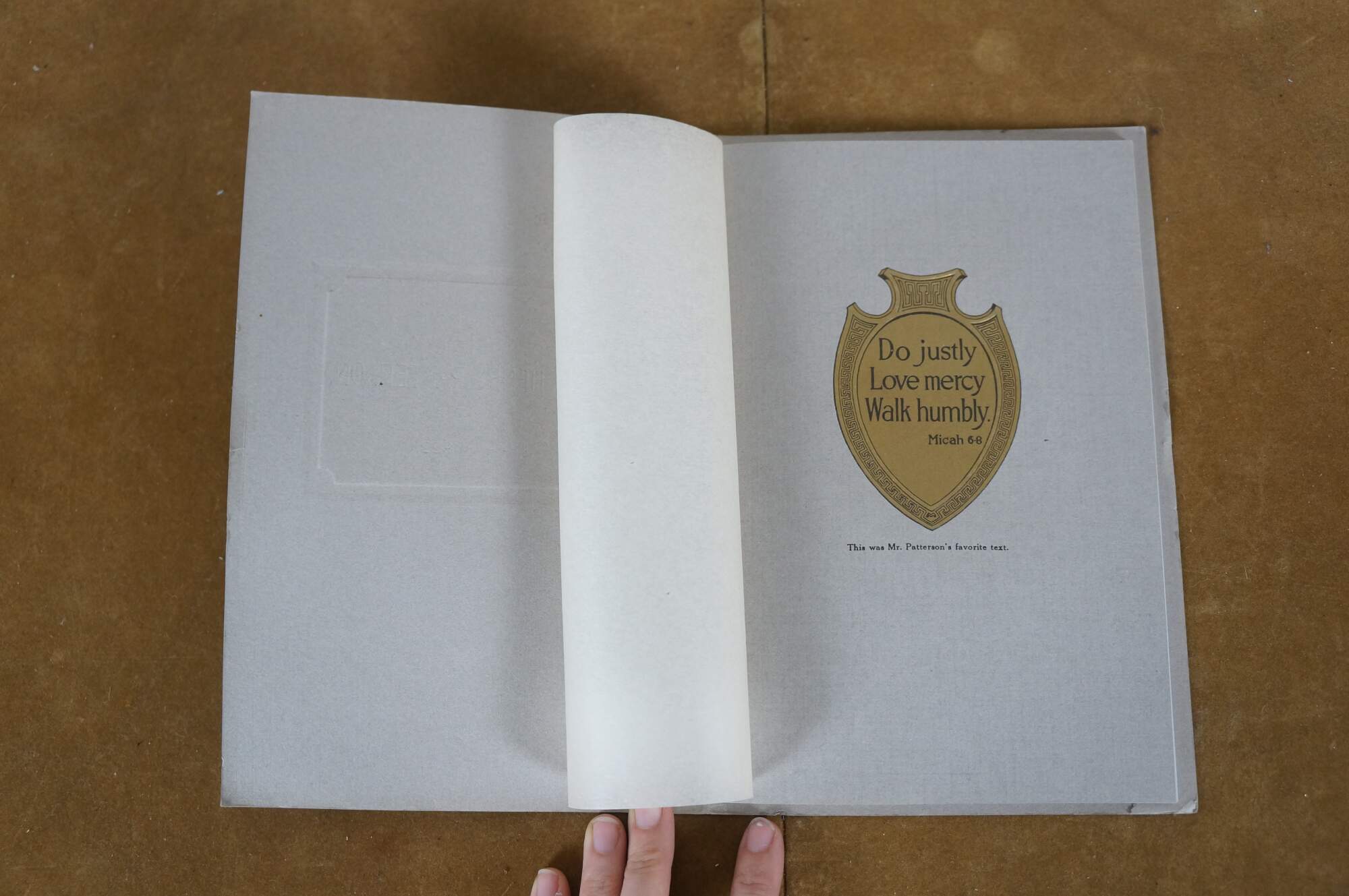 Antique booklet titled "In Memory of John Henry Patterson 1844-1922" published by the National Cash Register Company, commemorating the life of the NCR founder. Gray paper cover.