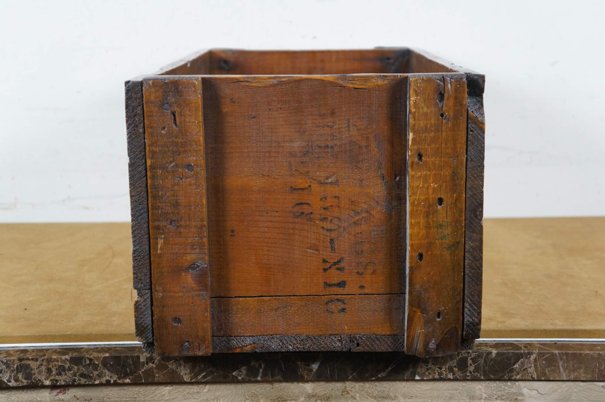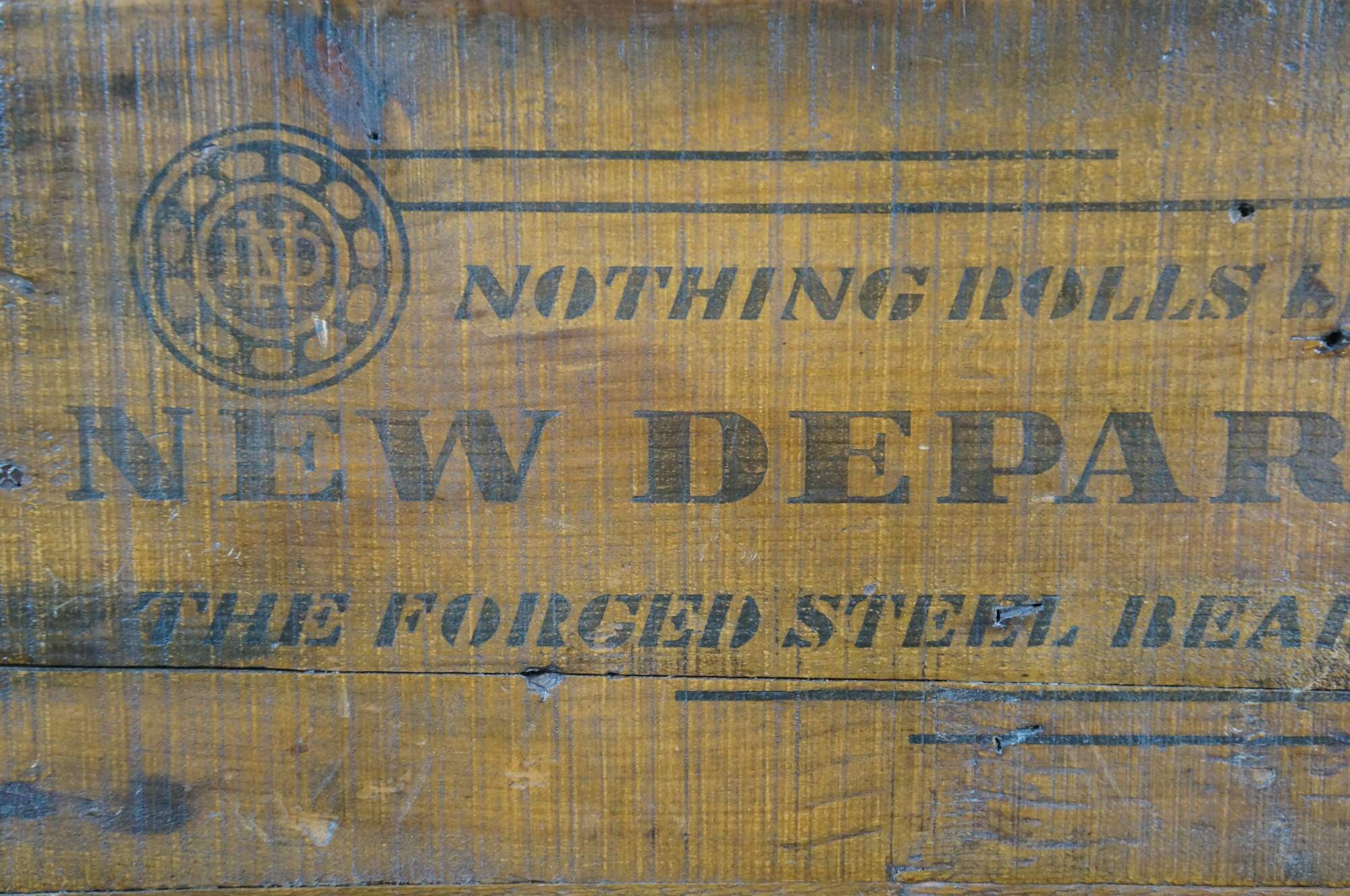 Vintage industrial wooden storage crate branded for New Departure - Forged Steel Ball Bearings. Open top / no lid.