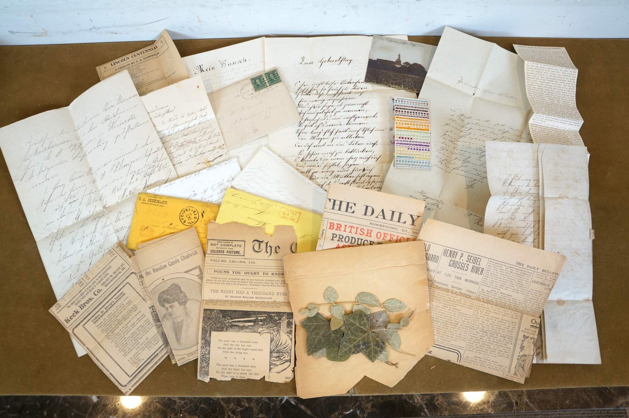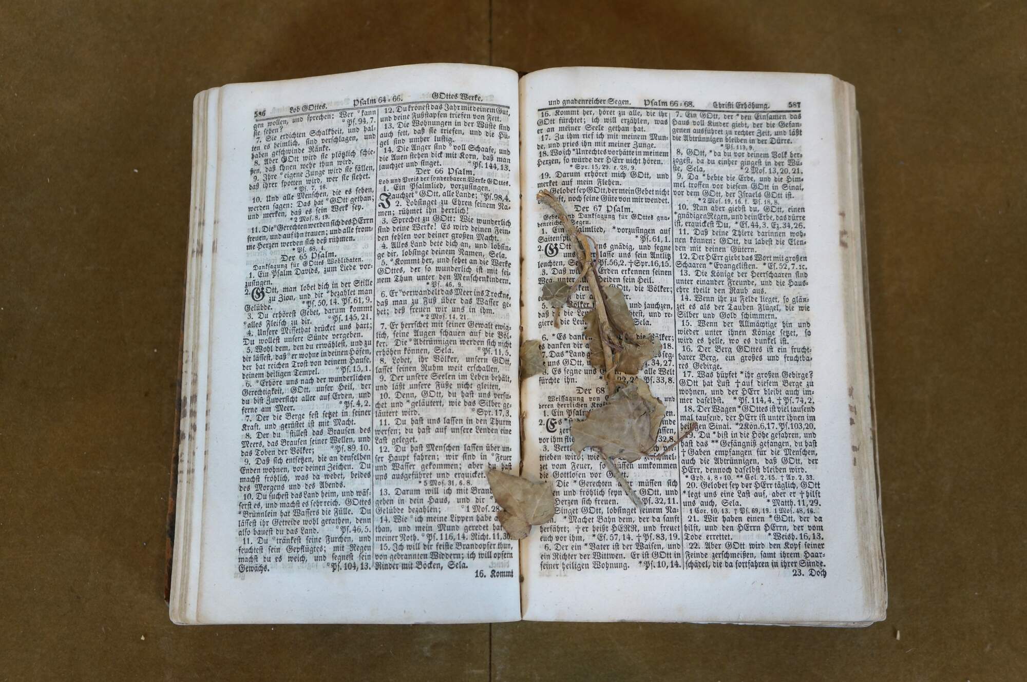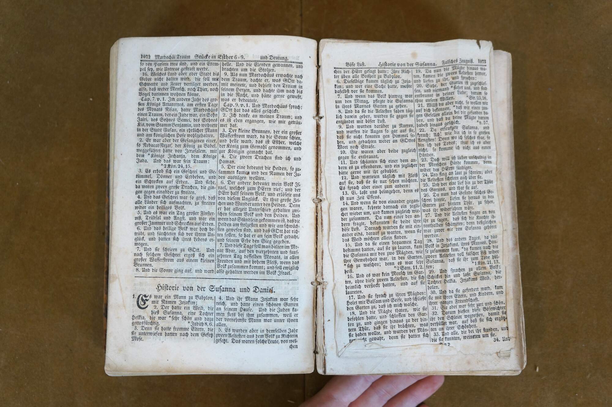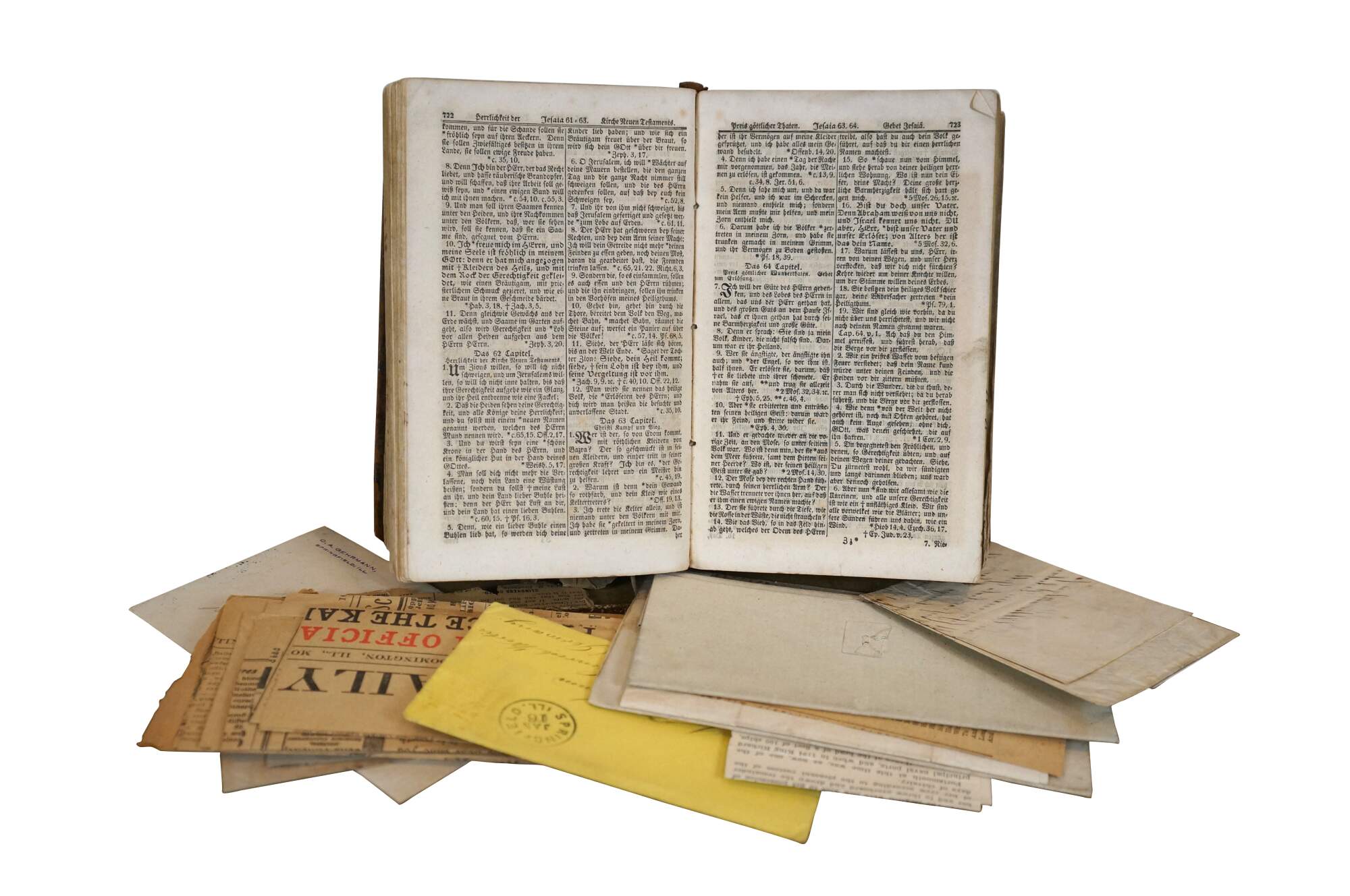 Antique mid 19th century Victorian era German language Luther Bible and ephemera attributed to CW Klemm. Includes a variety of ephemera including pressed plants, newspaper clippings, and 9 letters from 1845, 1855, 1857, 1861, 1862, 1872, 1873, and 1909 (see translations below). Die Bibel oder Die ganze Heilige Schriff des alten und neuen Testaments nach Dr. Martin Luthers Ueberfekung (The Bible or the Whole Holy Scripture of the Old and New Testaments according to Dr. Martin Luther's Translation) / Siebenzehnte Eisen - Stereotyp - Uusgabe (Seventeenth Iron - Sterotype - Edition) / Nordhausen / Drud und Berlag von Z.G. Muller (Printed and Published by Z.G. Muller) / 1852. Hard back / leather bound cardboard cover.
