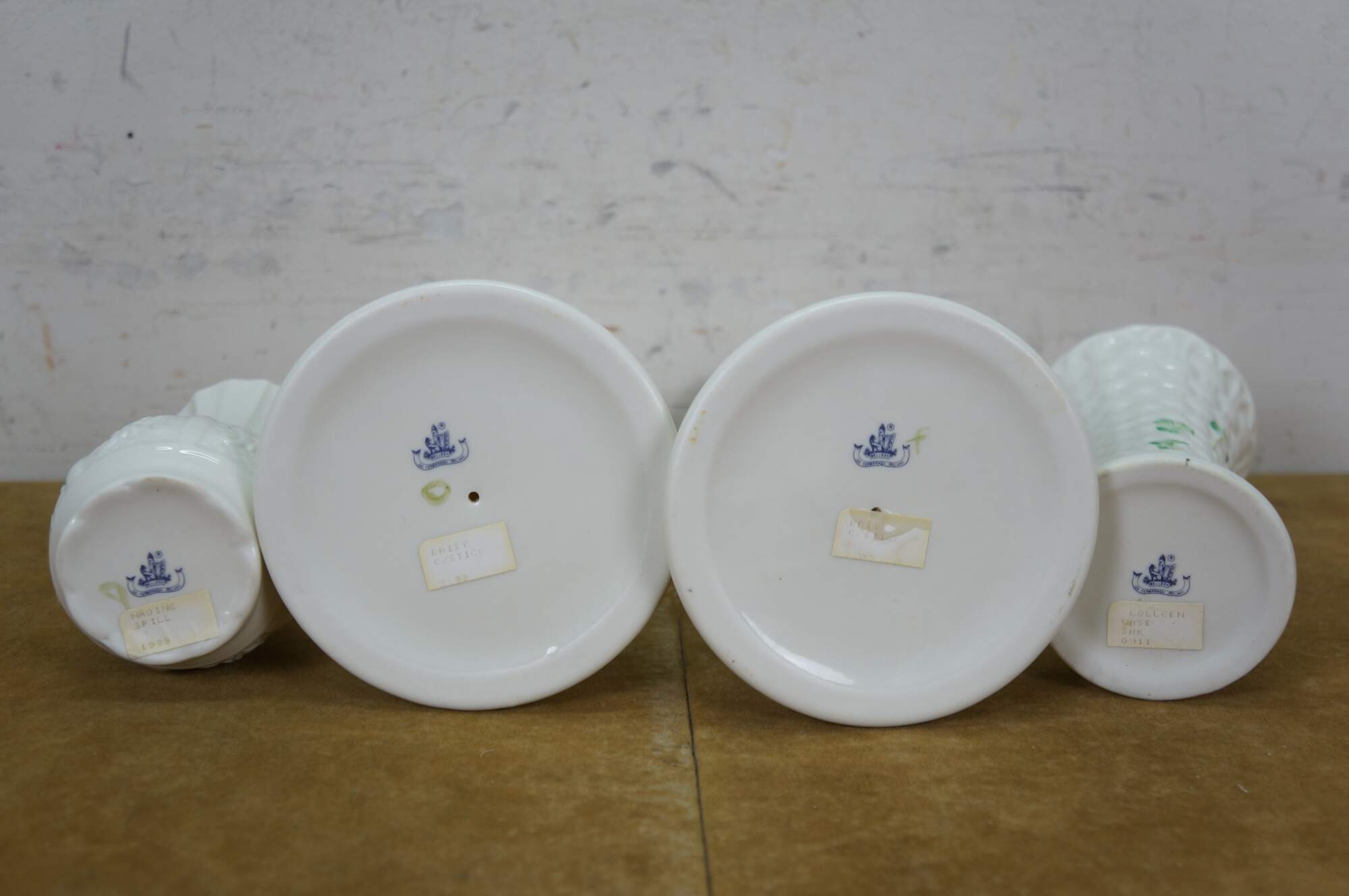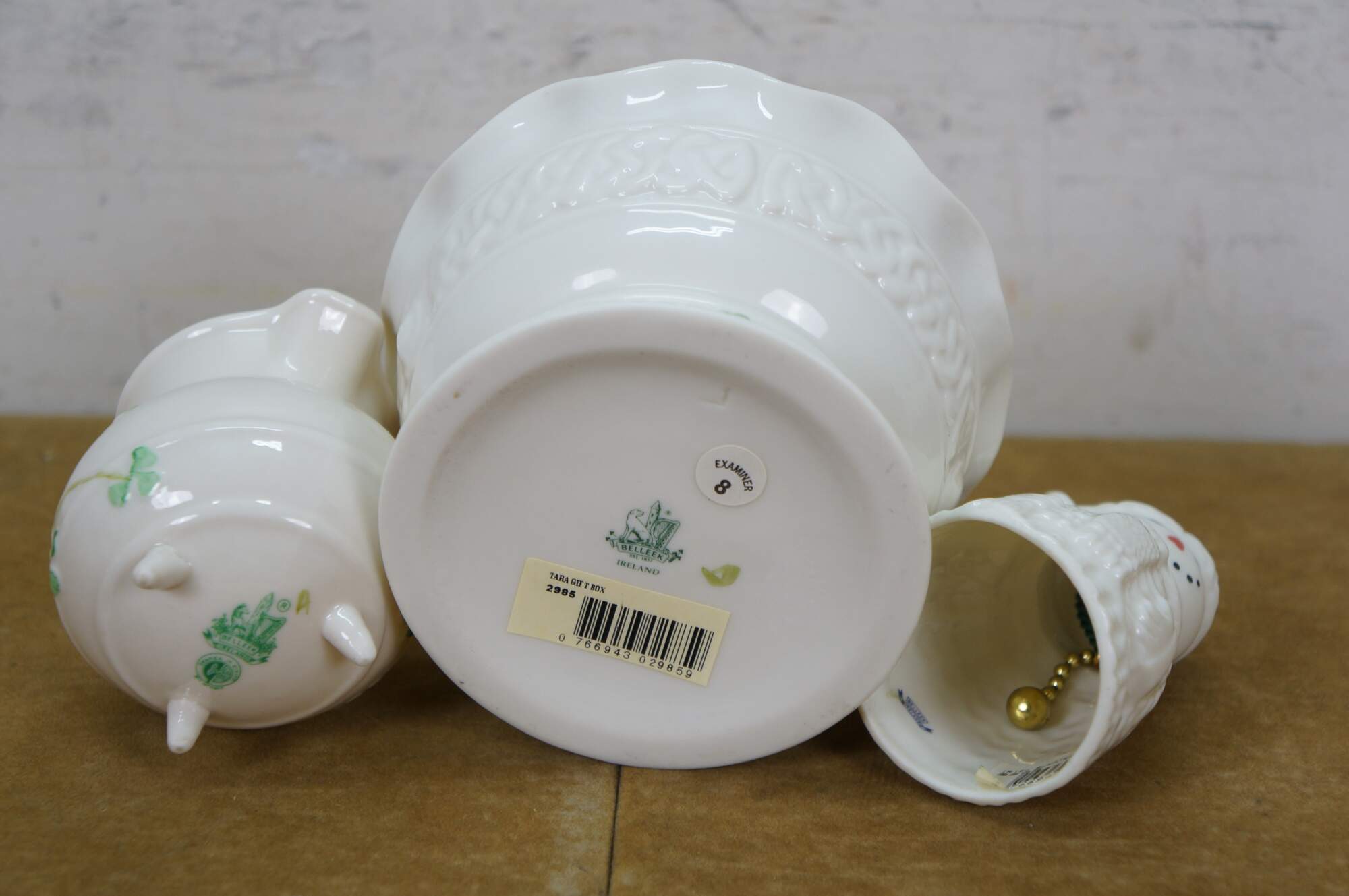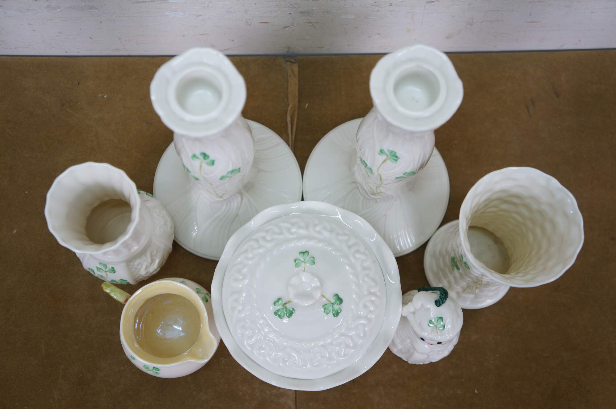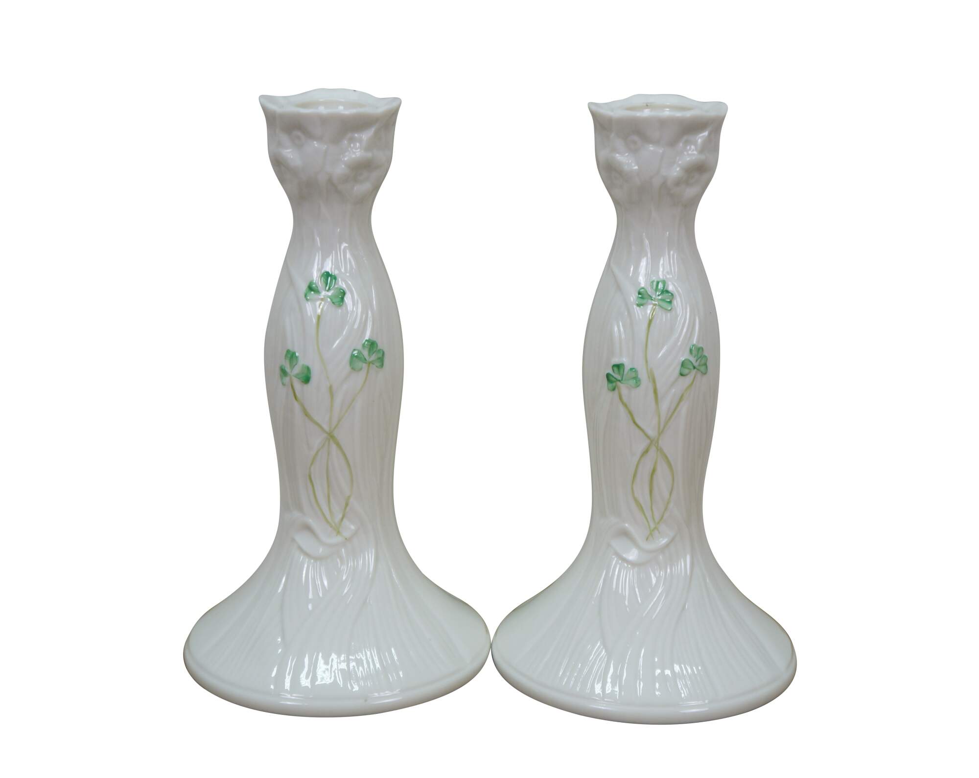 Vintage 7 piece set of Belleek white porcelain with Celtic knotwork, basketweave and hand painted shamrock clovers. Includes: 2 Daisy Candlesticks, Nadine Spill Vase, Irish Sweater Snowman Bell, Colleen Vase, Tara Gift Box, and shamrock creamer.