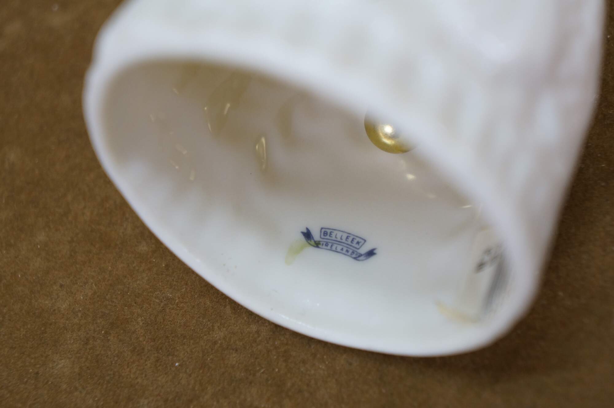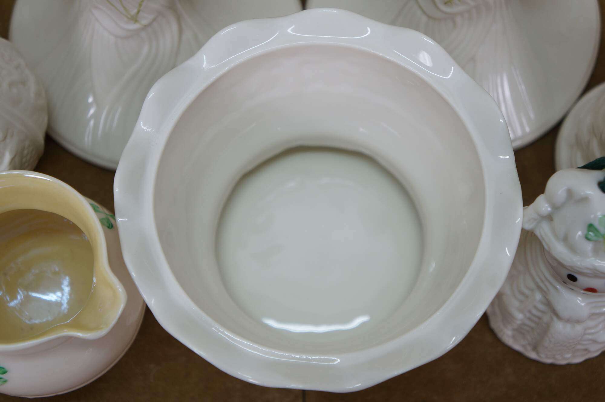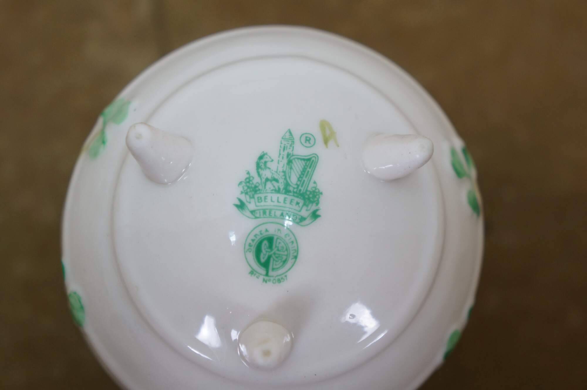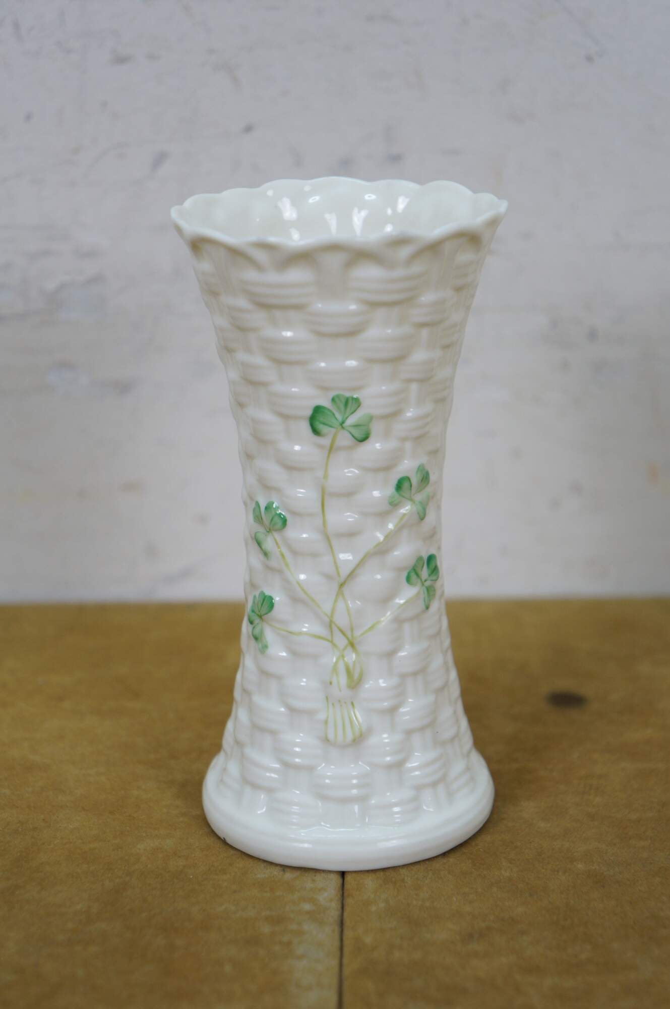 Vintage 7 piece set of Belleek white porcelain with Celtic knotwork, basketweave and hand painted shamrock clovers. Includes: 2 Daisy Candlesticks, Nadine Spill Vase, Irish Sweater Snowman Bell, Colleen Vase, Tara Gift Box, and shamrock creamer.
