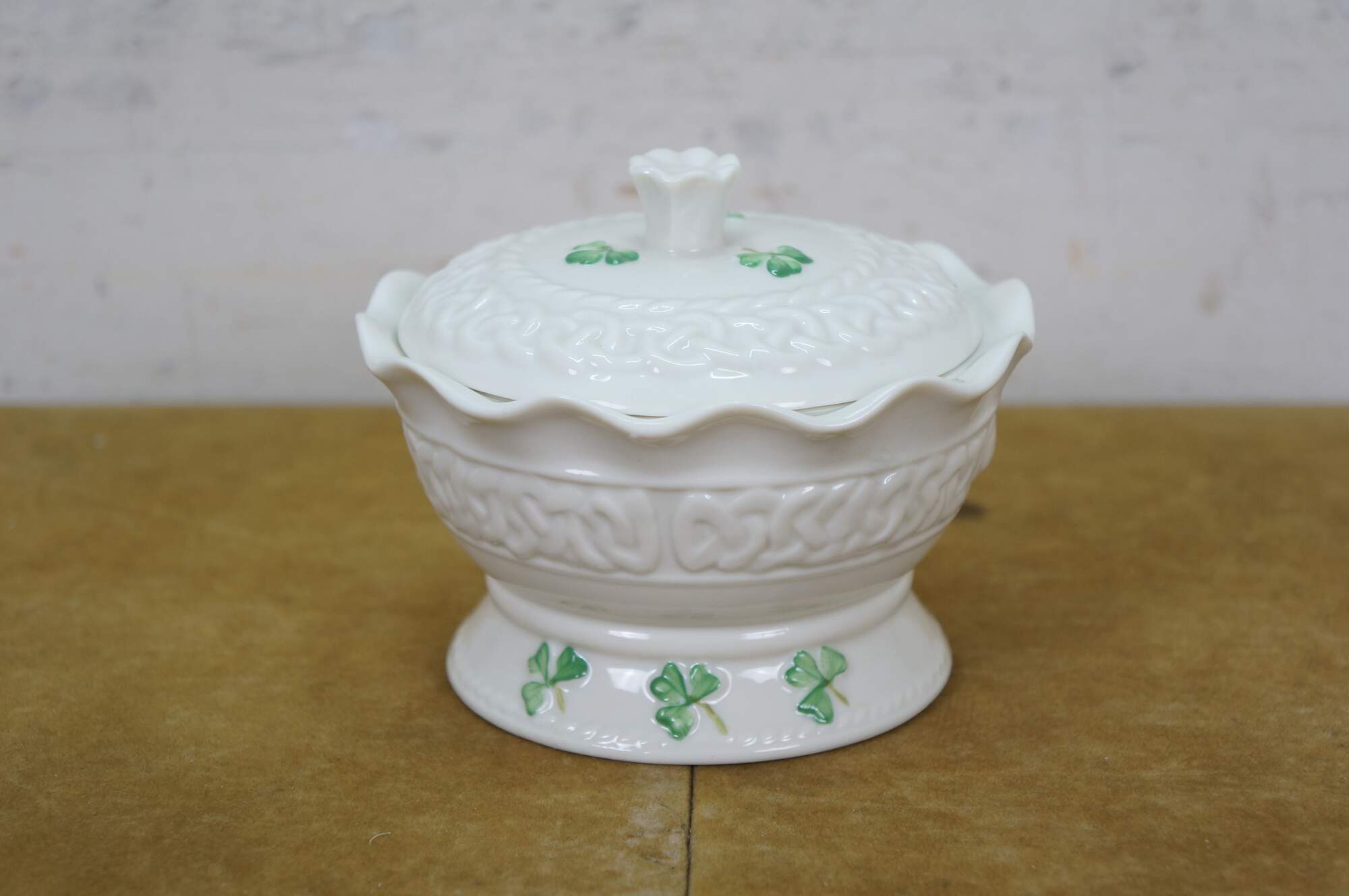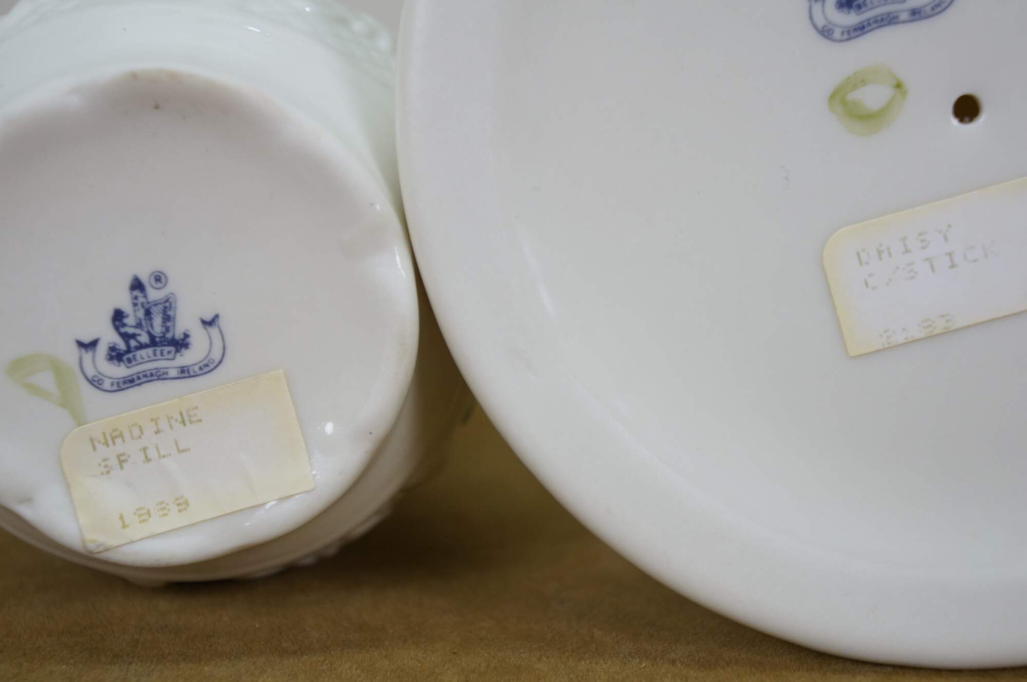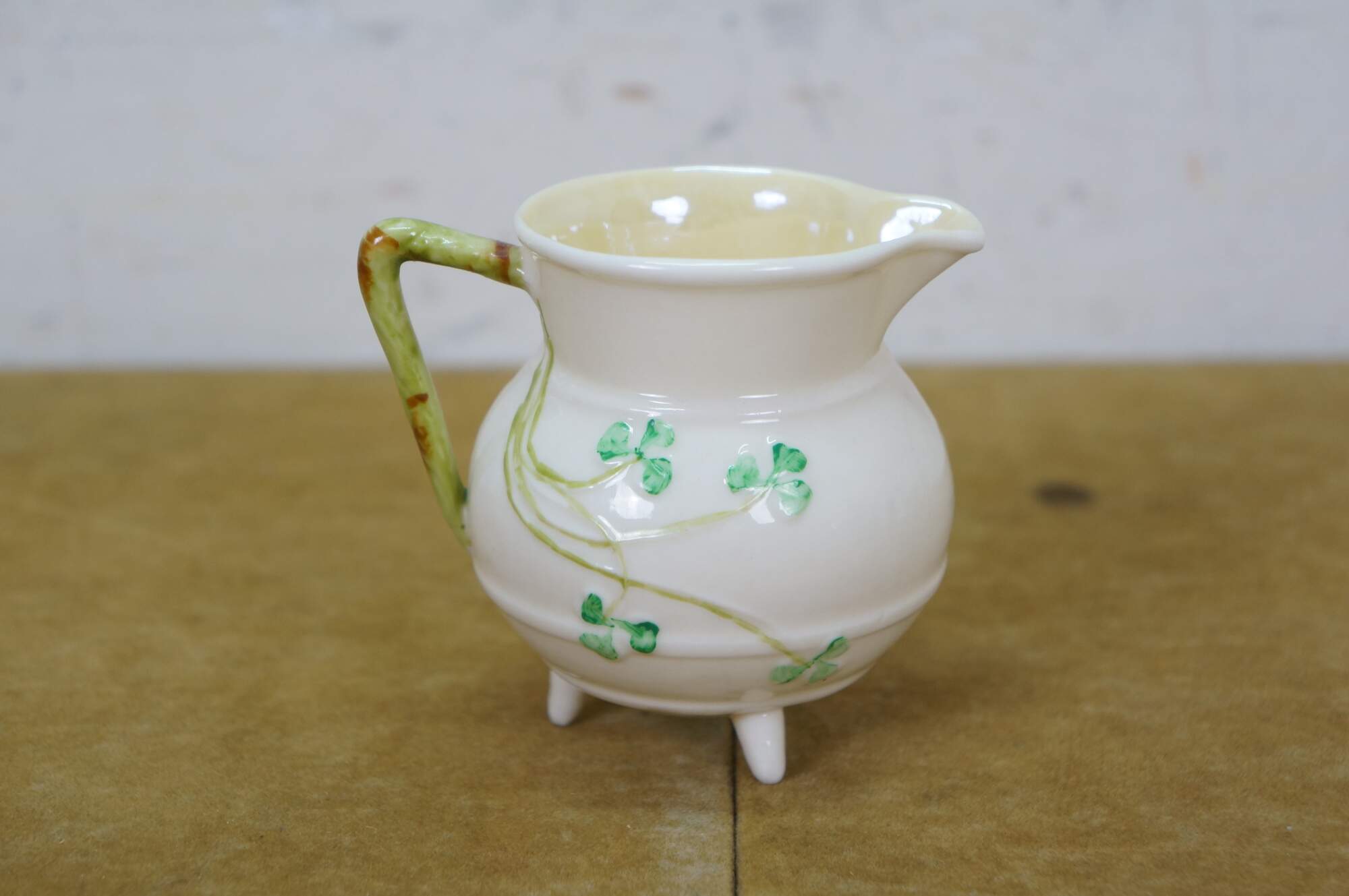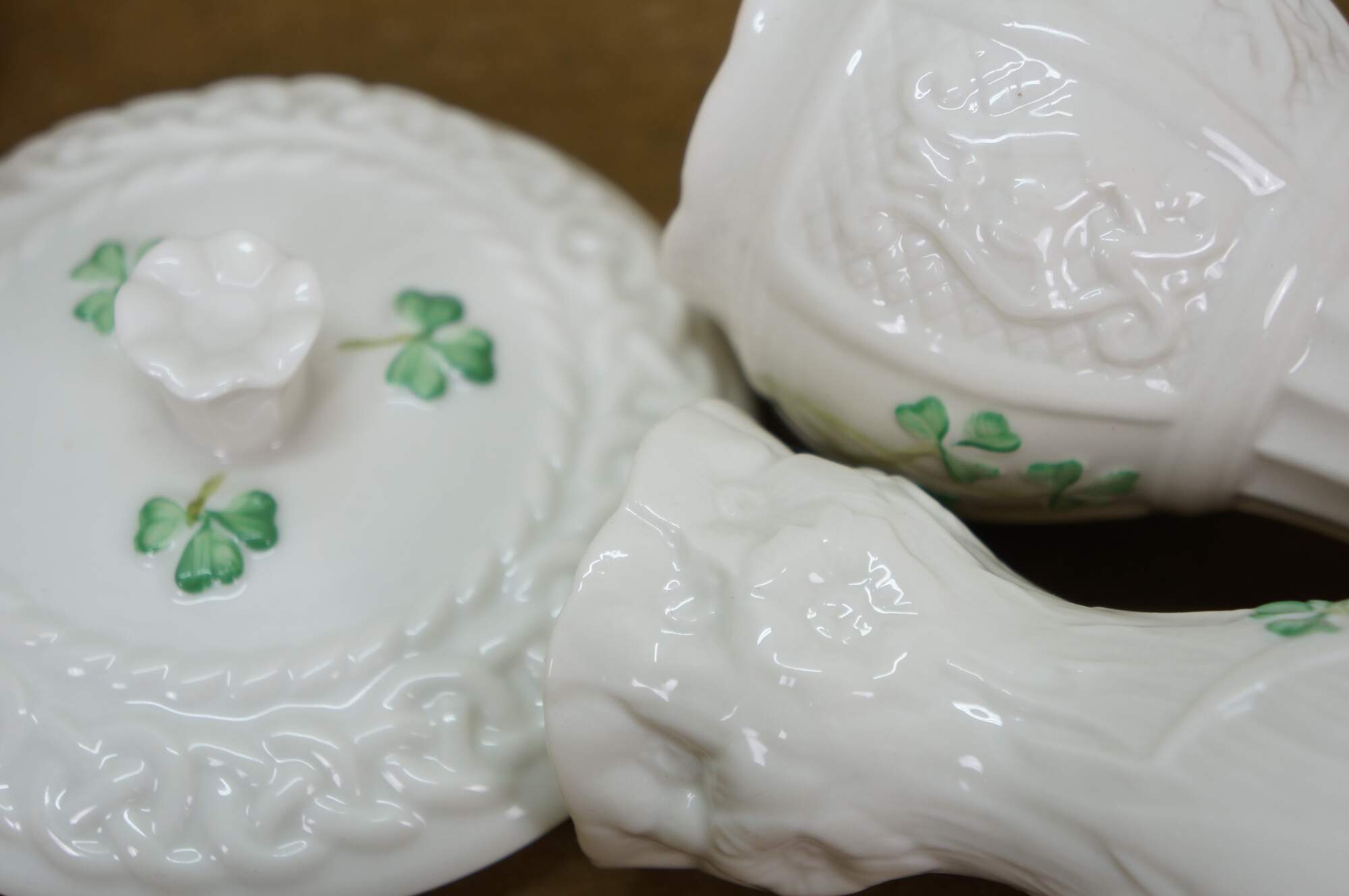 Vintage 7 piece set of Belleek white porcelain with Celtic knotwork, basketweave and hand painted shamrock clovers. Includes: 2 Daisy Candlesticks, Nadine Spill Vase, Irish Sweater Snowman Bell, Colleen Vase, Tara Gift Box, and shamrock creamer.