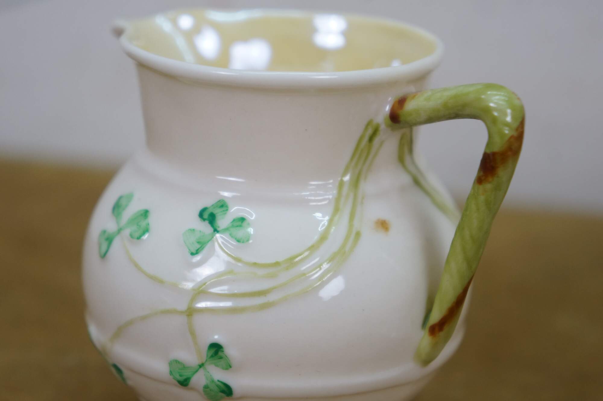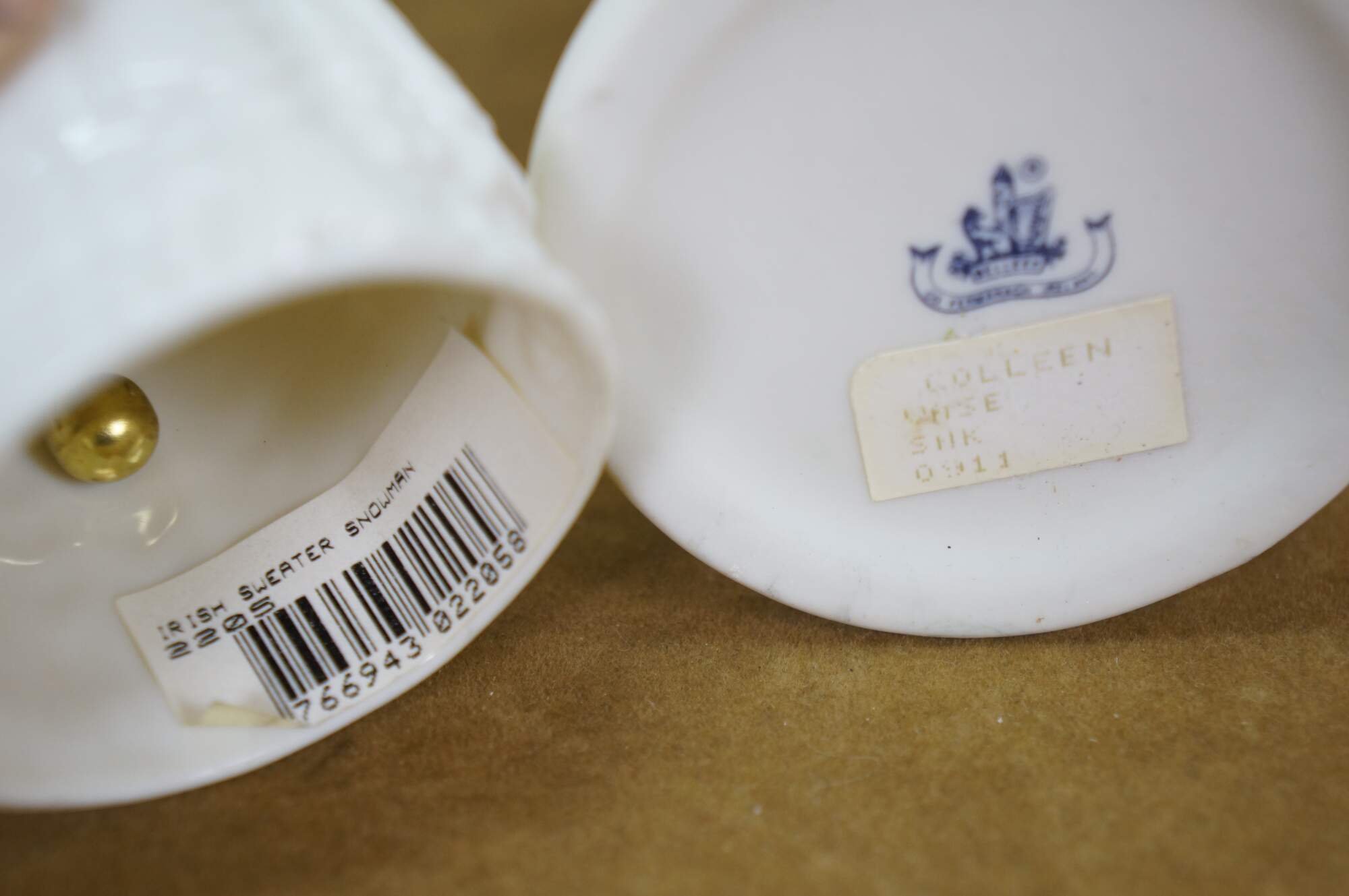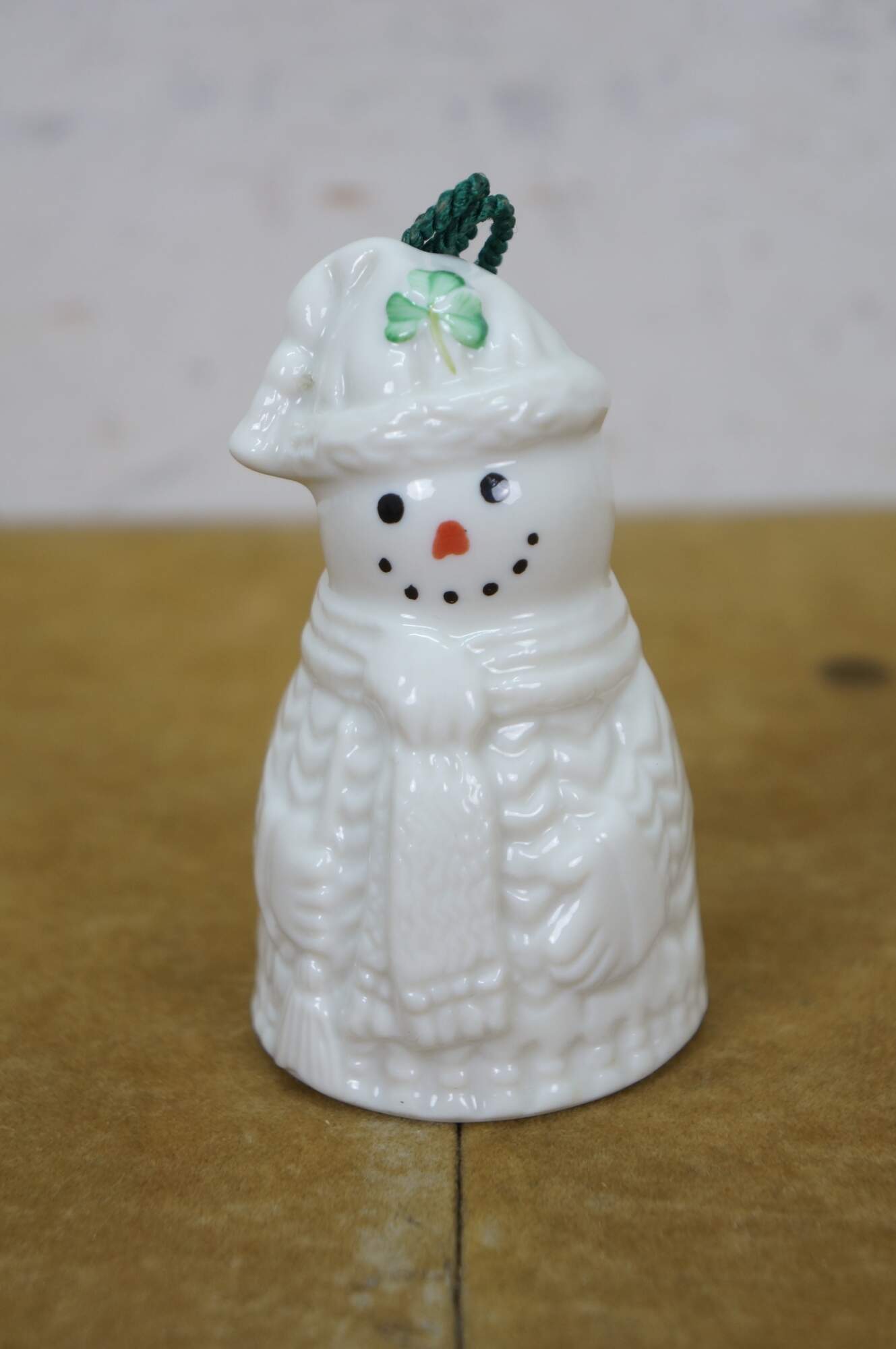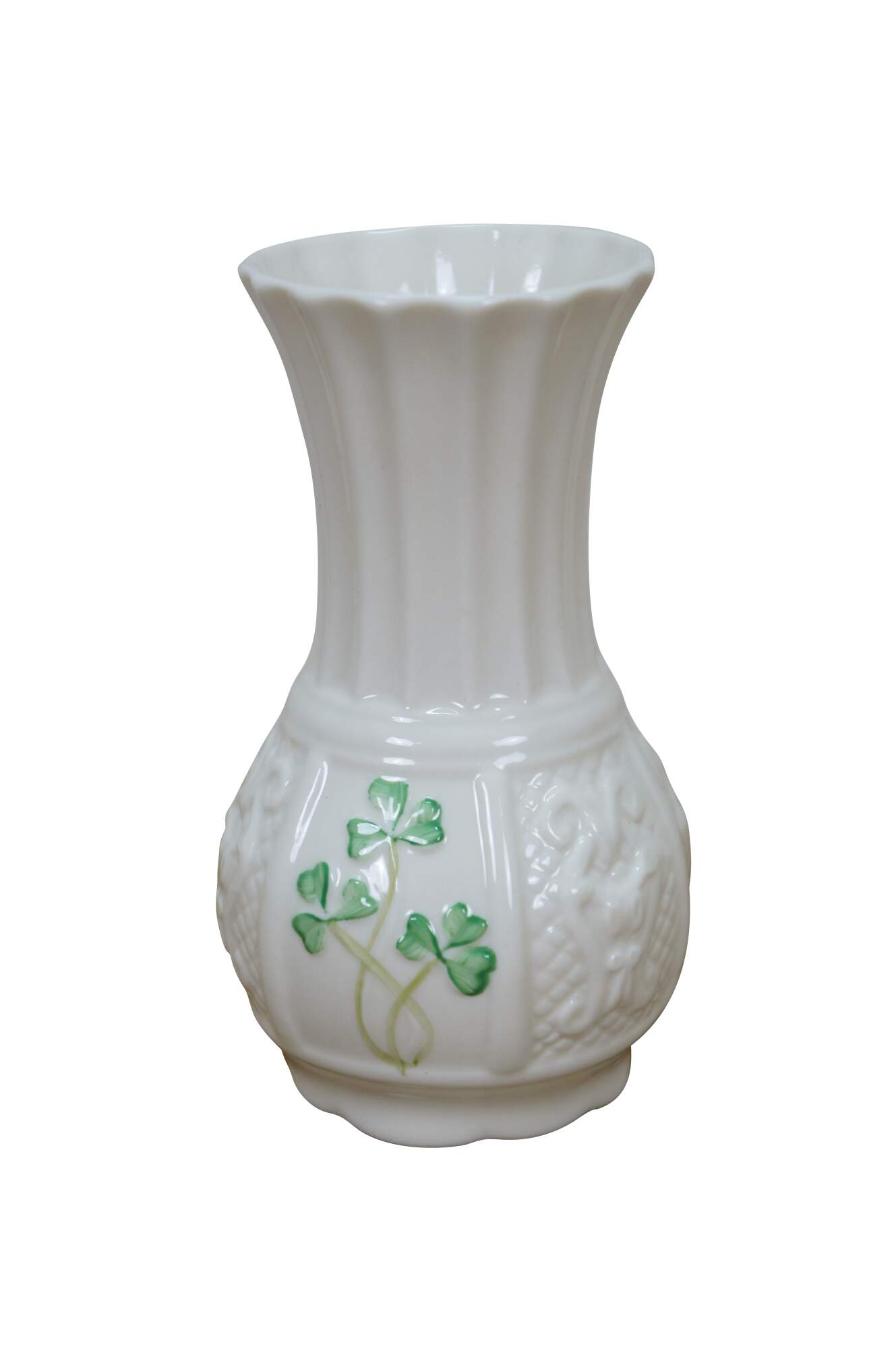 Vintage 7 piece set of Belleek white porcelain with Celtic knotwork, basketweave and hand painted shamrock clovers. Includes: 2 Daisy Candlesticks, Nadine Spill Vase, Irish Sweater Snowman Bell, Colleen Vase, Tara Gift Box, and shamrock creamer.