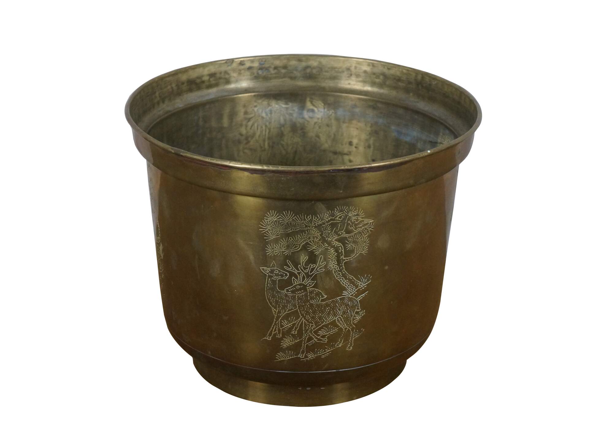 Late 20th century brass planter, etched with images of a Bengal tiger, pair of deer, eagle, and sparrows. Made in Hong Kong by Napcoware.