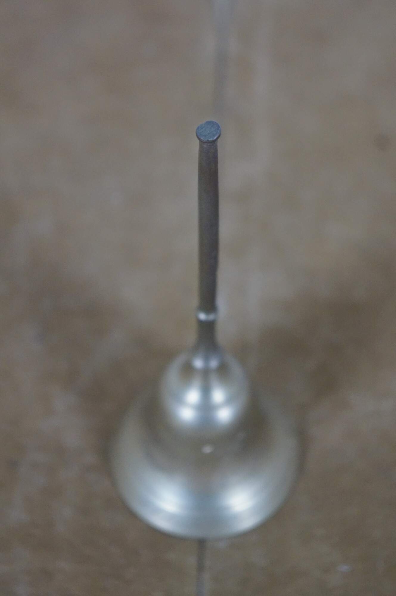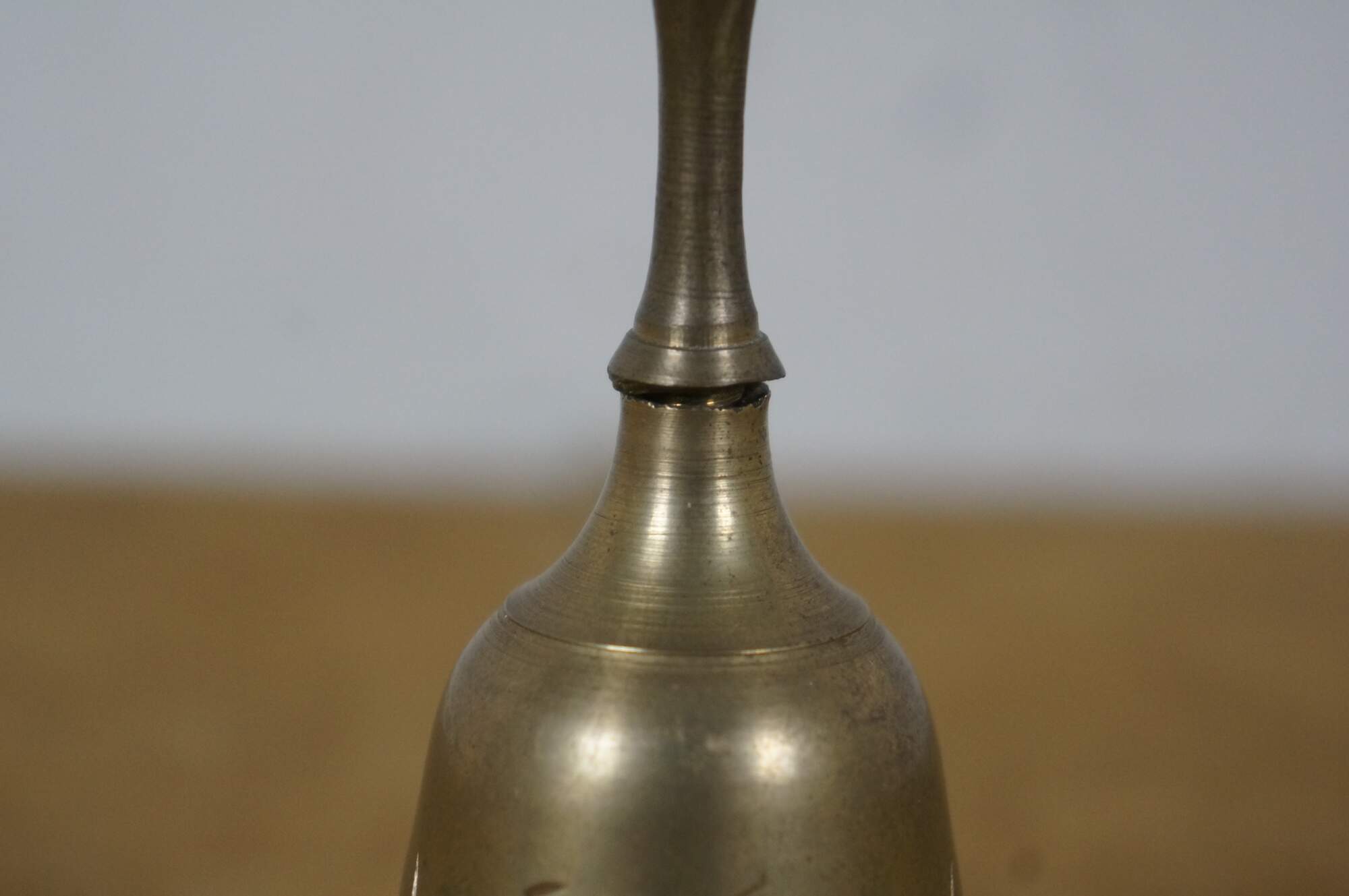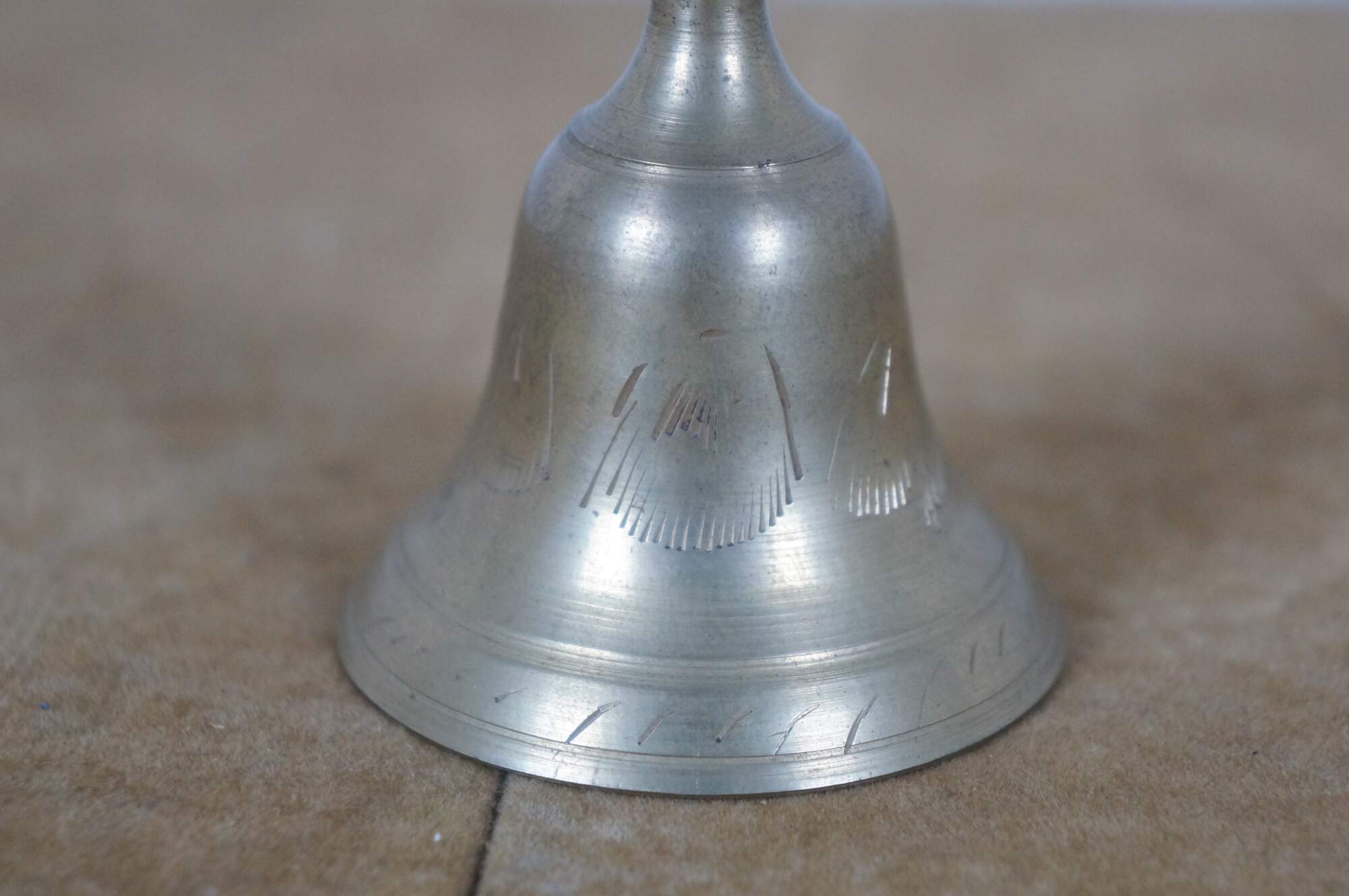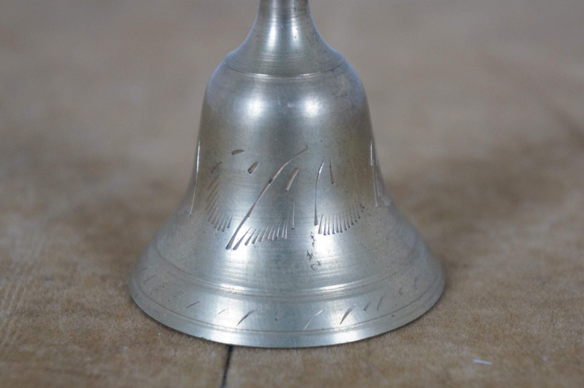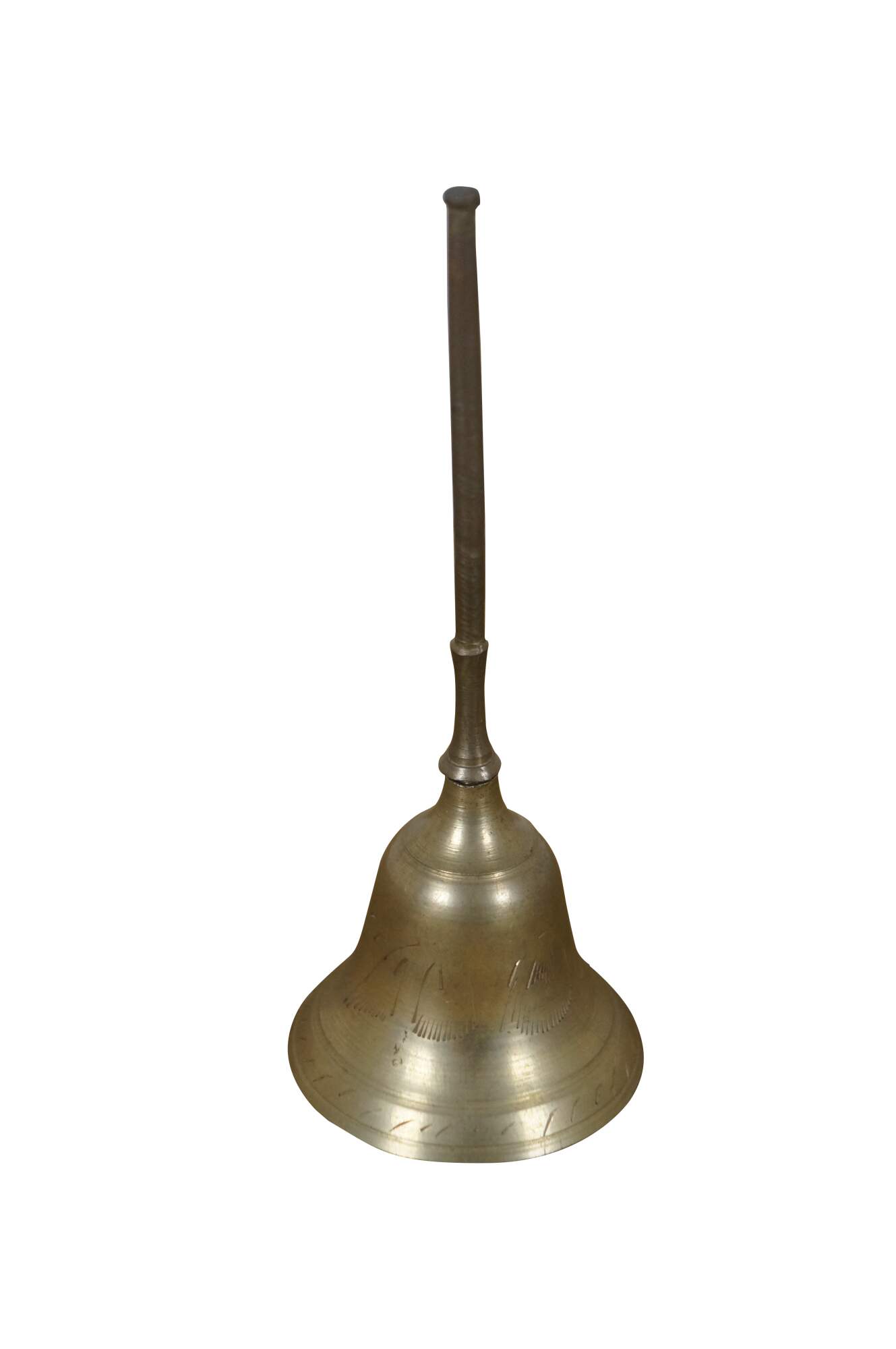 Vintage 20th-century brass hand bell with straight handle and lightly etched leaf design. Made in India.