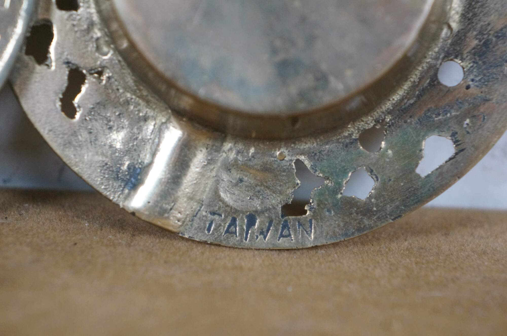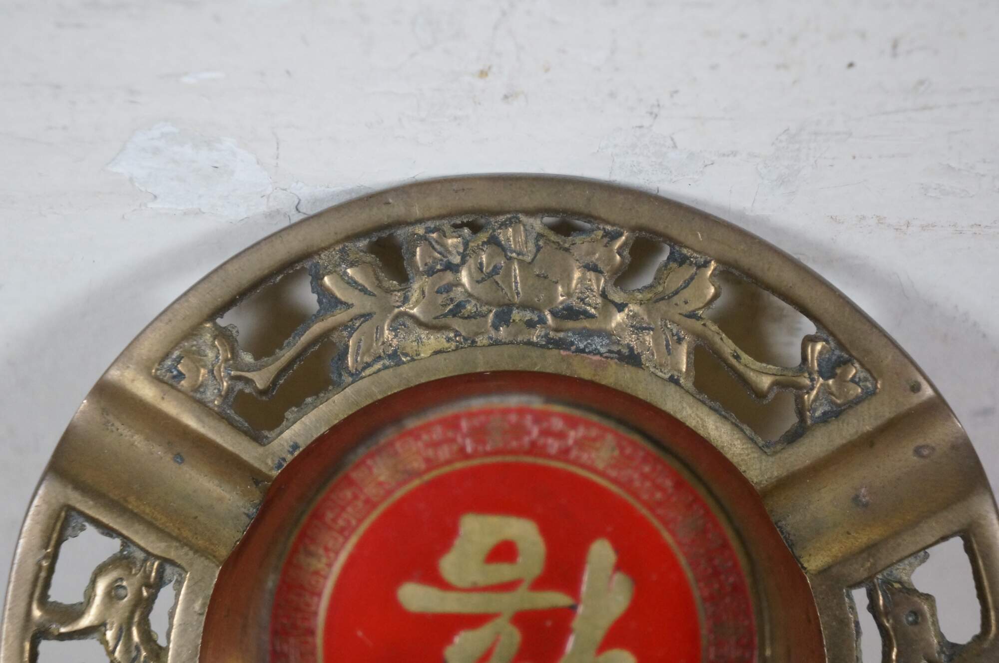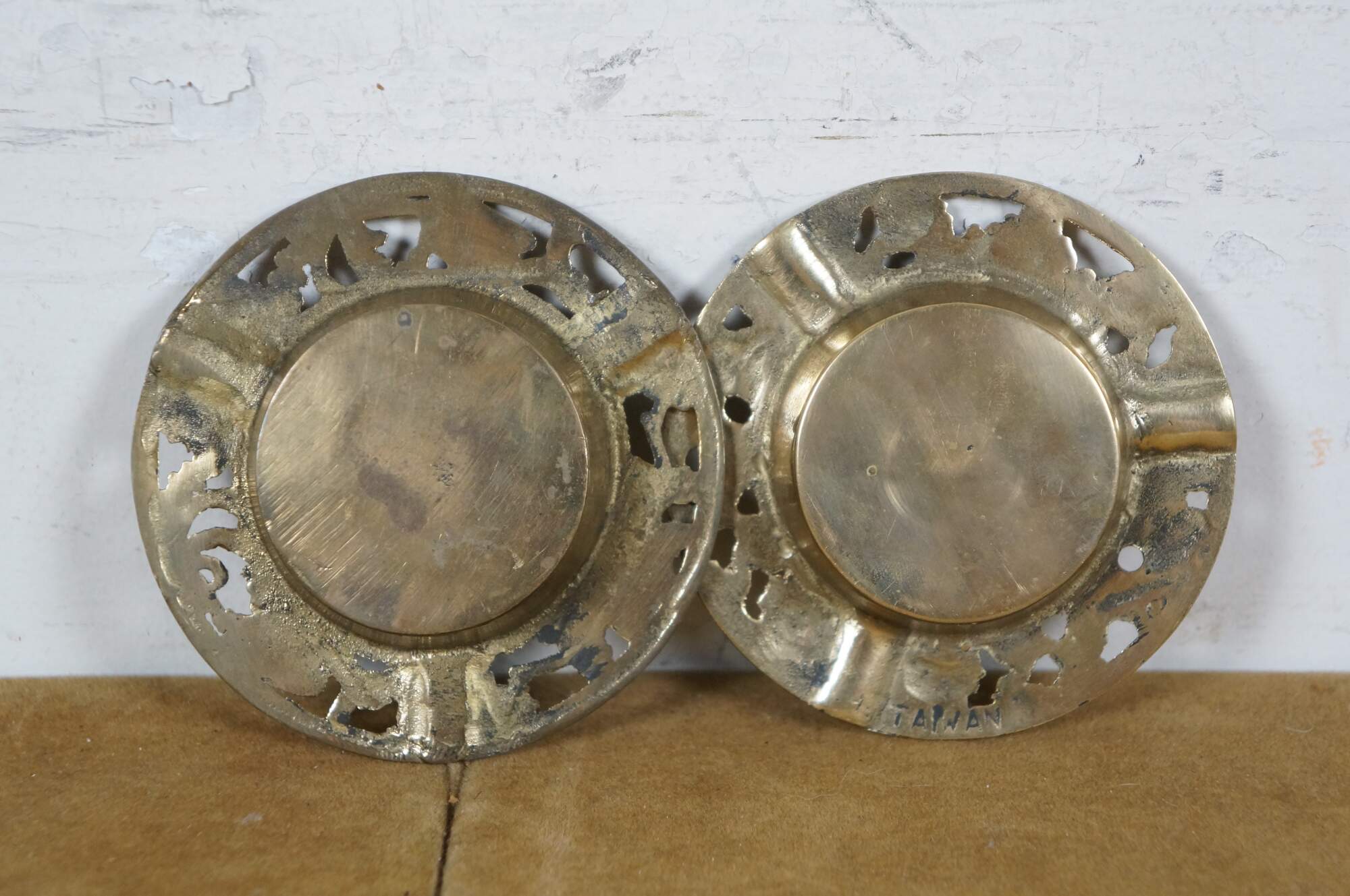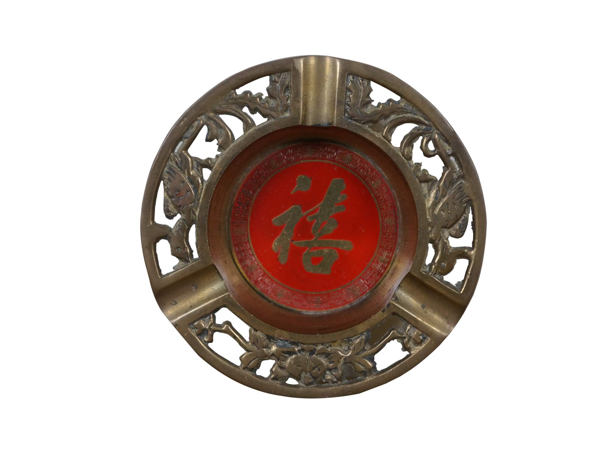 Pair of vintage 20th century Chinese / Asian personal sized brass ashtrays. Pierced edge decorated with flowers and phesants; red enameled center with gilt calligraphy. Three cigarette rests. Made in Taiwan.