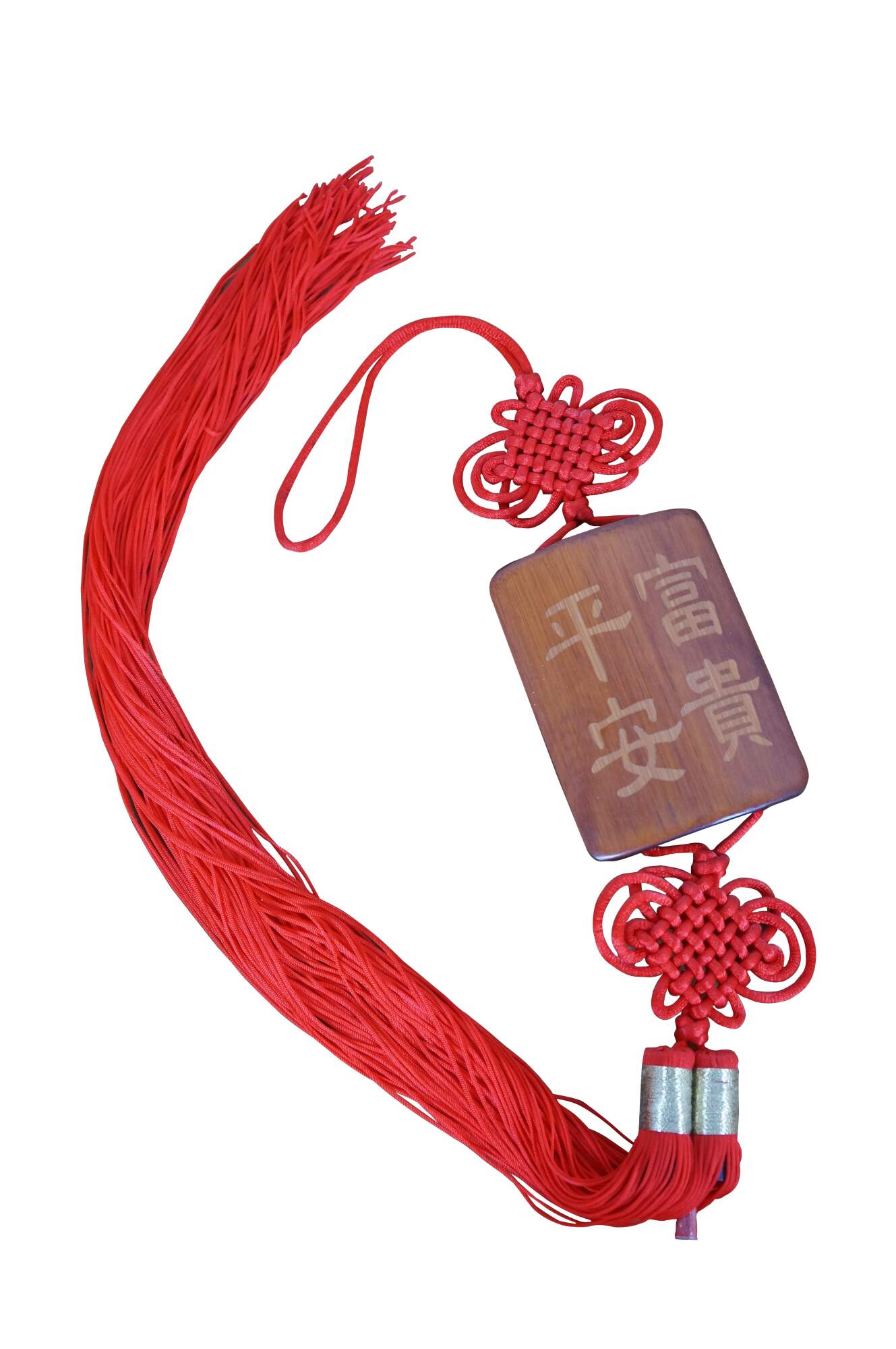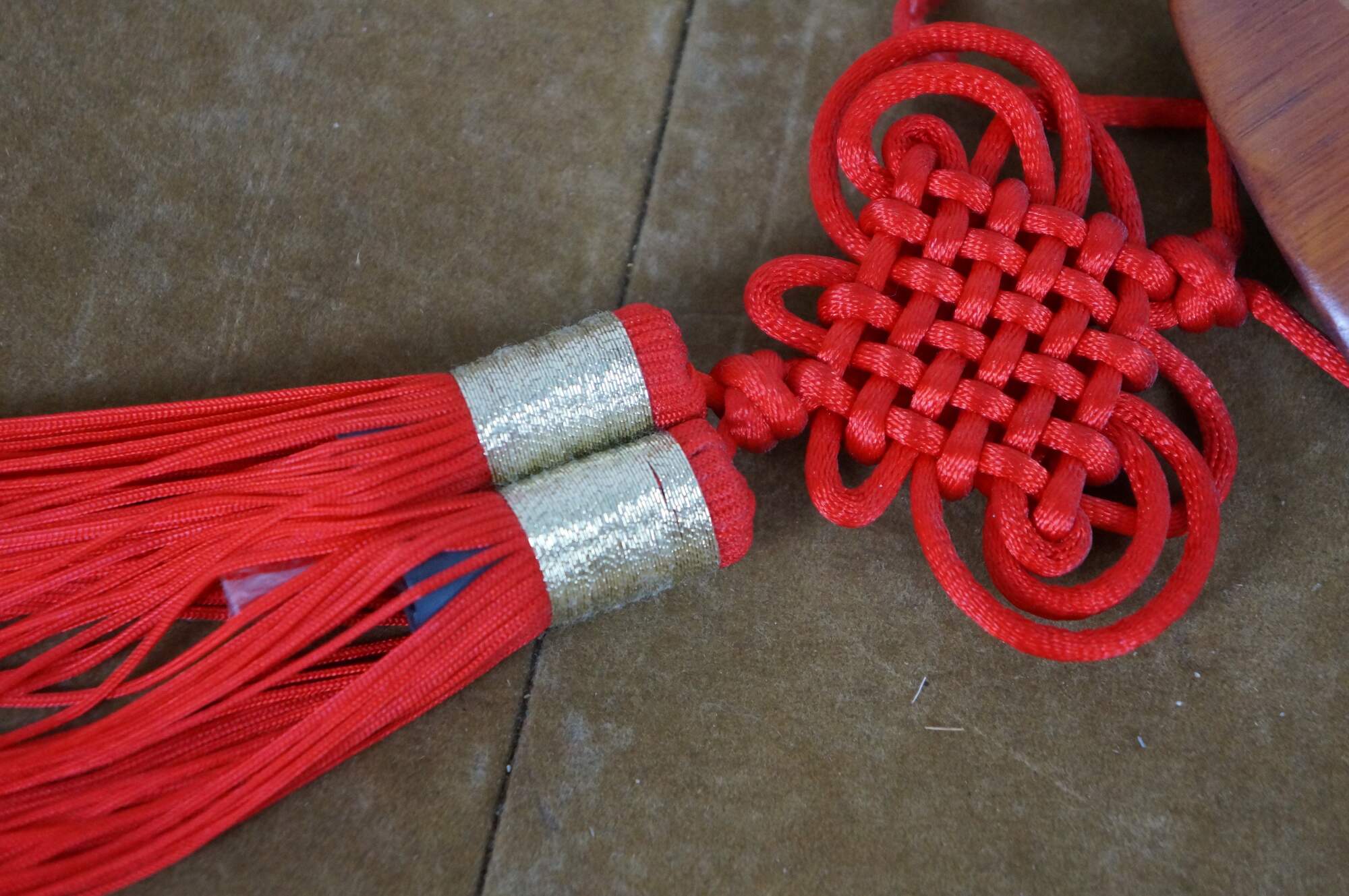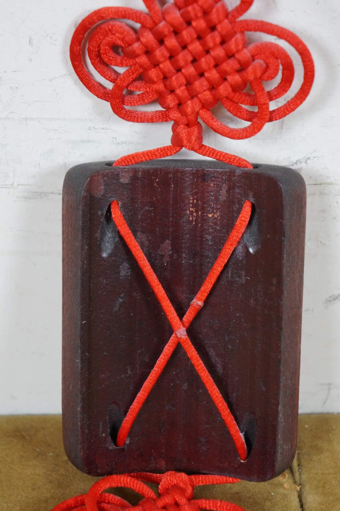 Vintage 20th century Chinese lucky wall hanging featuring a small carved bamboo panel suspended between two woven knots of red cord over a red tassel.