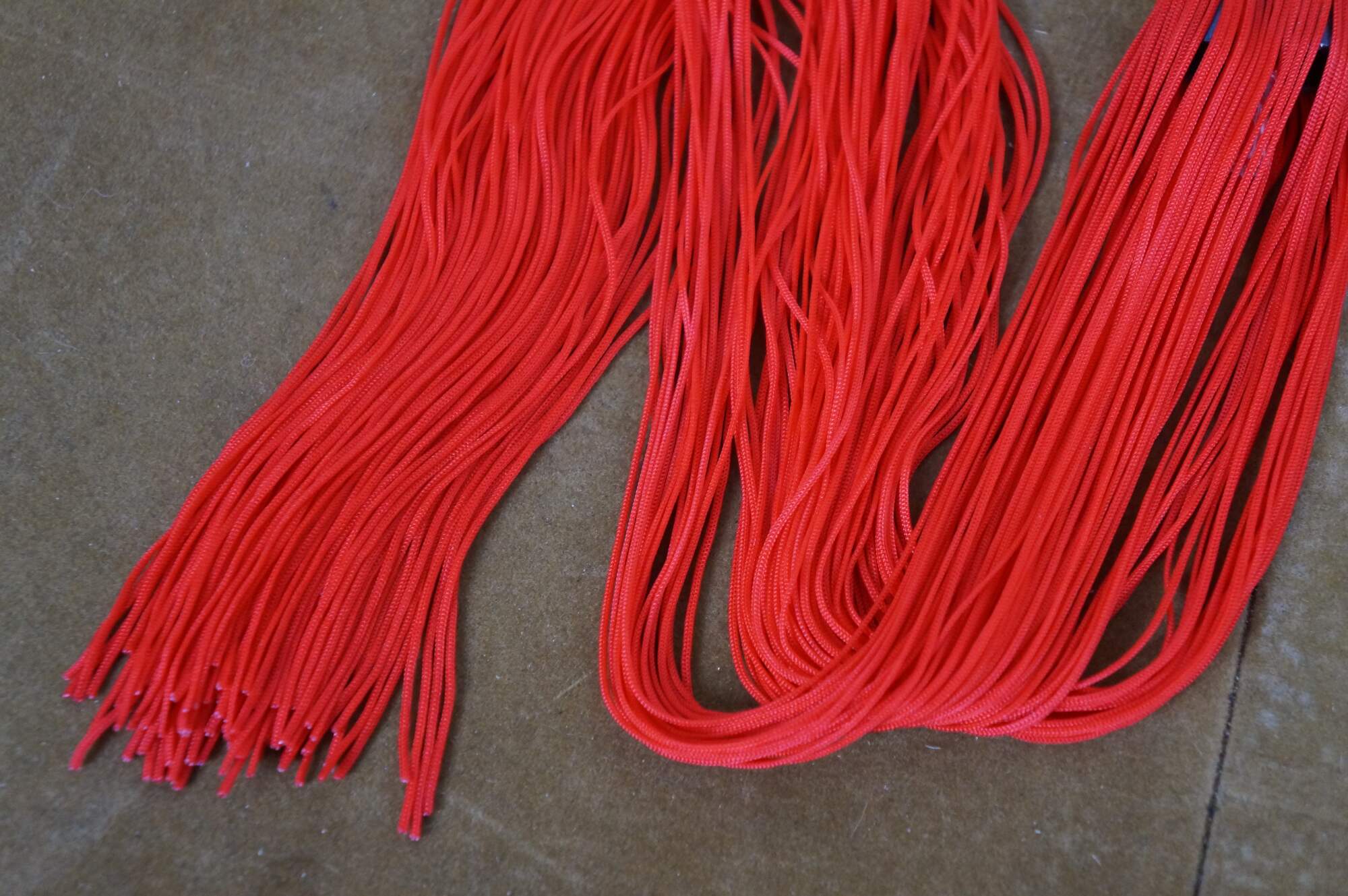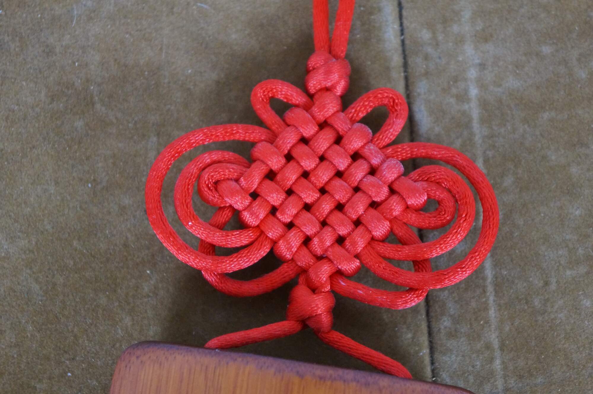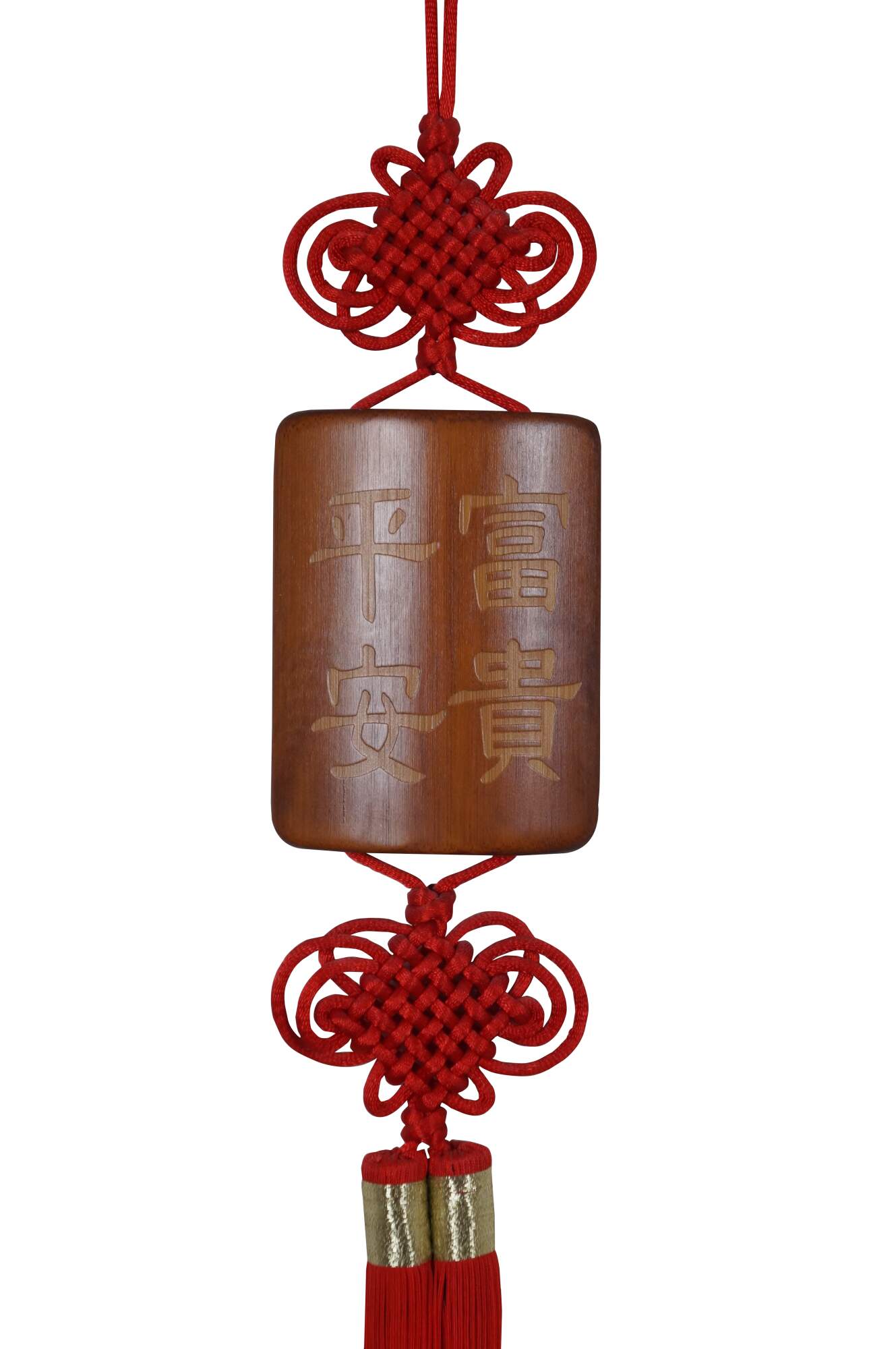 Vintage 20th century Chinese lucky wall hanging featuring a small carved bamboo panel suspended between two woven knots of red cord over a red tassel.