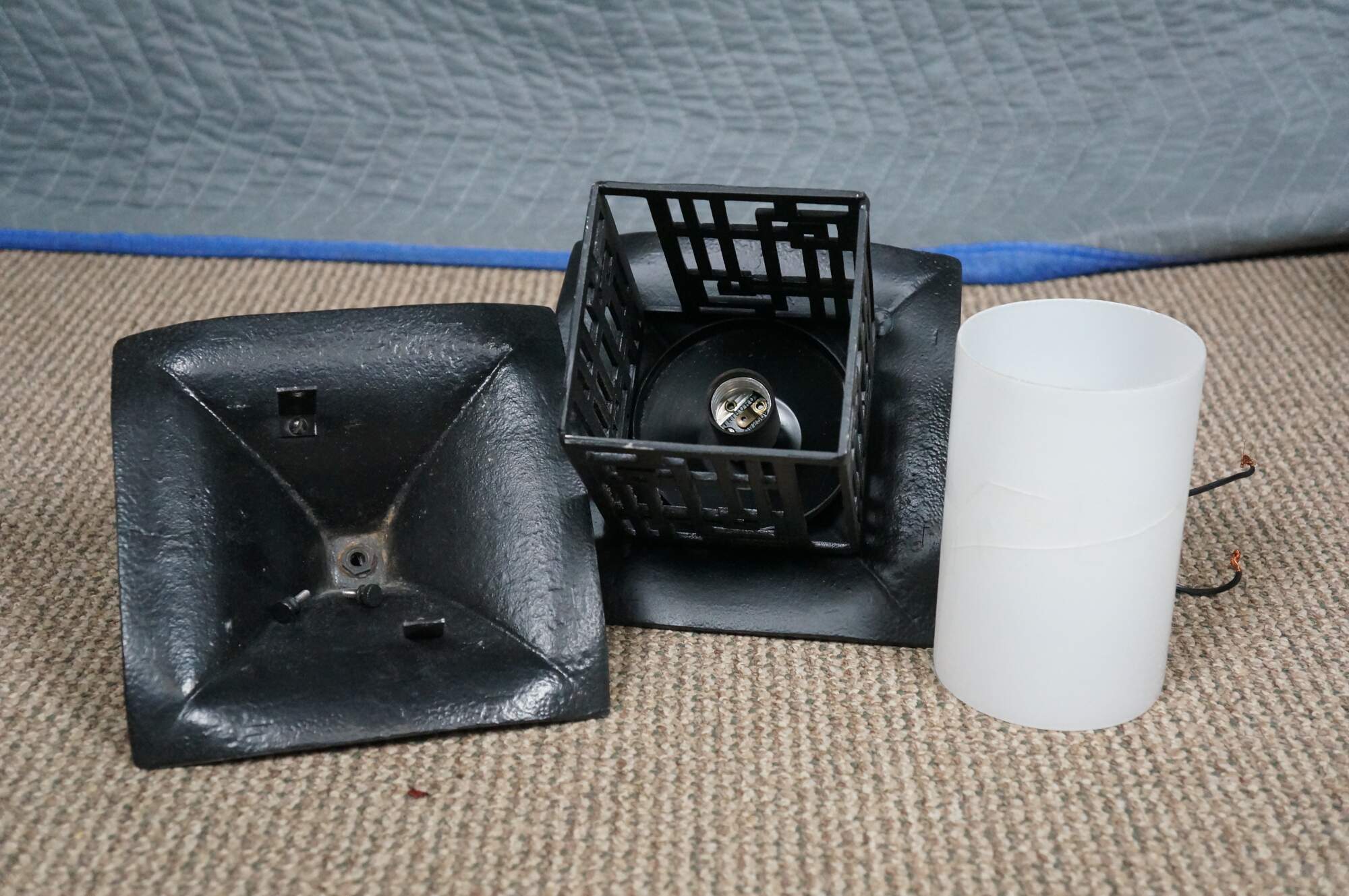Circa mid 20th century black metal single light hanging lantern / pendant light. Pagoda style lantern with a pierced chinoiserie cage around a white glass hurricane shade.