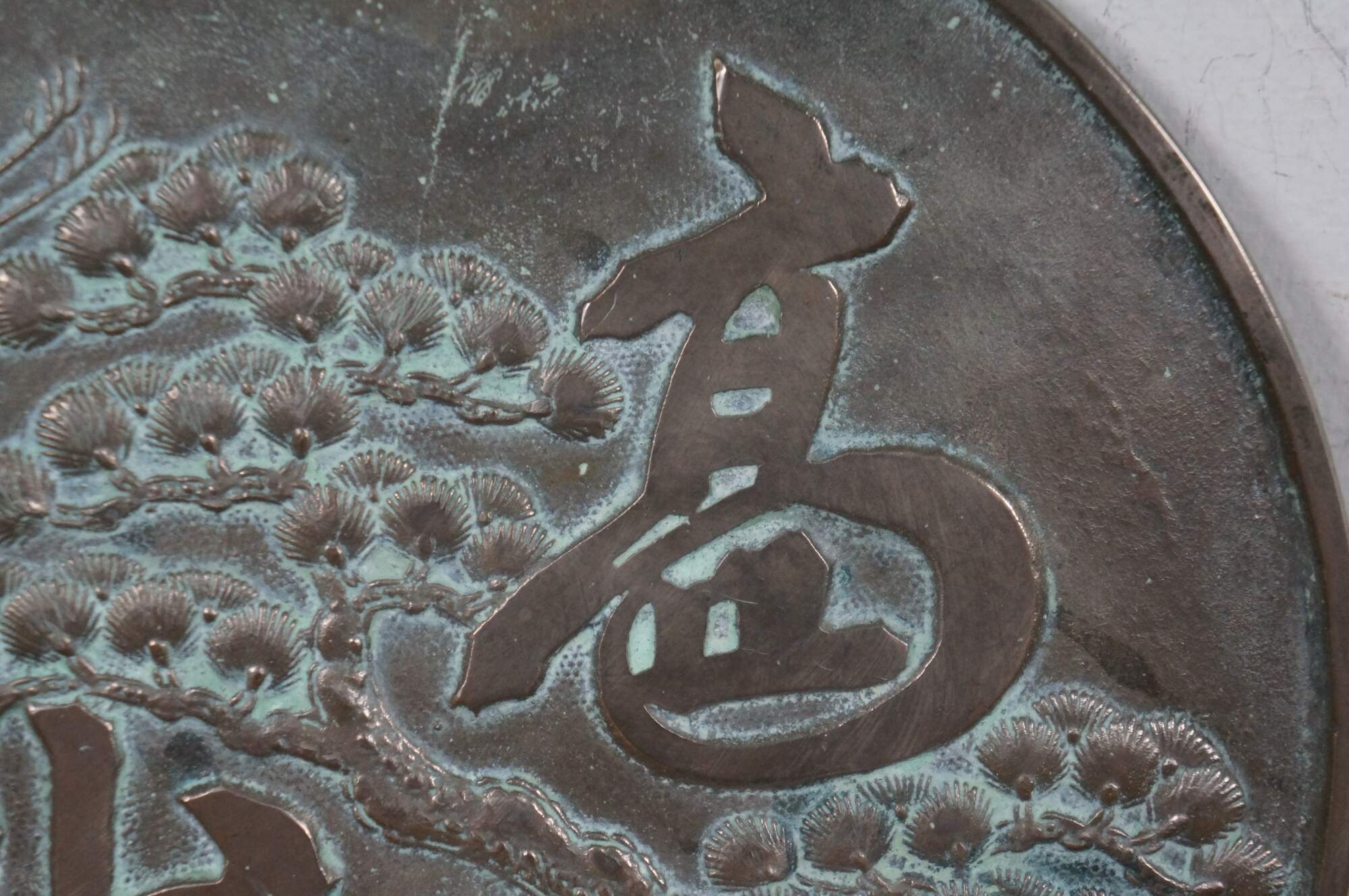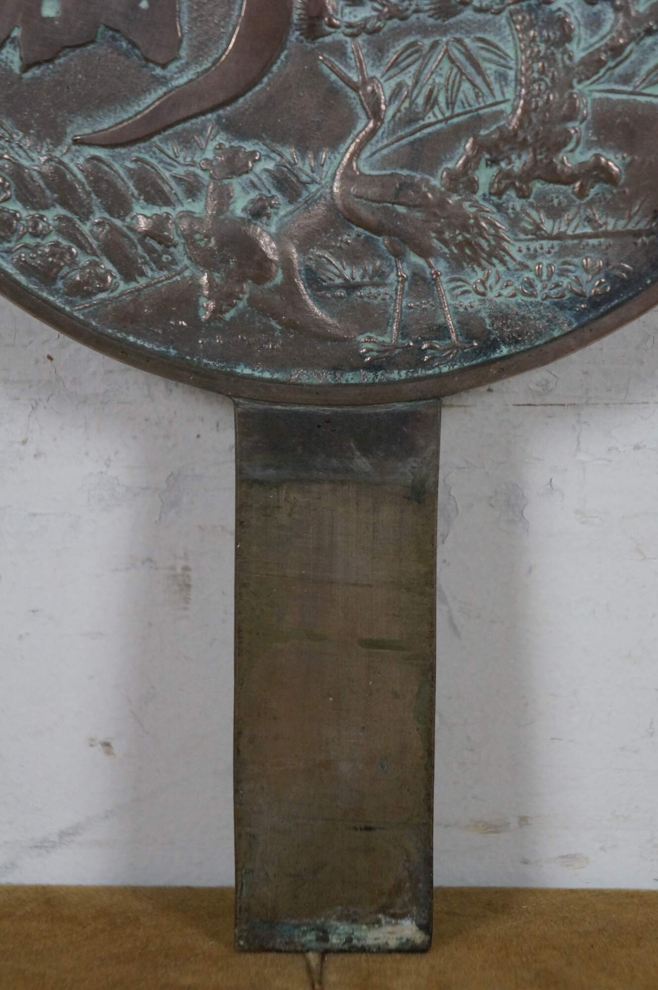 Antique Japanese Edo Period bronze kagami / hand mirror. Cast with a design featuring two large pieces of calligraphy over a landscape showing a pair of cranes by a gnarled pine tree. Writing along the left-hand side. No wrapping on the handle.