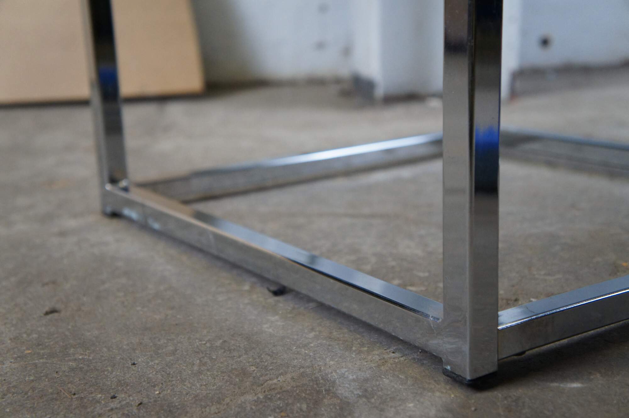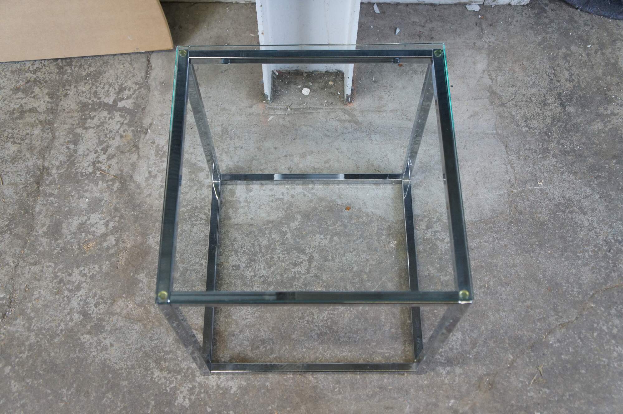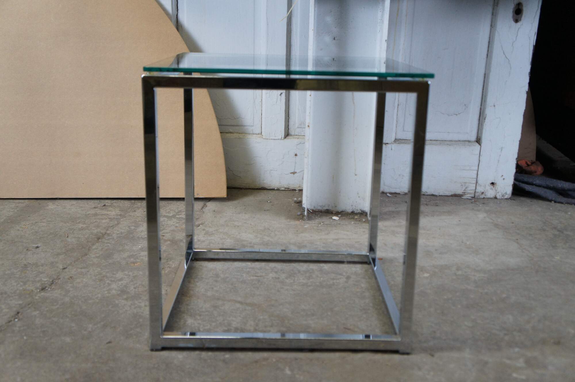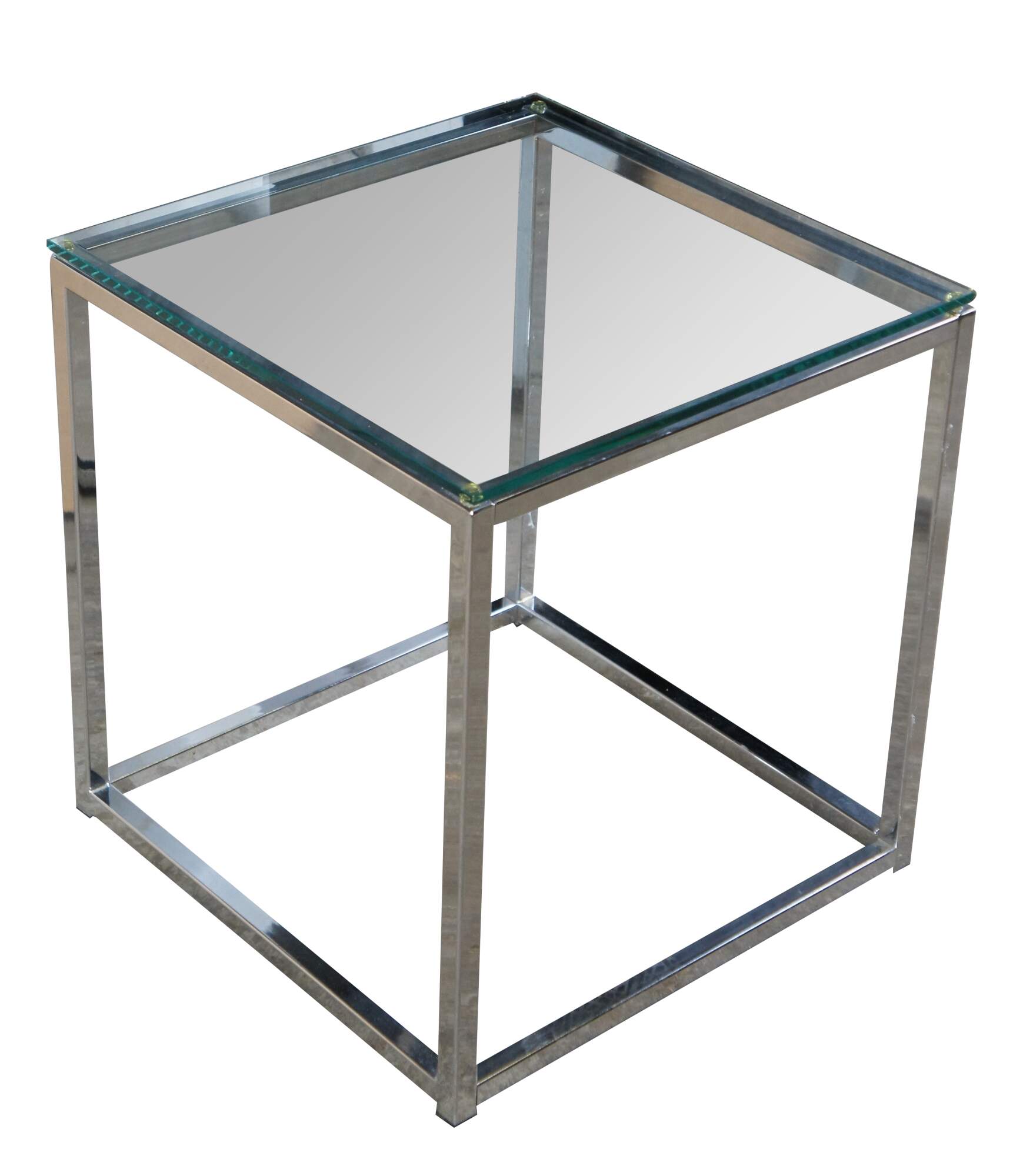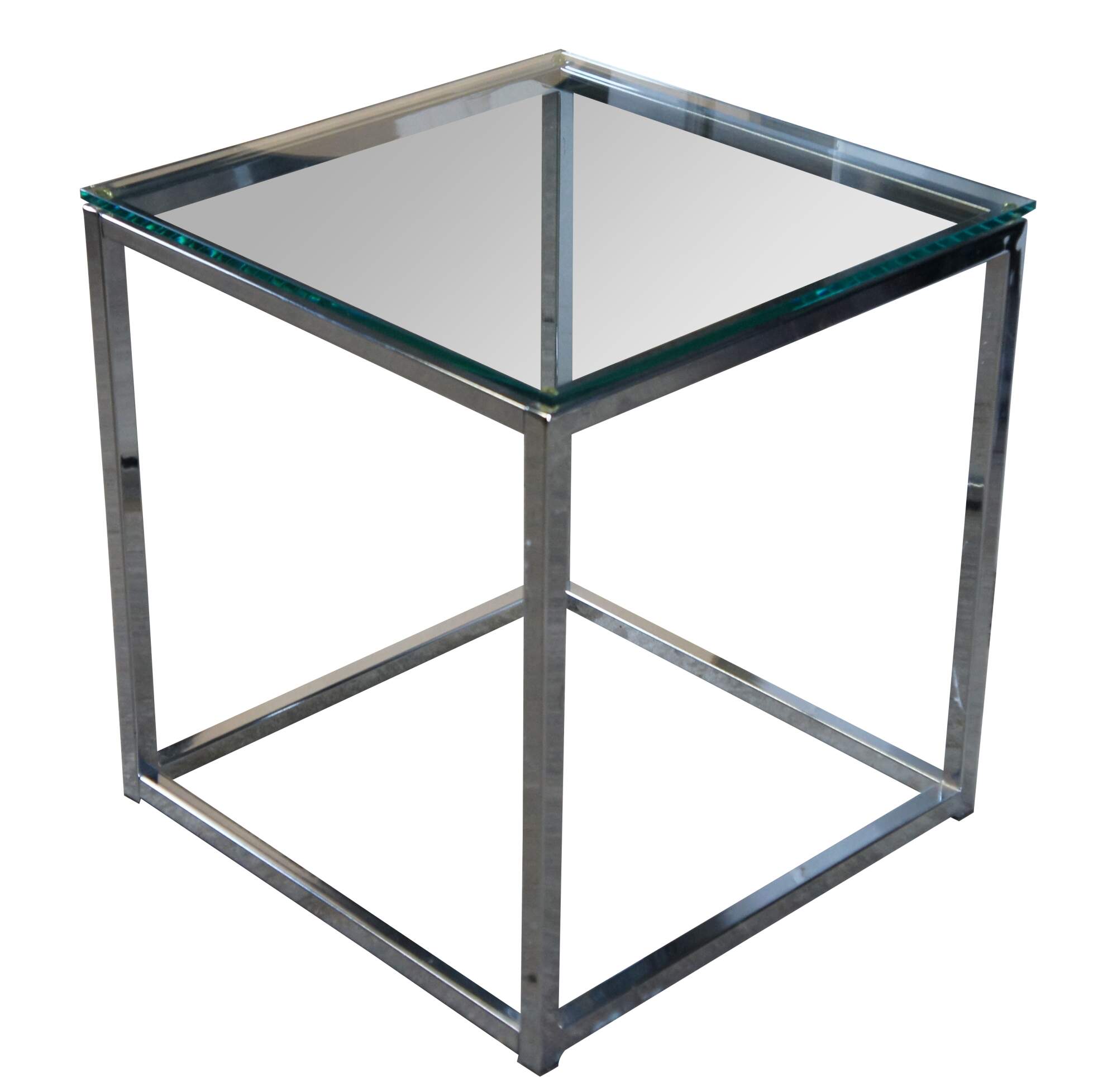 A small modern side table. Features a chrome base with a tempered glass top. Circa 2010