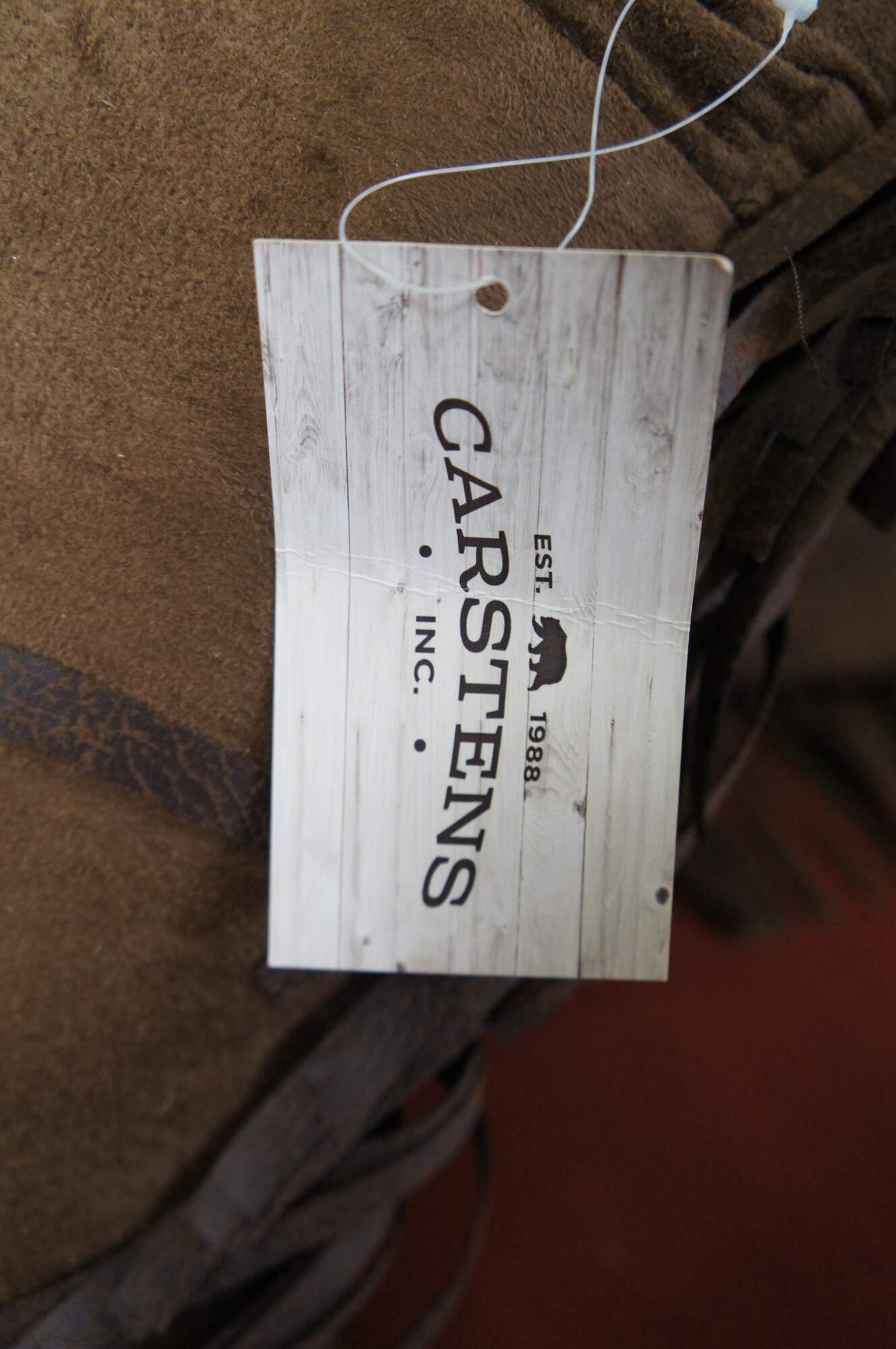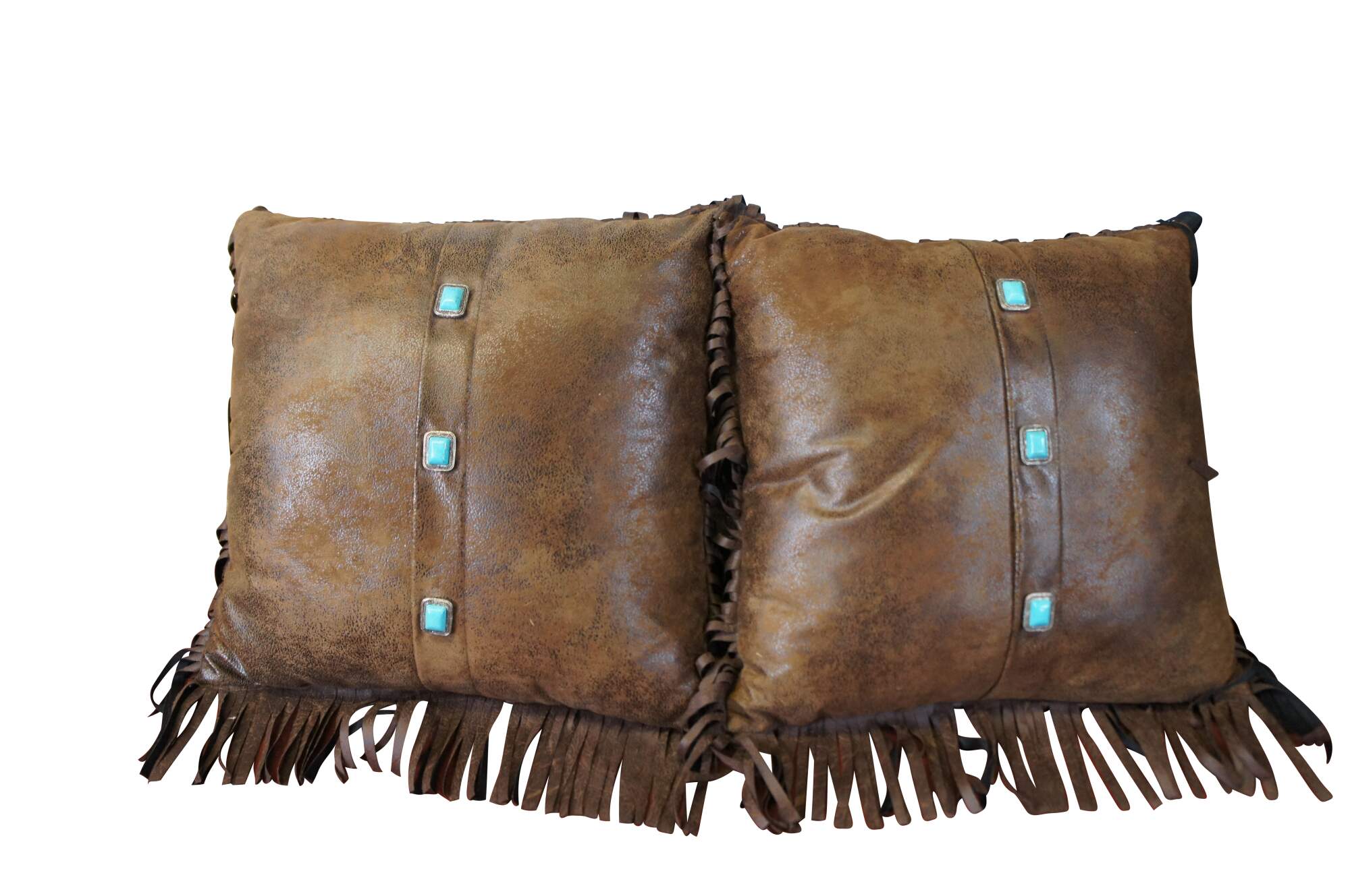 Pair of Wyoming Three Concho Pillows. Made from leather with turquoise and tassels.