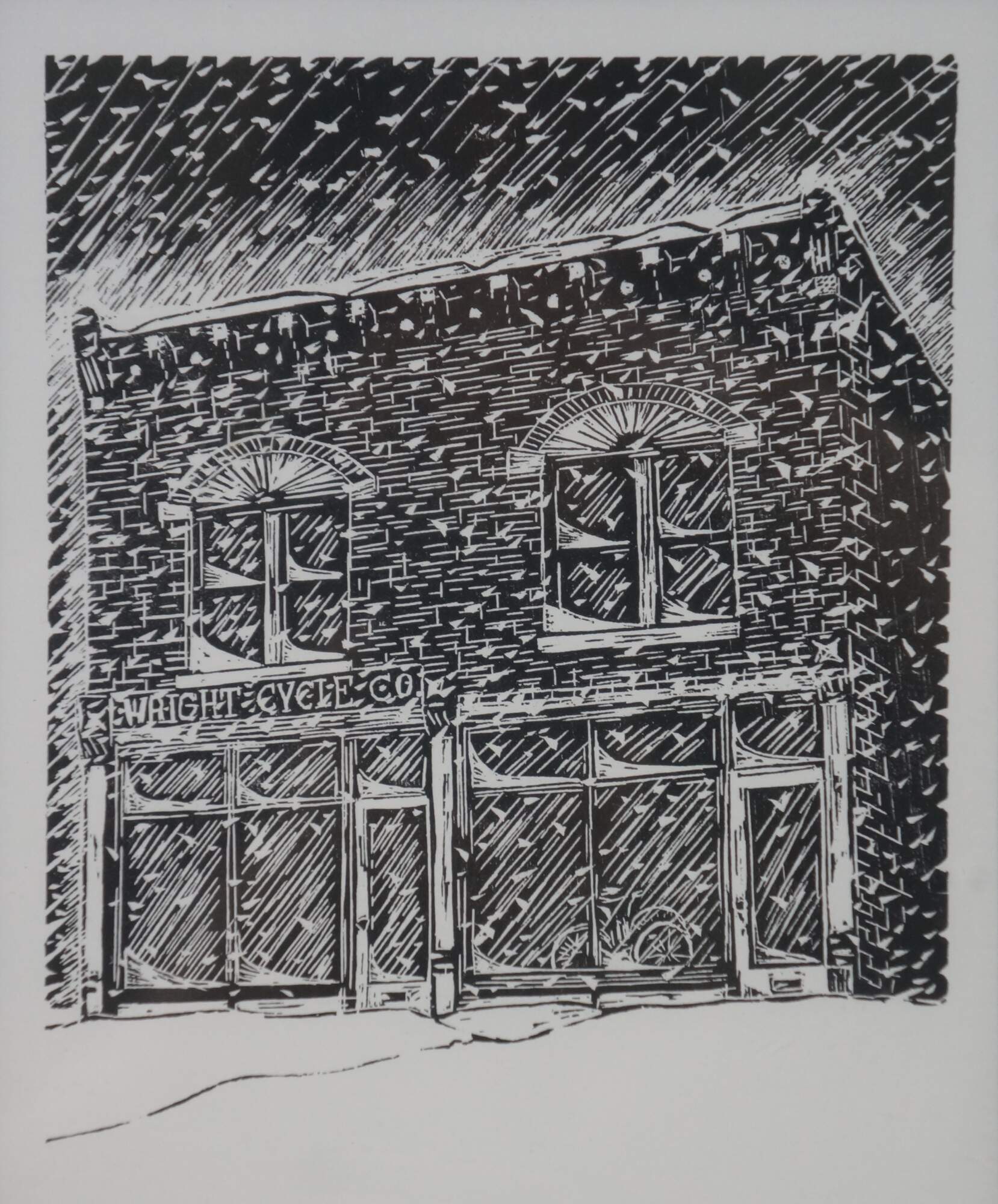 "Wright Night Snow - The Wright Cycle Shop in Carillon Historical Park is a replica of the Wright brothers’ bicycle shop originally located at 1127 W. Third Street in Dayton. Here Wilbur and Orville practiced all three of their careers: printing, bicycle making, and the design and building of their earliest gliders and airplanes. It was in this shop that the brothers performed the pioneering wind tunnel experiments so critical to their later success. The shop is now located at Greenfield Village in Dearborn, Michigan. Designer / printmaker Thomas B. Schorgl created and donated the woodcut used to create this limited edition print. The Park's volunteer printer produced the print using the historic equipment in the 1930s print shop.