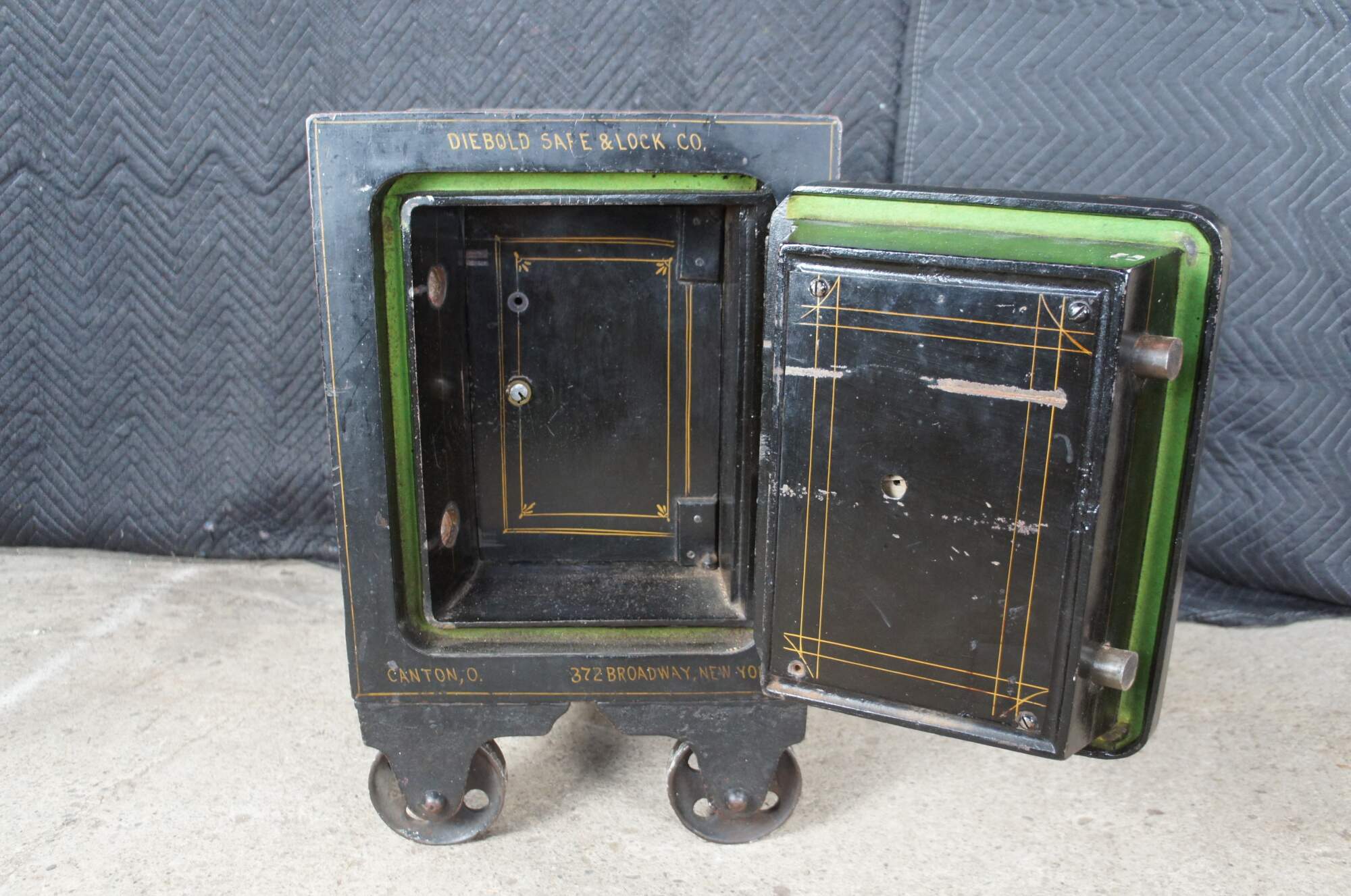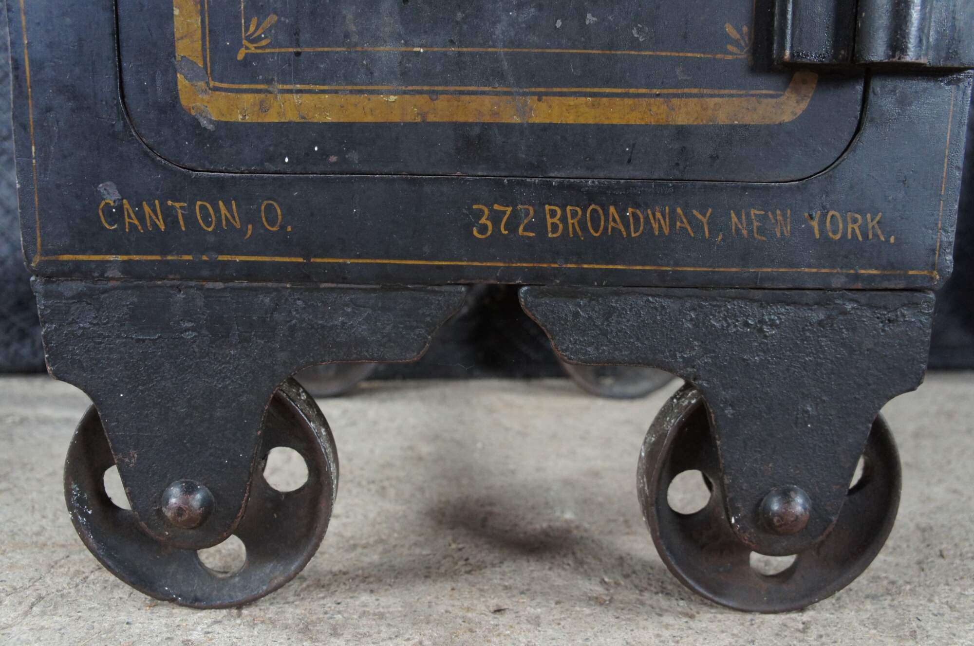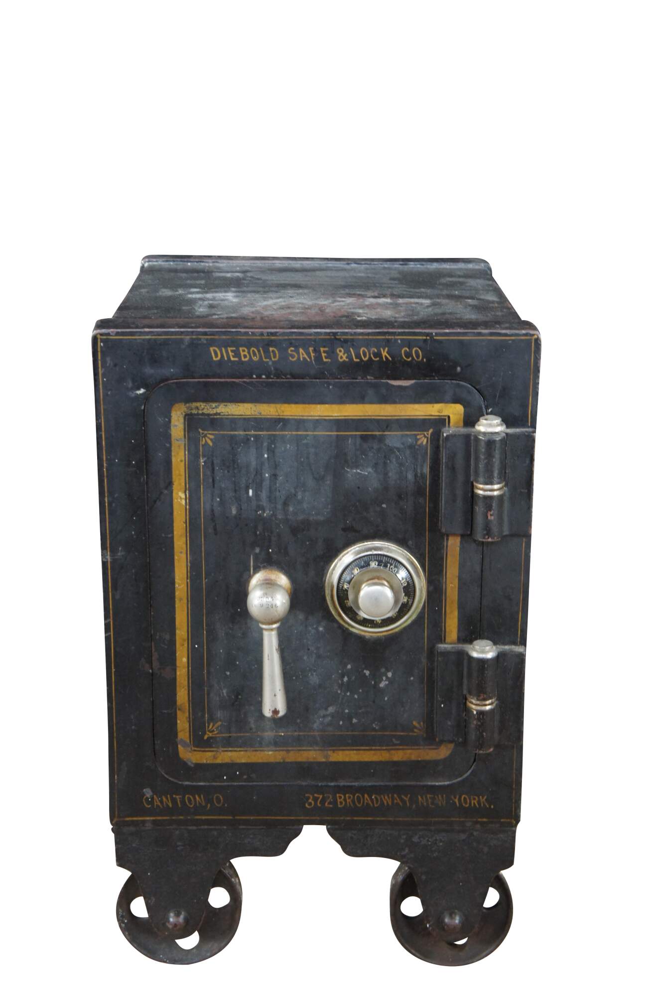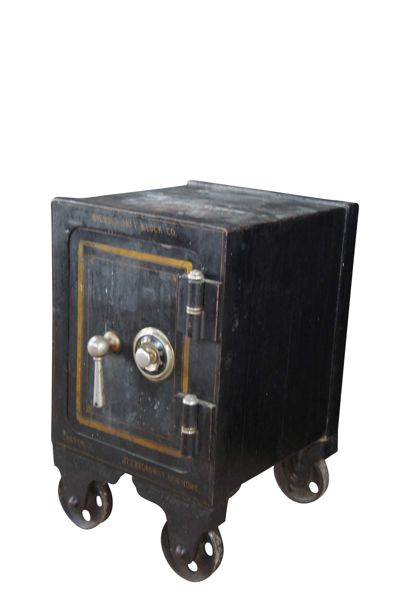 Late 19th Century Diebold Safe & Lock Company Cast Iron Floor Safe. Features a heavy black cast iron frame with gold trim. The safe has a working combo lock and opens to a gold trimmed interior with additional valance door that opens to a wood partitioned interior for valuables. The safe is marked Diebold Safe & Lock Co along the top as well as Canton Ohio where it was manufactured. The bottom right has an addres of 372 Broadway New York which is presumably where it was sent or used. The safe is on wheels for ease of movement. Serial Number 3304169216