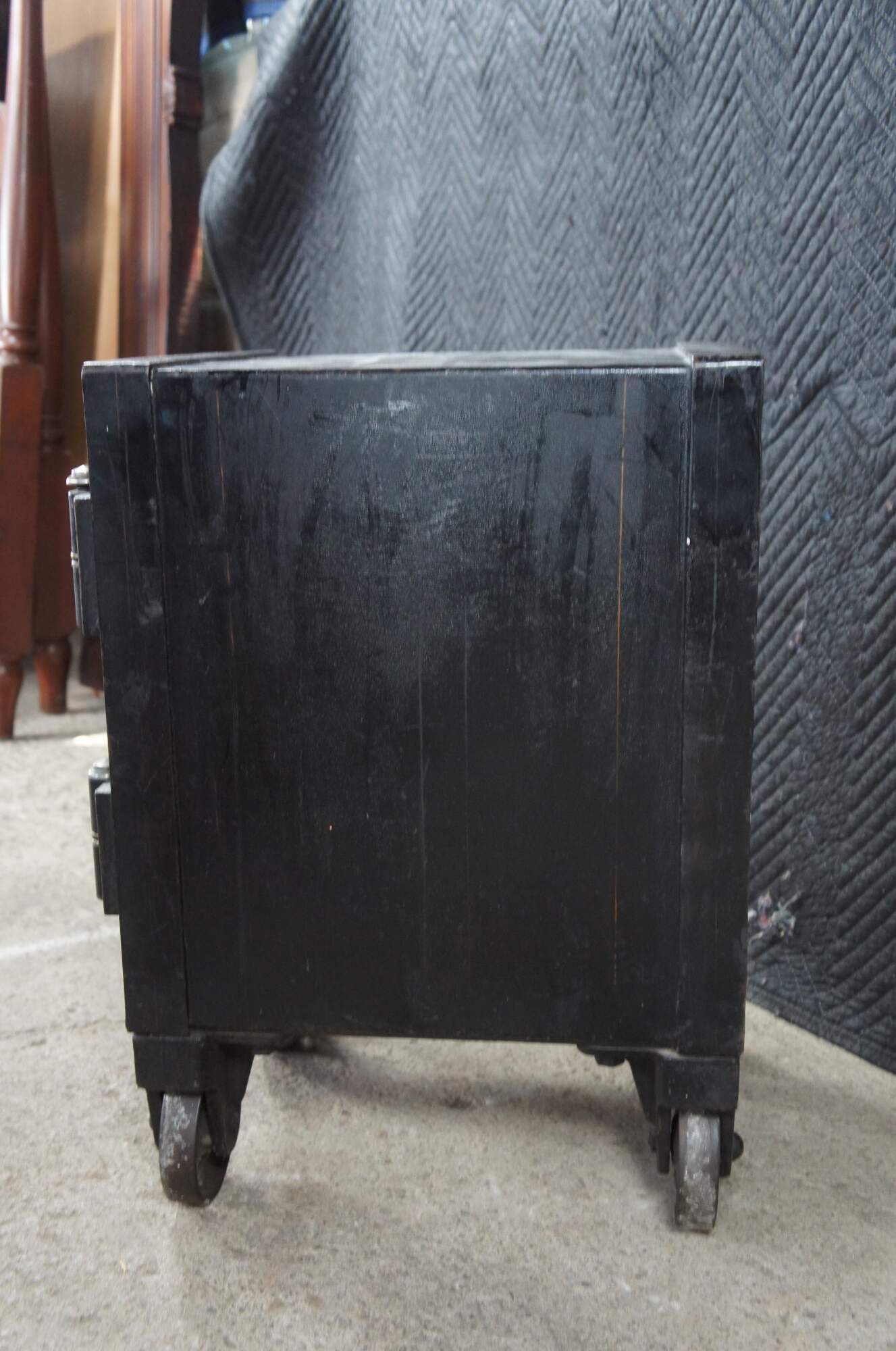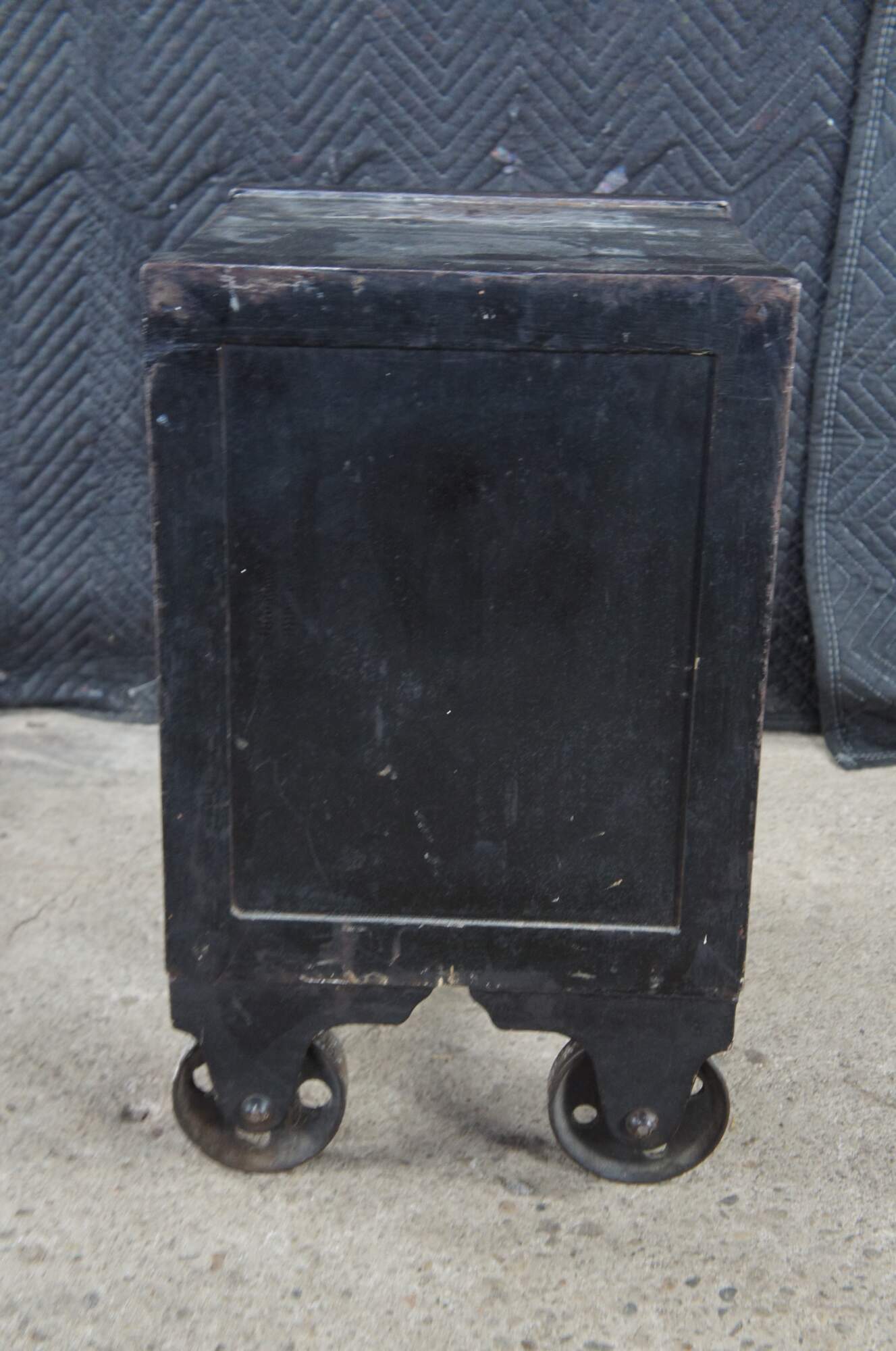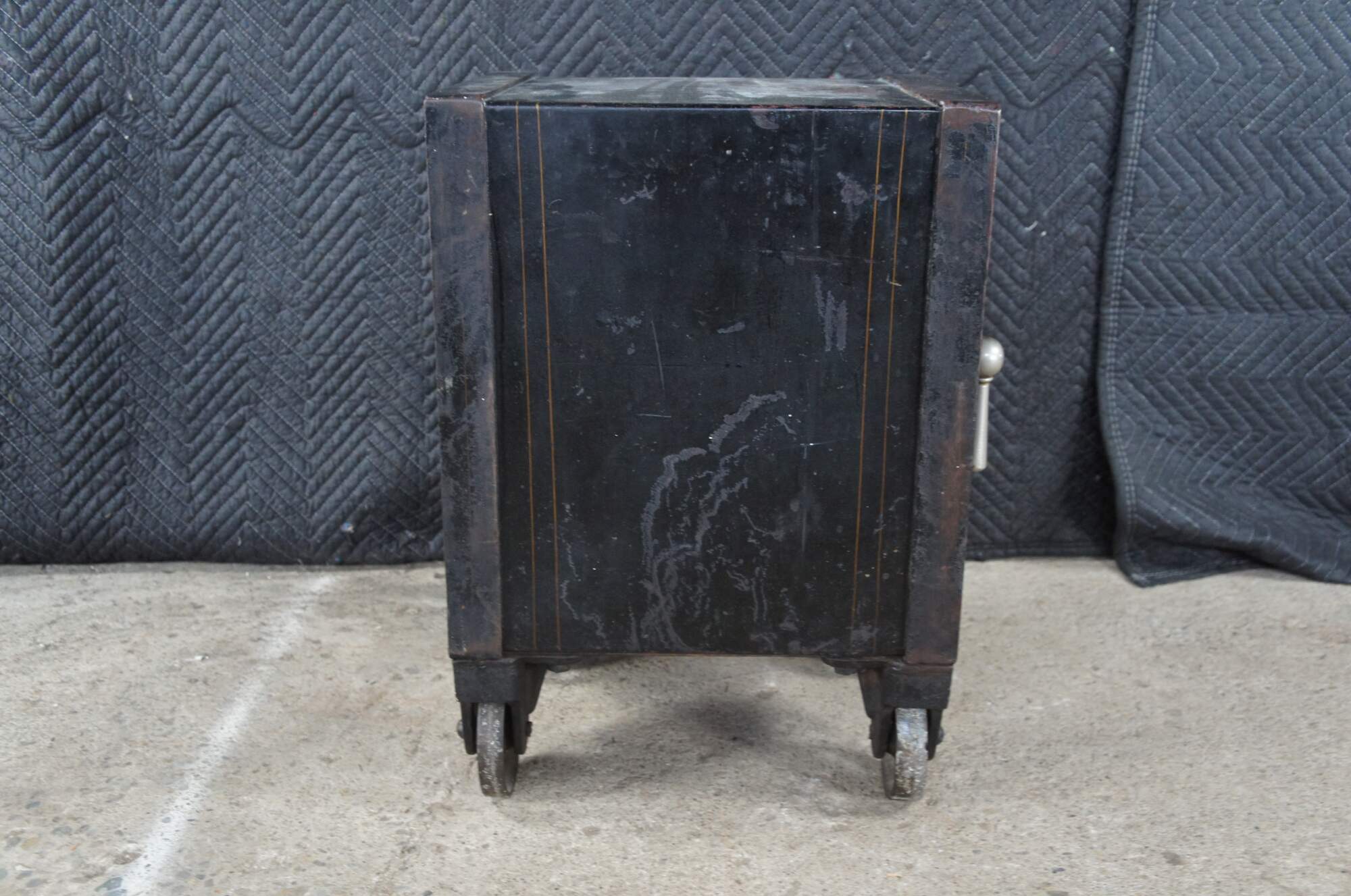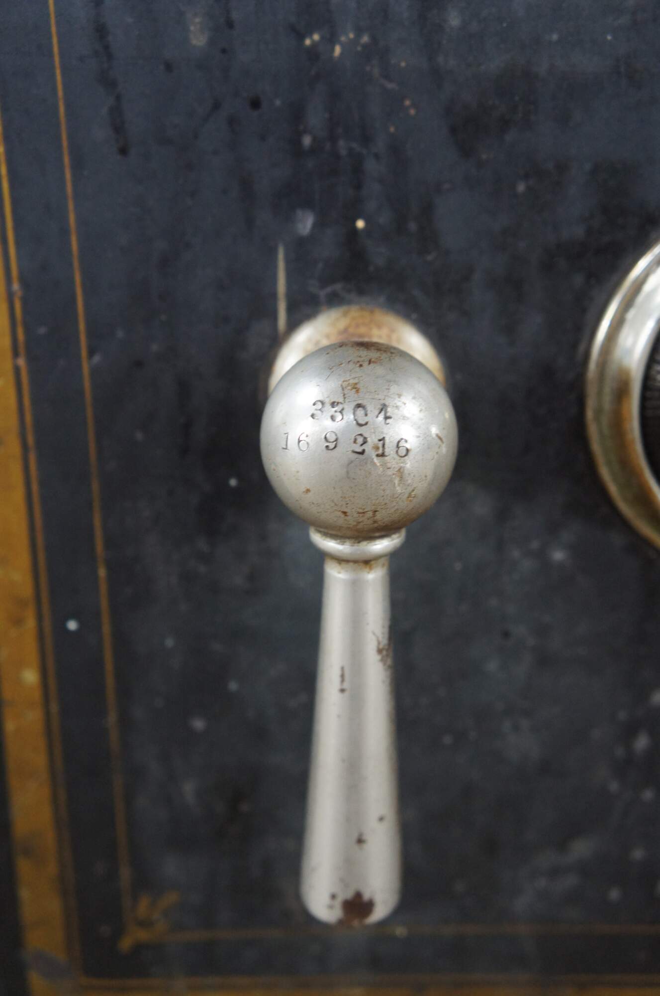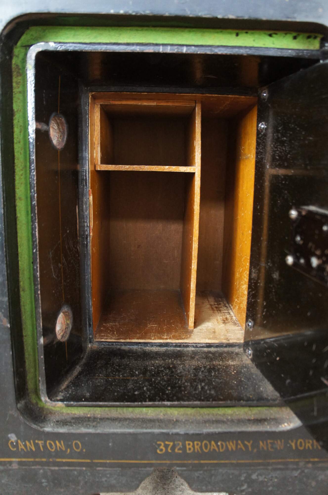Good Overall; Original patina. Marking, distressing and staining from use. The combo lock is fully functional. The smaller interior locking door was drilled out at some point.