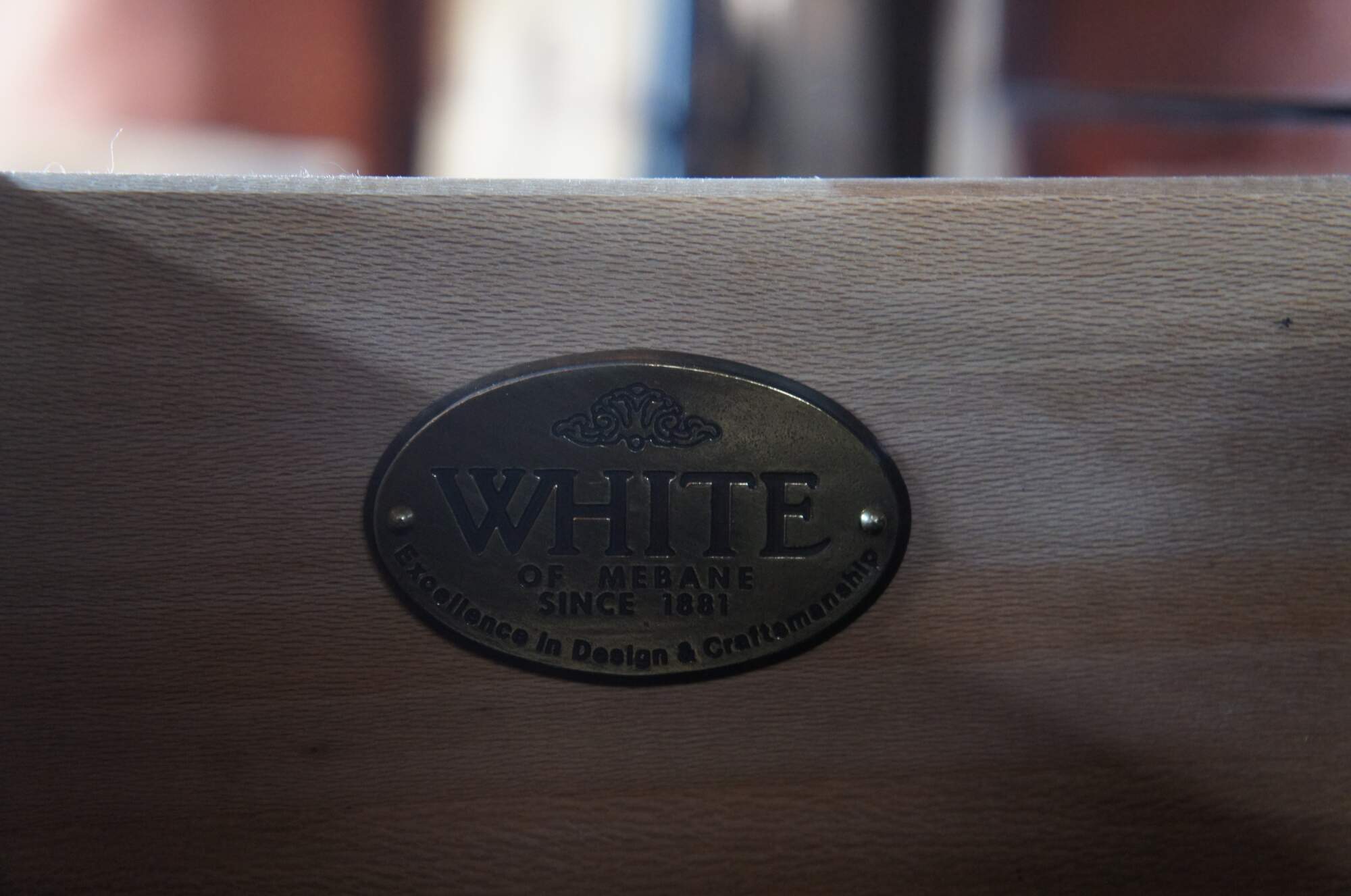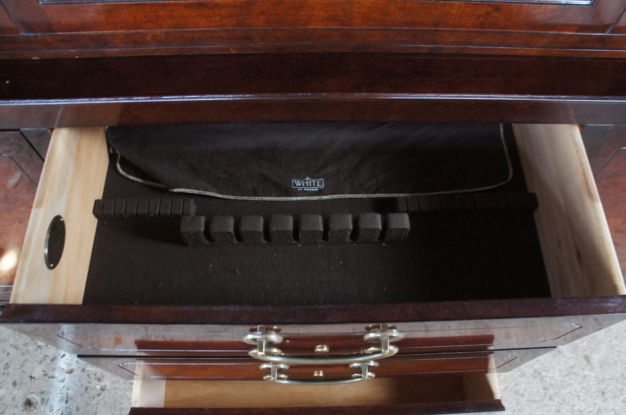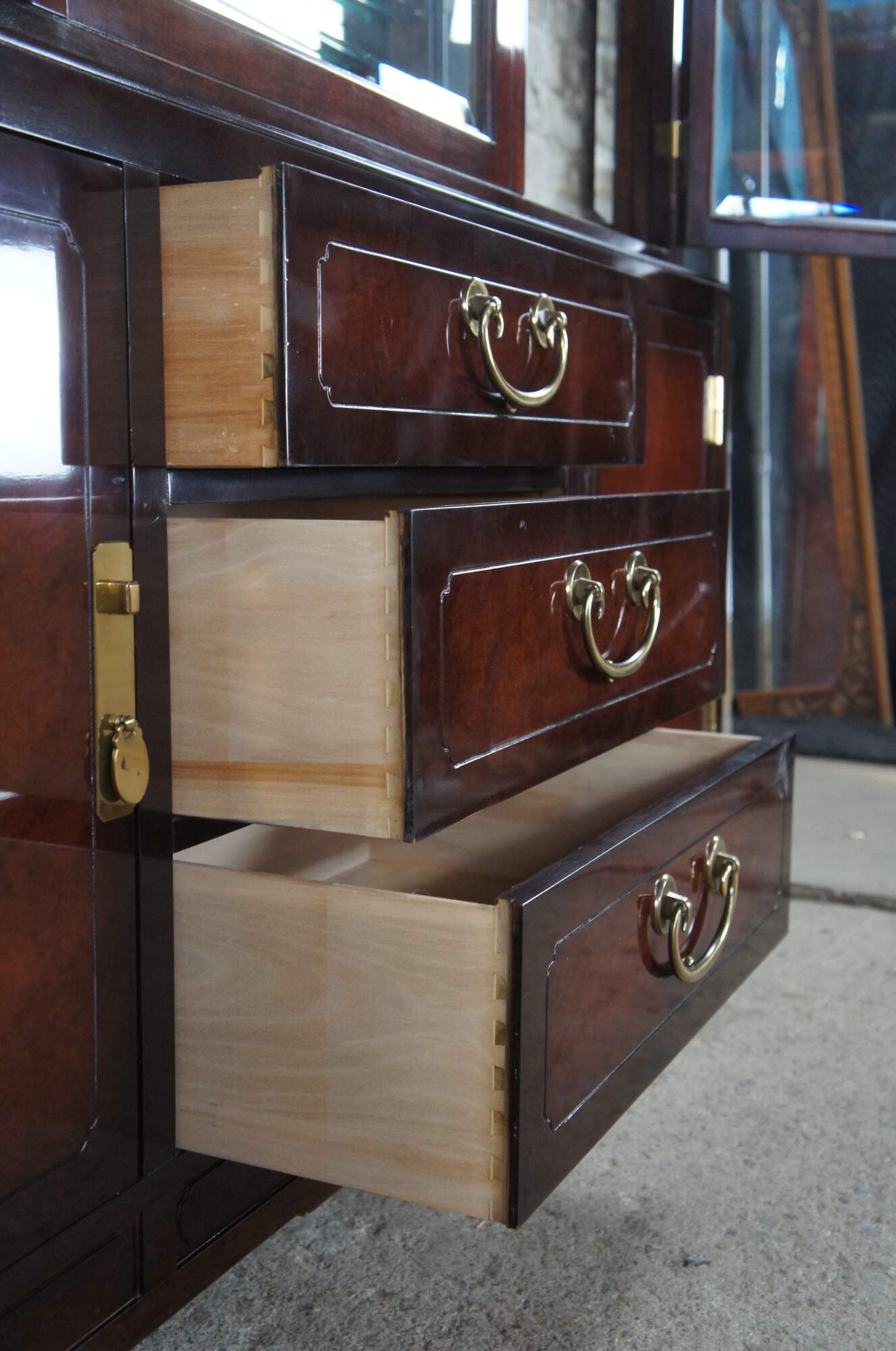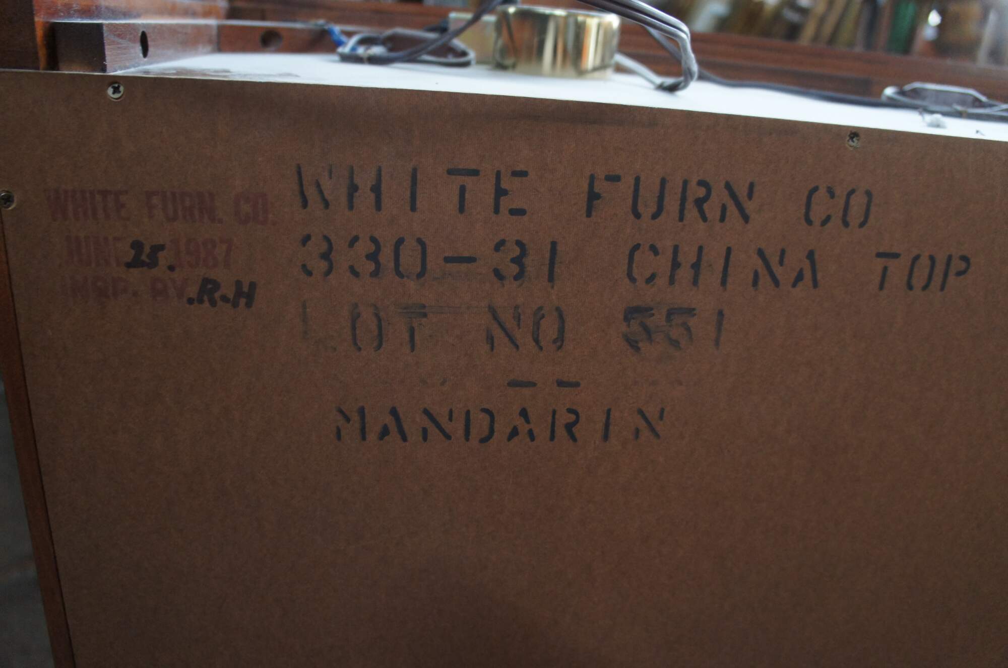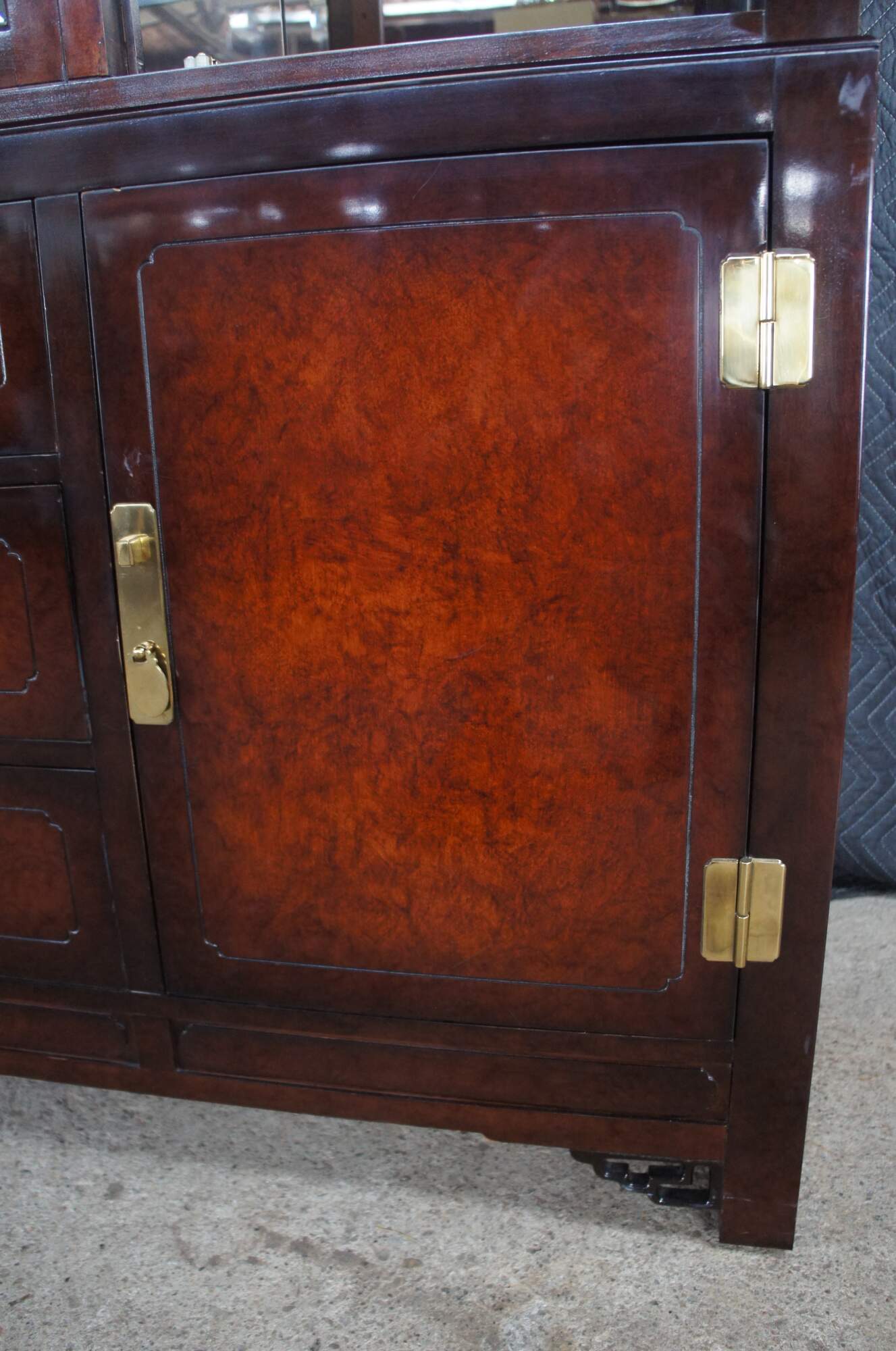 1987 White Furniture Ming Dynasty style Mandarin China Cabinet 330-31. Features a rectangular form made from mahogany and burlwood paneling with a stepback top. The illuminated top showcases beveled glass doors, a mirrored interior, and three polished glass shelves with plate grooves. 3-phase illumination is controlled by tapping the outside of the brass hardware. The buffet portion of the cabinet features three dovetailed drawers at the center flanked by outer cabinets with shelves for storage of additional service pieces. The uppermost drawer has a silverware cloth for flatware. The cabinet is accented by beautiful polished brass hardware and fretwork spandrels along the base. White Fine Furniture has been in business since the end of the 19th century and operates out of Mebane, North Carolina.
