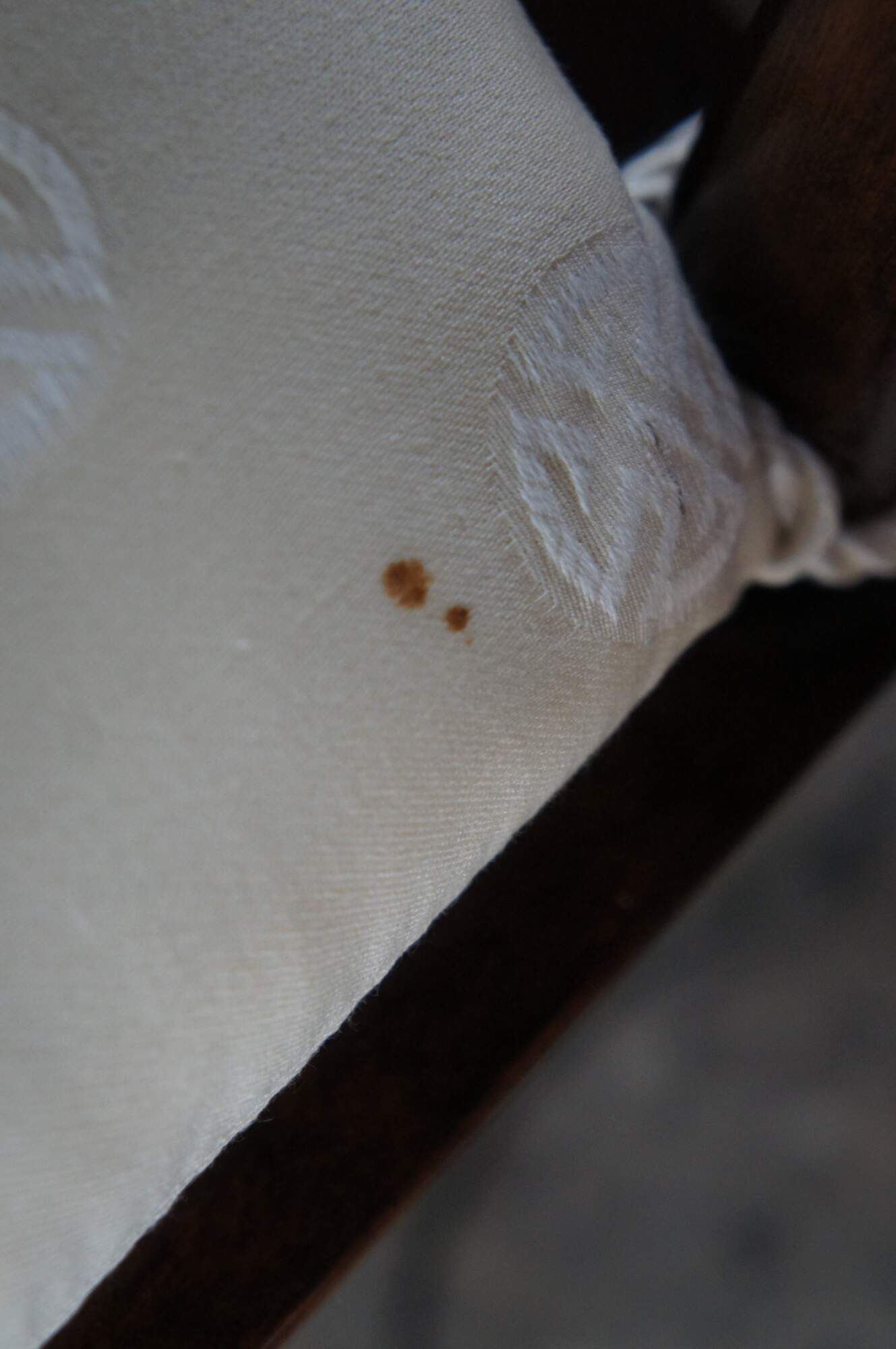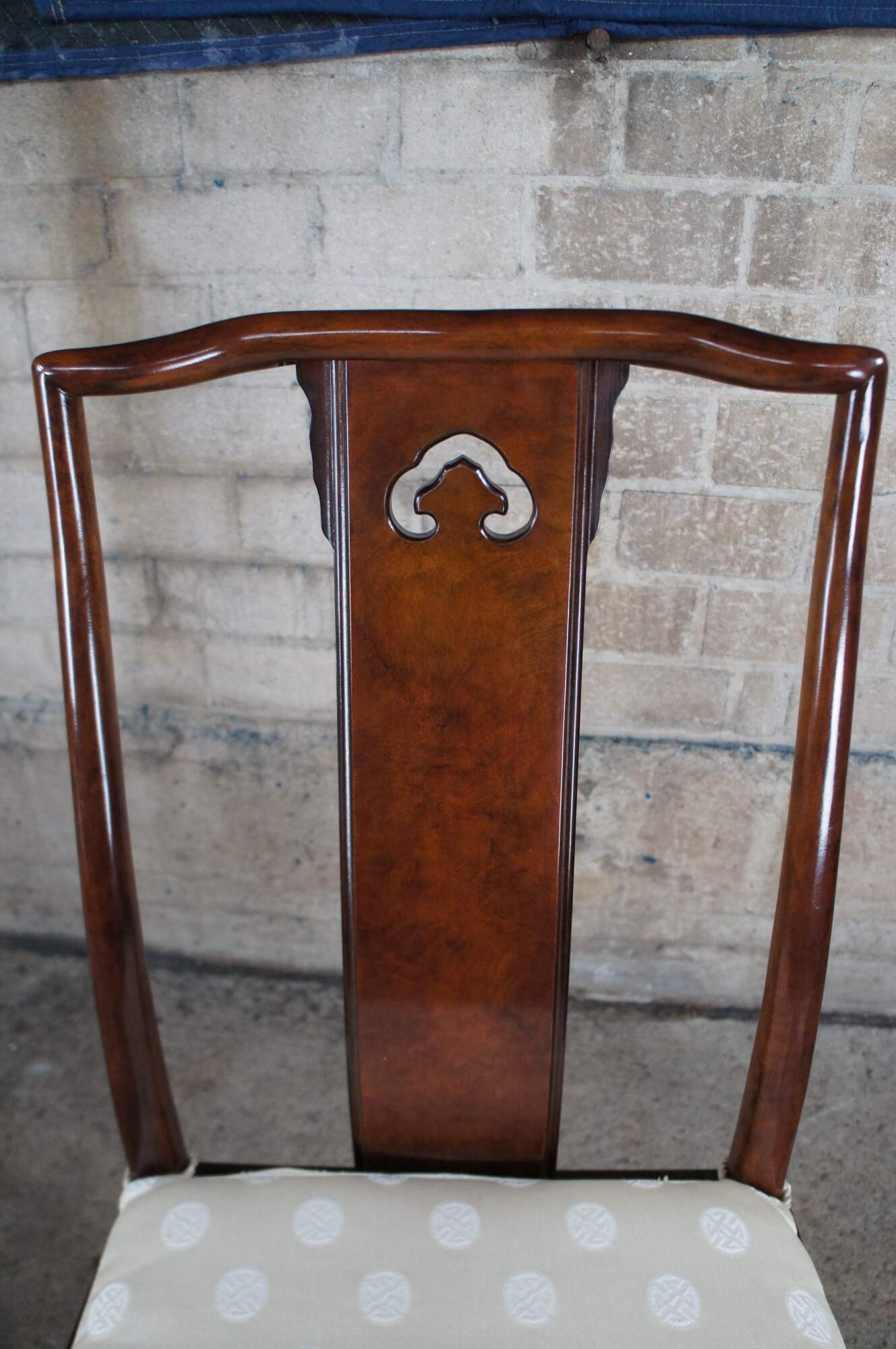 Six vintage 1980s Mandarin collection dining chairs by White Furniture. Made of mahogany and burl, with Ming style form. Featuring burled and pierced back splat and Chinese symbol upholstered cushions.