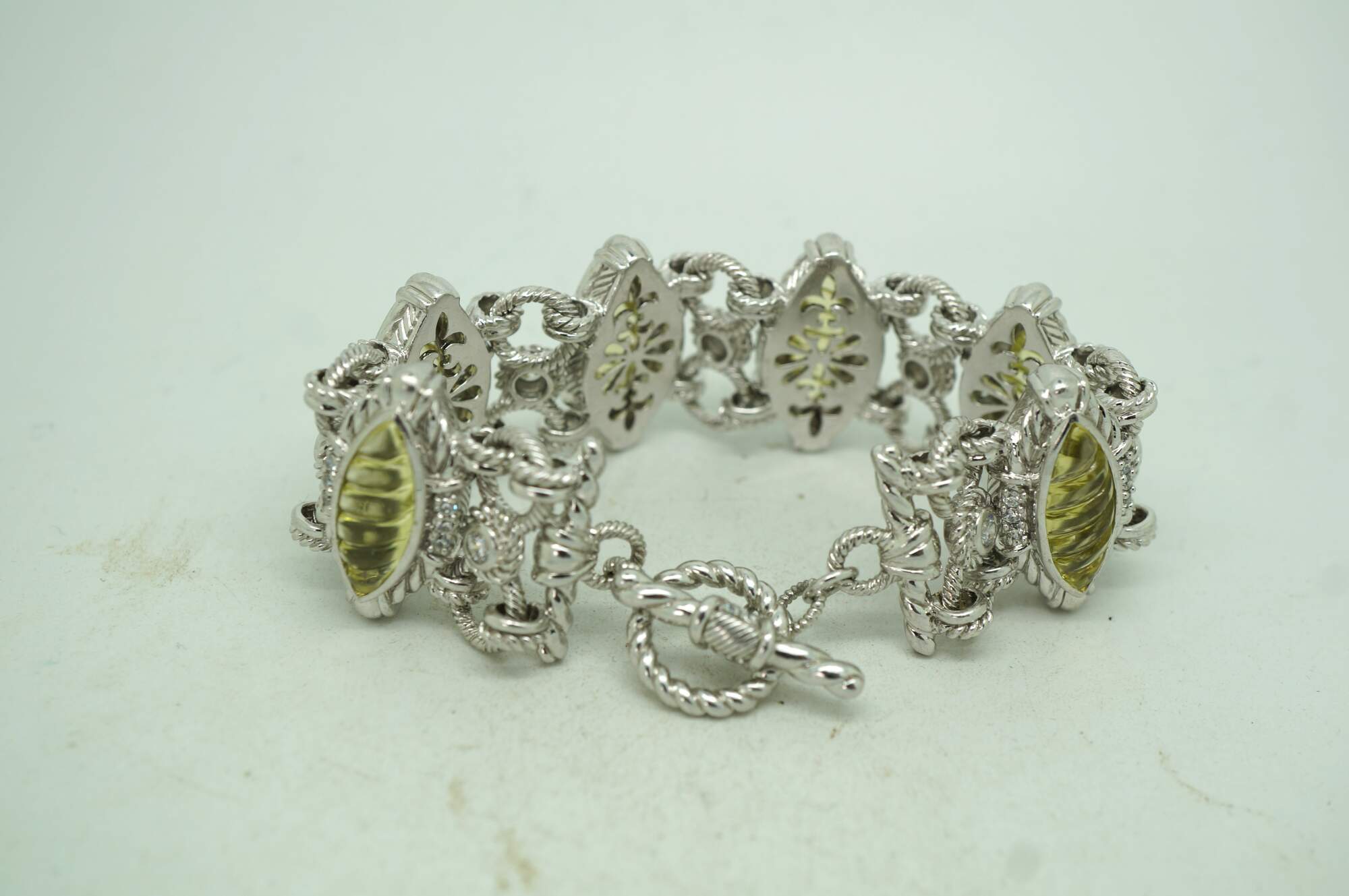 Vintage late 20th-century bracelet and earrings by designer Judith Ripka. Set includes one sterling silver bracelet - toggle clasp, chain link, featuring rope twisted accents and alternating white cubic zirconia and pale green, almond shaped, swirl carved gems; and a pair of clip on sterling silver earrings with crossed rope twist pattern accented with white cubic zirconia and cultured pearl dangles.