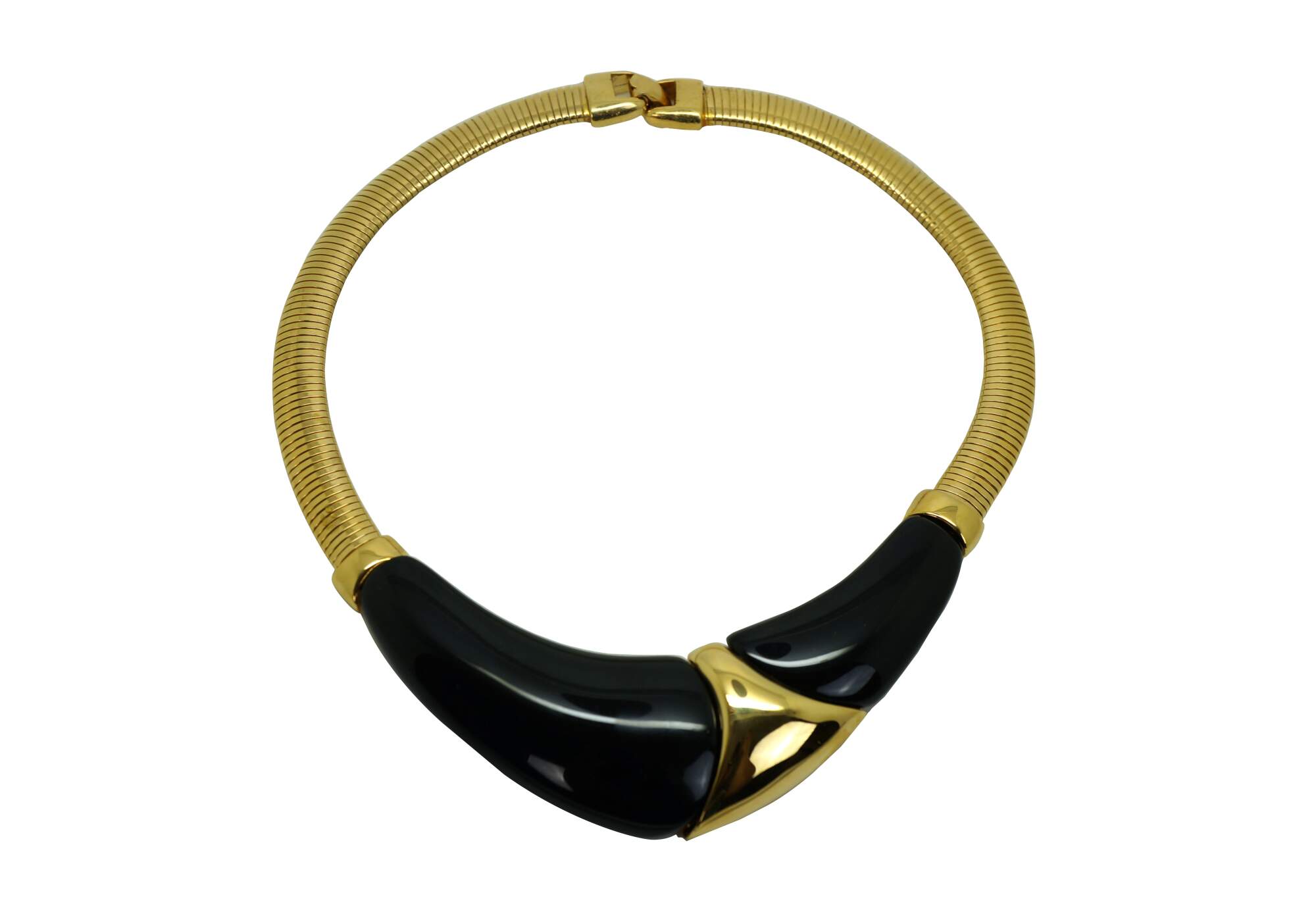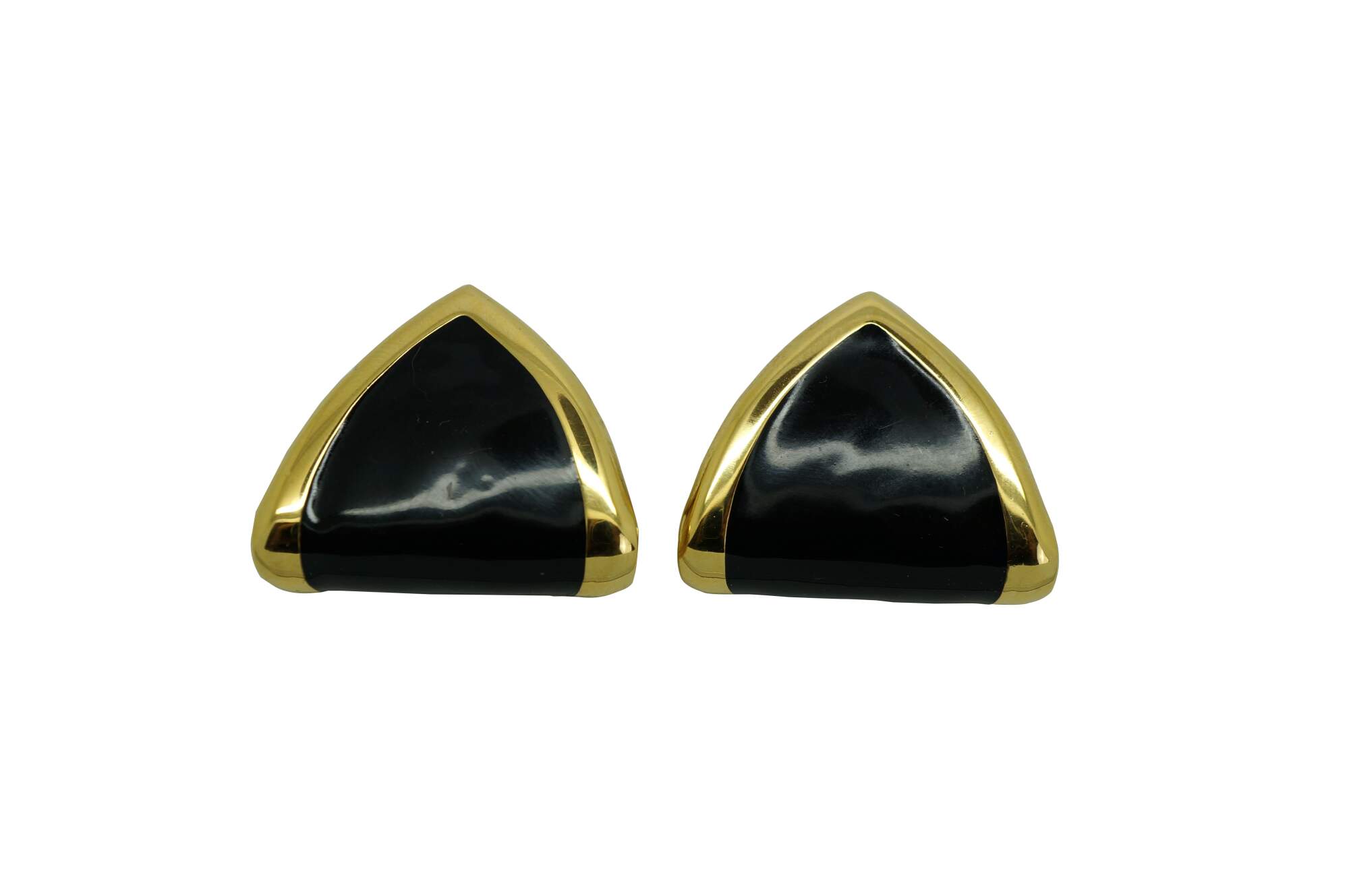 Circa 1980's Napier black and gold modernist necklace and earring set. The triangular design of brightly polished gold-tone metal and black lacquer. Snake chain. Post back earrings. Includes storage box.