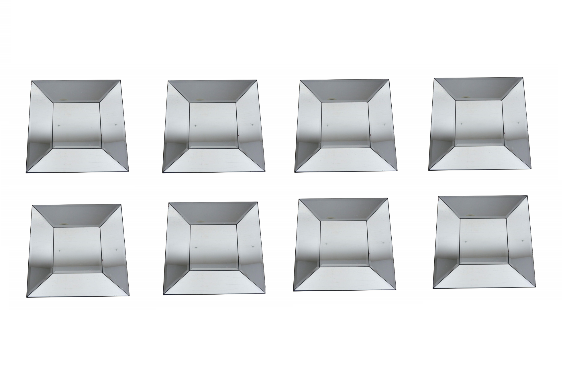 Set of eight Pottery Barn square wall mirrors featuring a faceted, deep beveled design, with subtle factory distressed silver loss at the edges. Black wood backs.