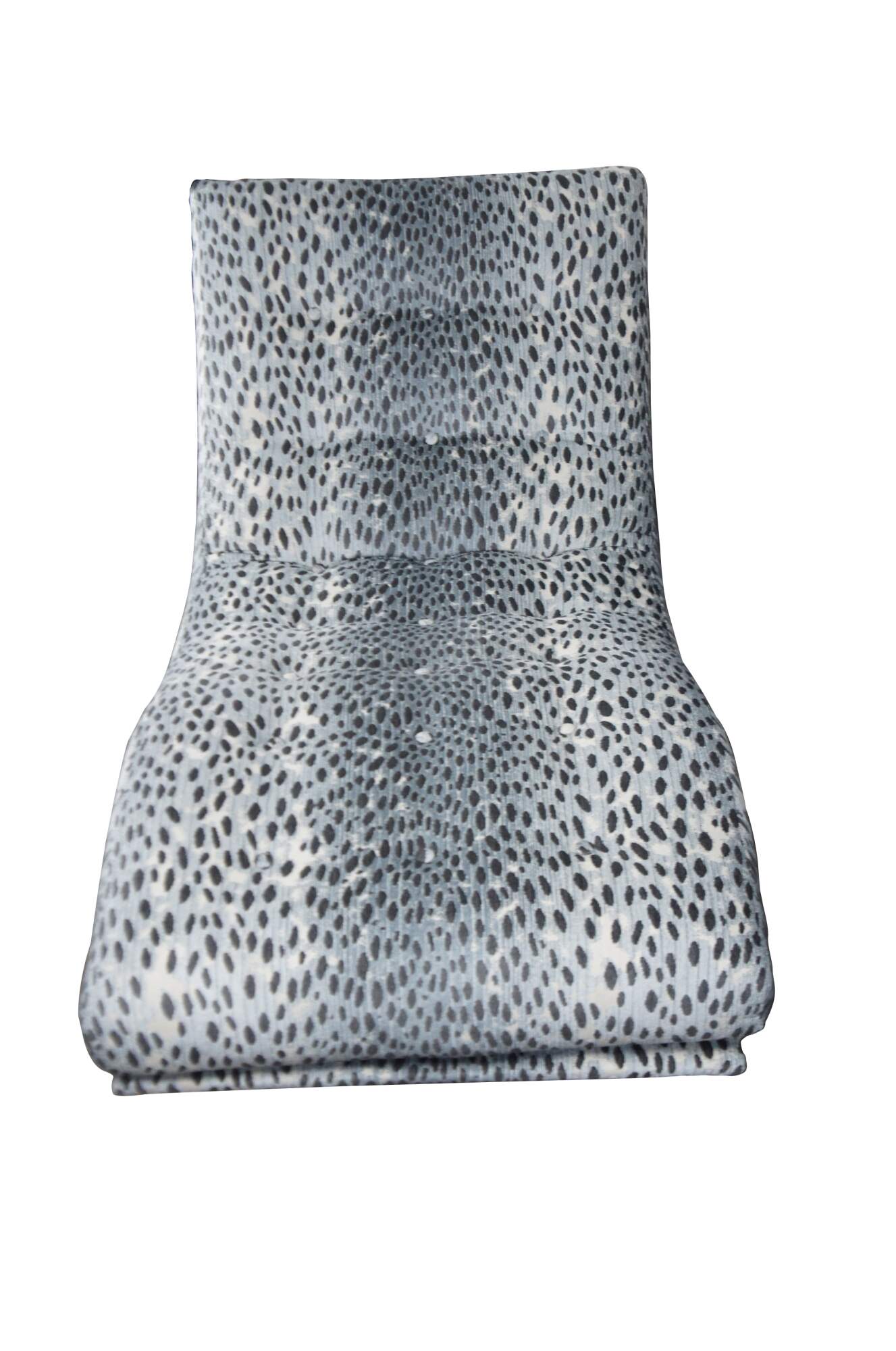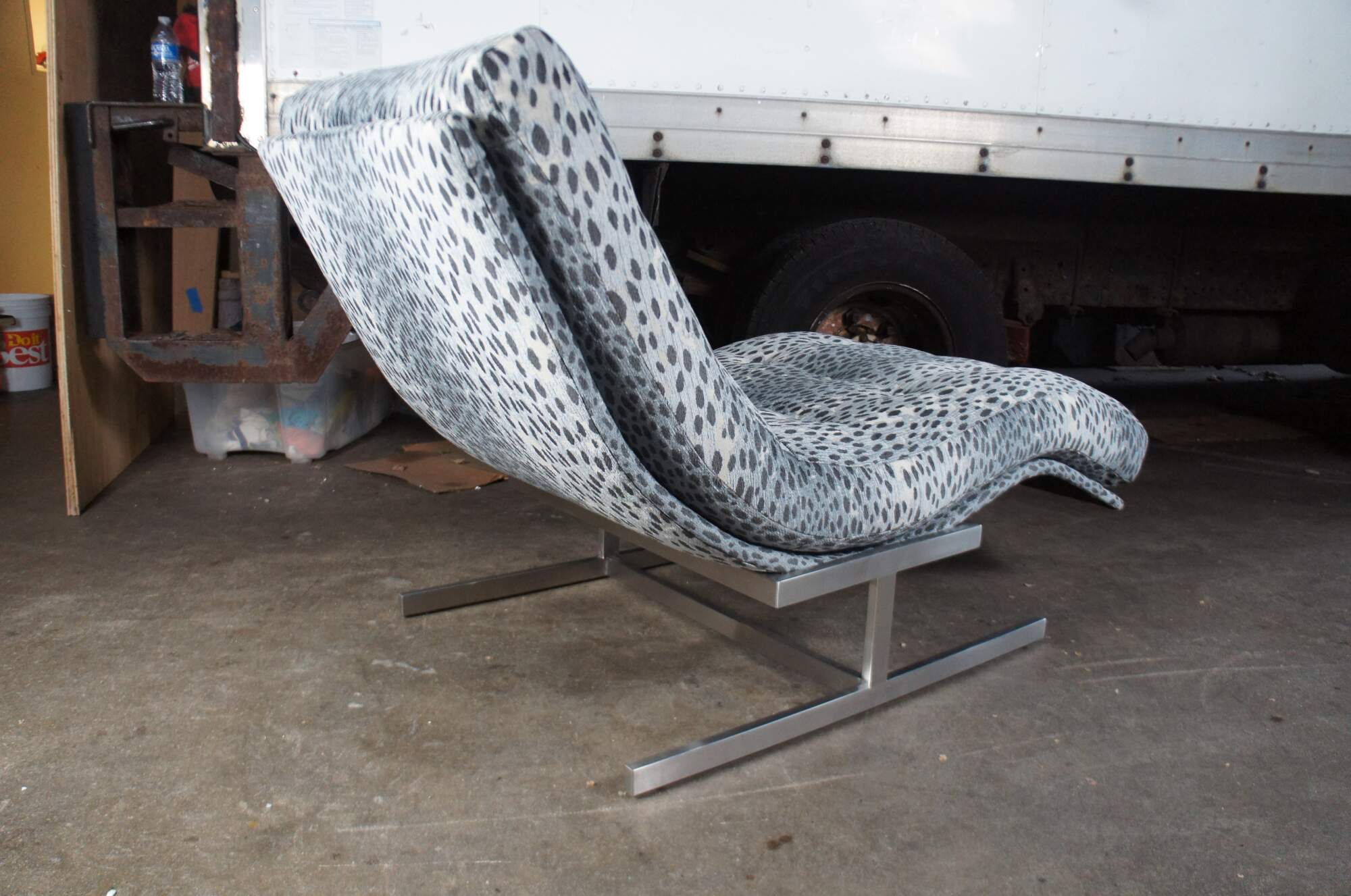 Jessica Charles 323 Hug Chaise, circa 2019. Features a sculptural modernist body with leopard sprint upholstery over a stainless steel base.