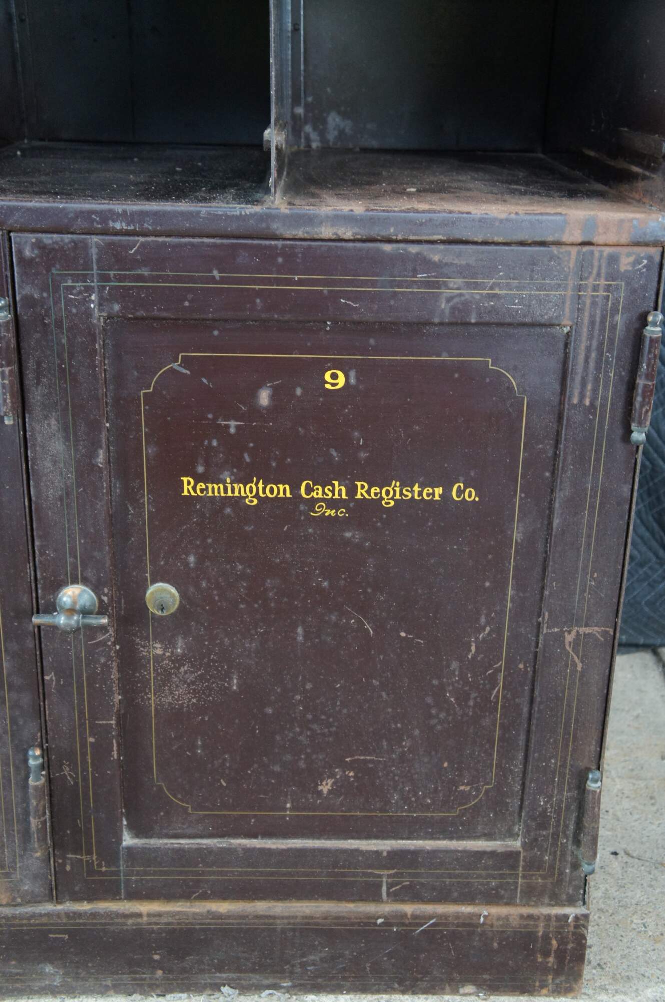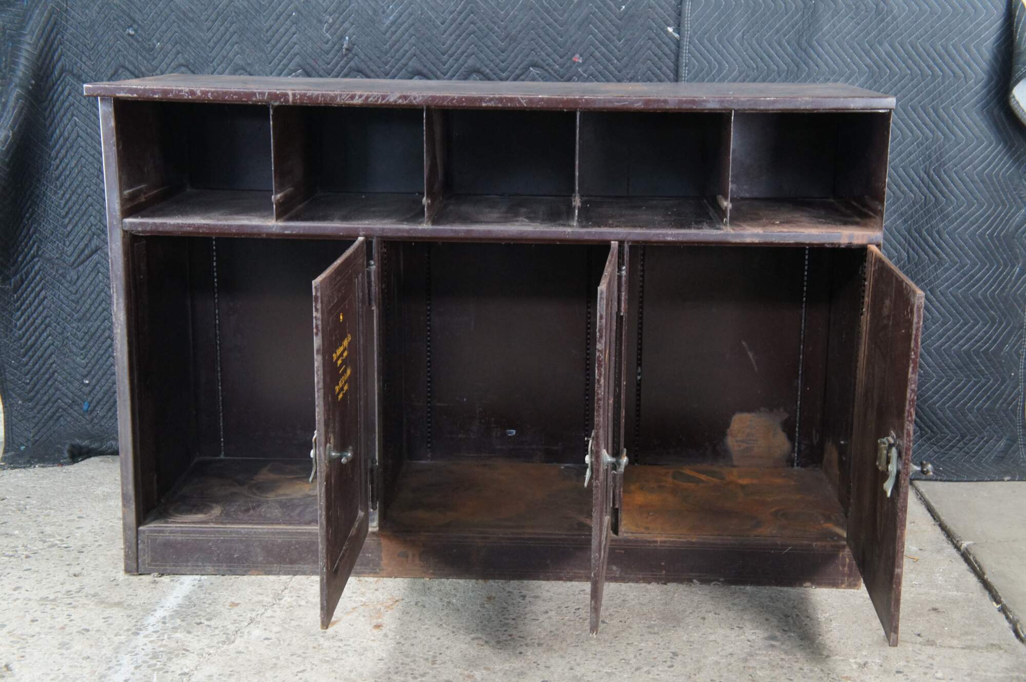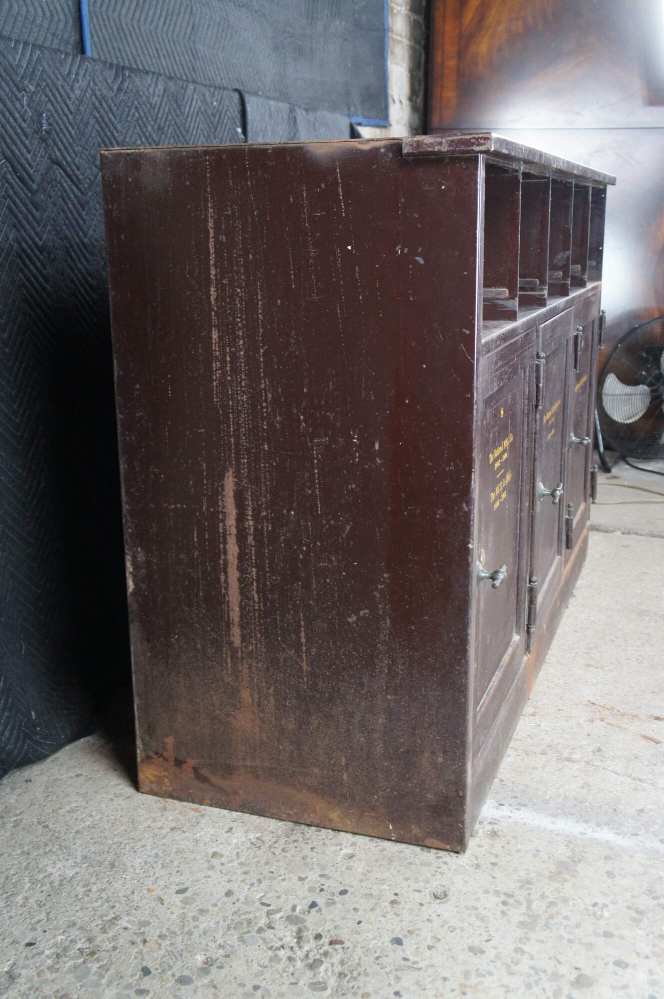 Rare antique fireproof catalogue storage cabinet from NCR headquarters in Dayton Ohio. This cabinet was part of the original corporate offices and were salvaged from the top floor before demolition. It features top cubbies and three lower safes.