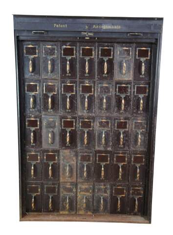 Rare antique fireproof patent / assignment / card / index / courthouse catalogue file cabinet from NCR headquarters in Dayton Ohio. This cabinet was part of the original corporate offices and were salvaged from the top floor before demolition. It features 35 apothecary style pull out drawers and a roll down tambor door (not currently functional).