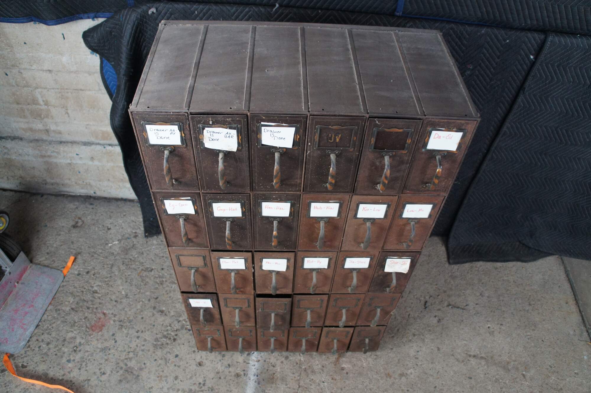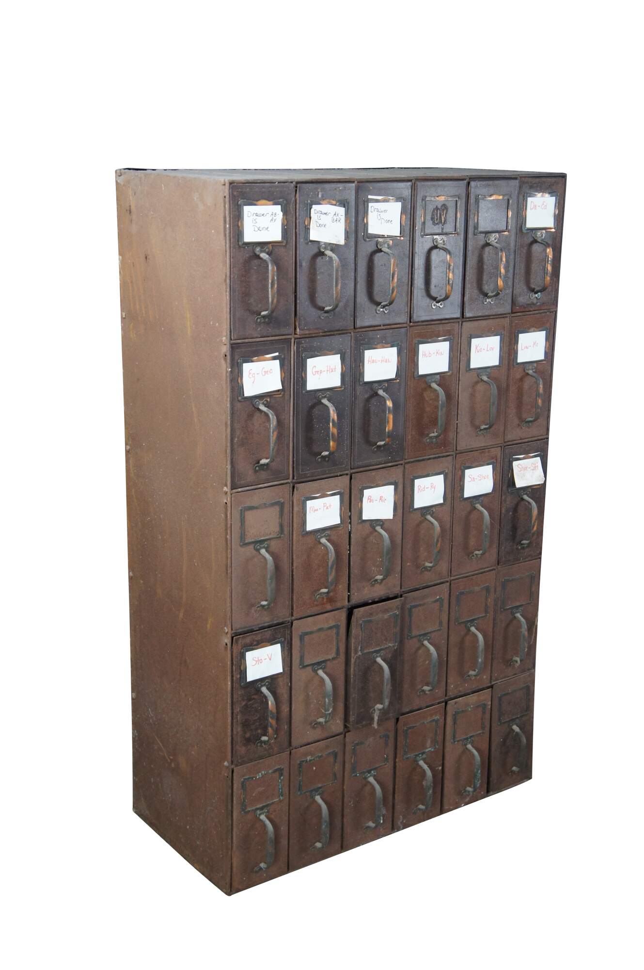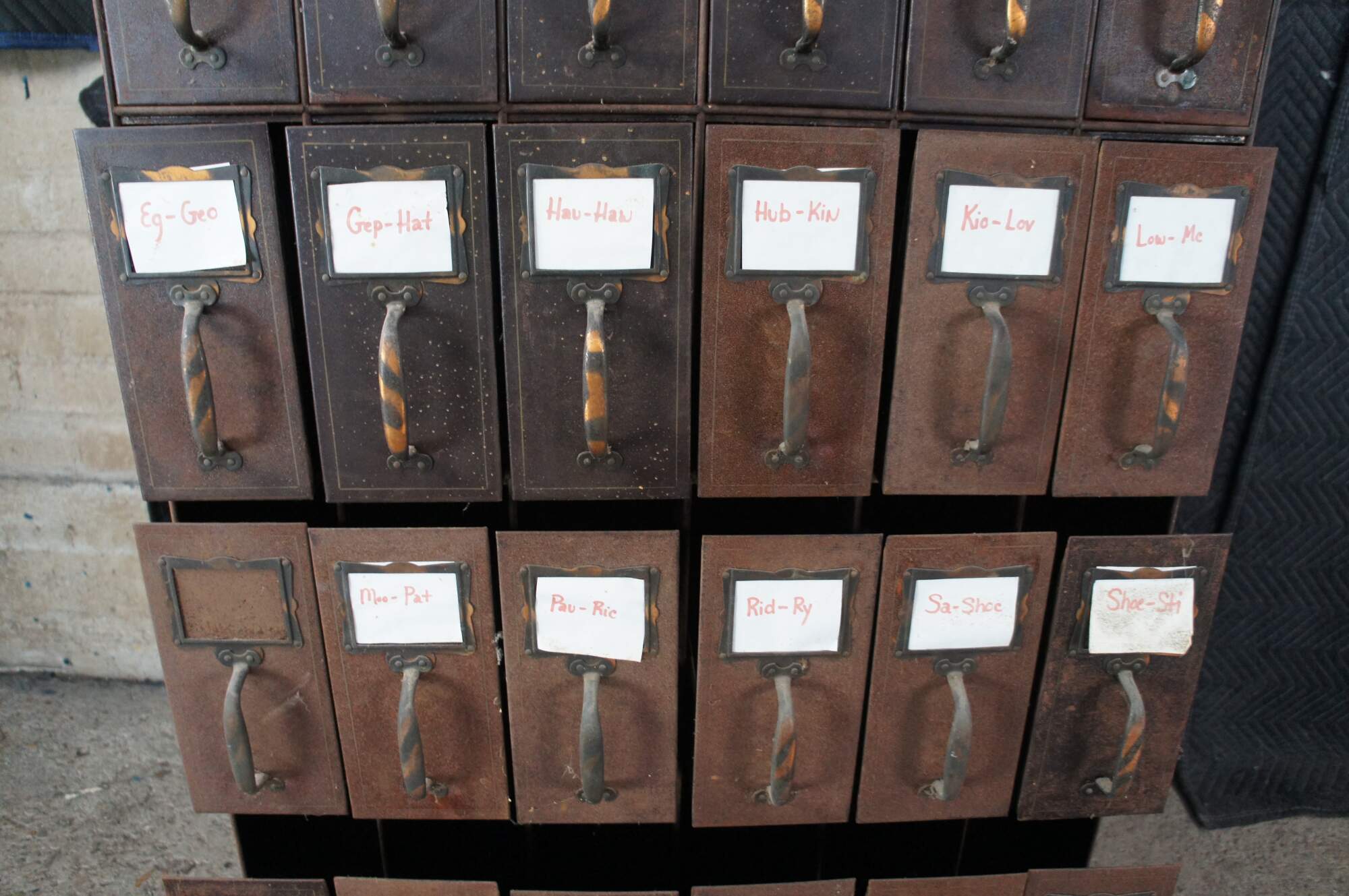 Rare antique fireproof card / index / courthouse file catalogue cabinet from NCR headquarters in Dayton Ohio. This cabinet was part of the original corporate offices and were salvaged from the top floor before demolition. It features 30 apothecary style pull out drawers and a roll down tambor door (not currently functional).