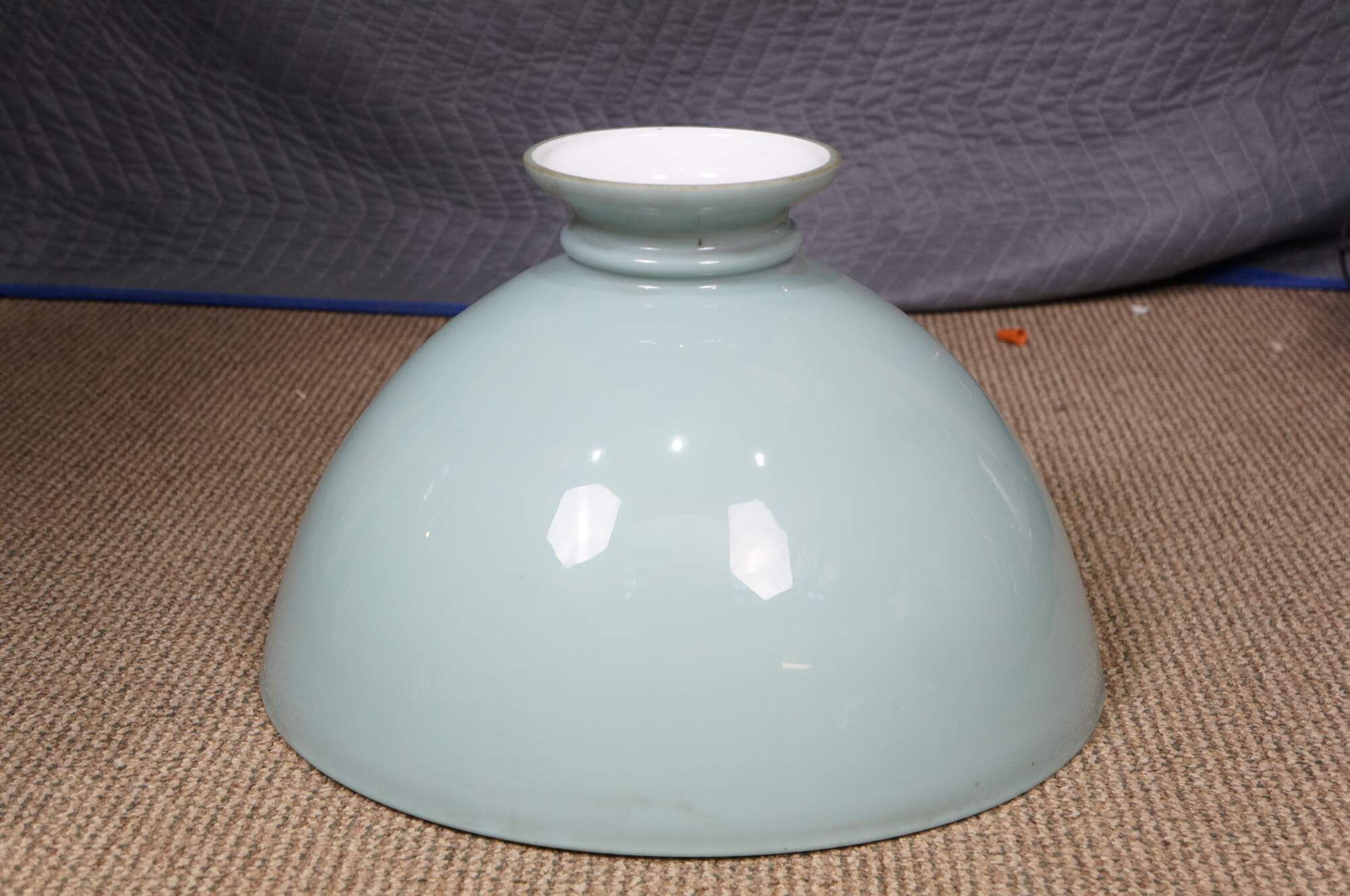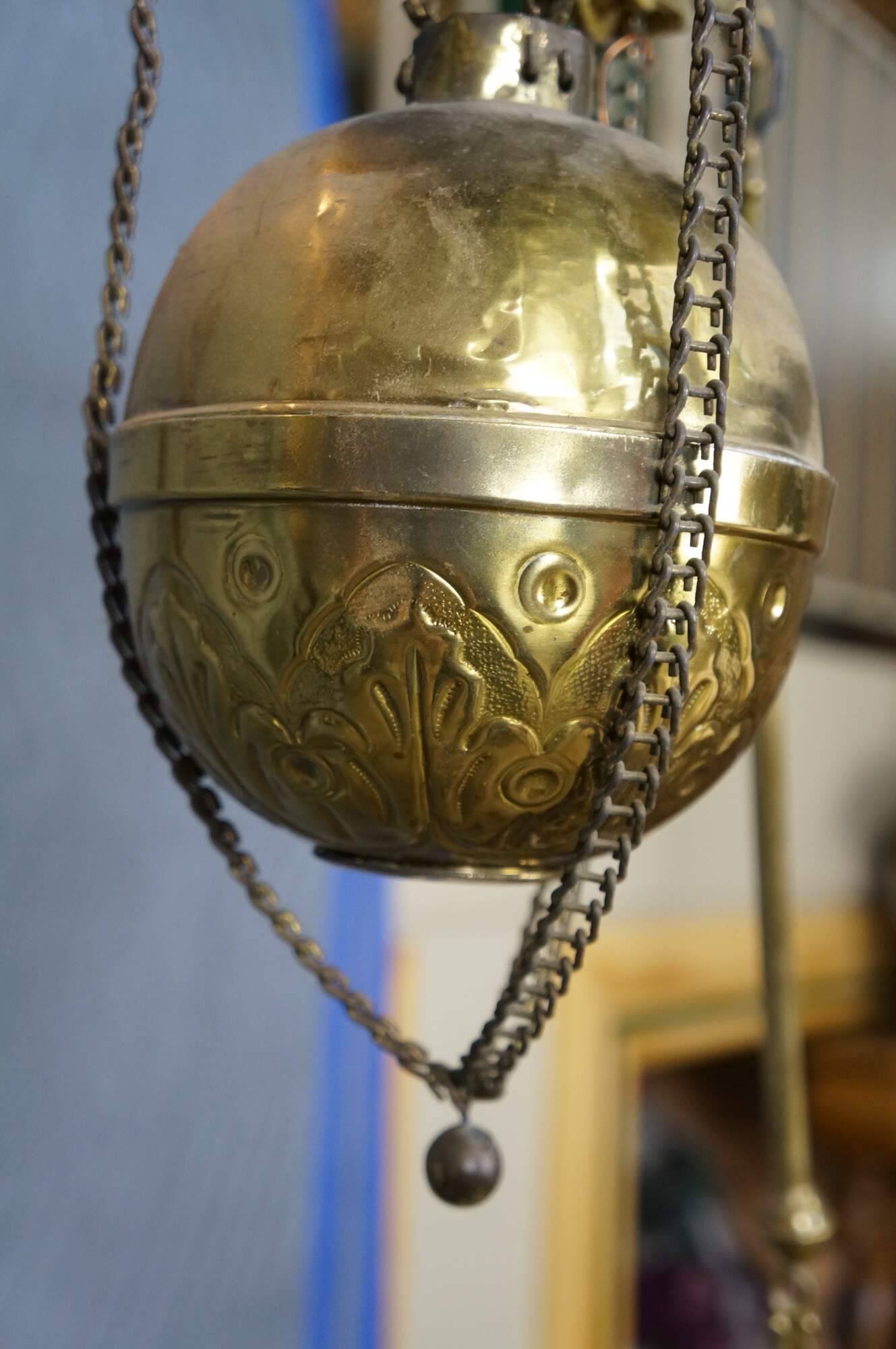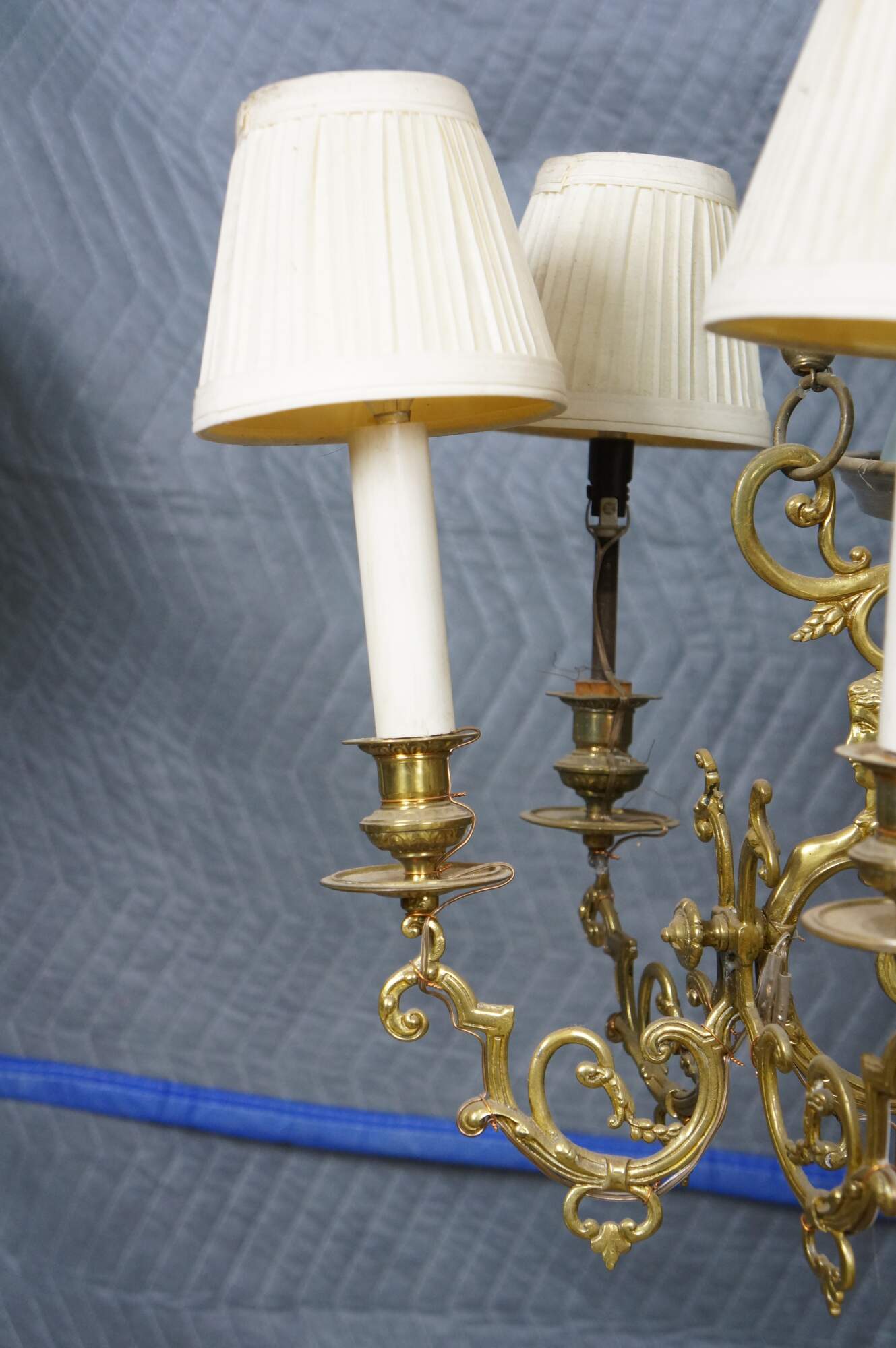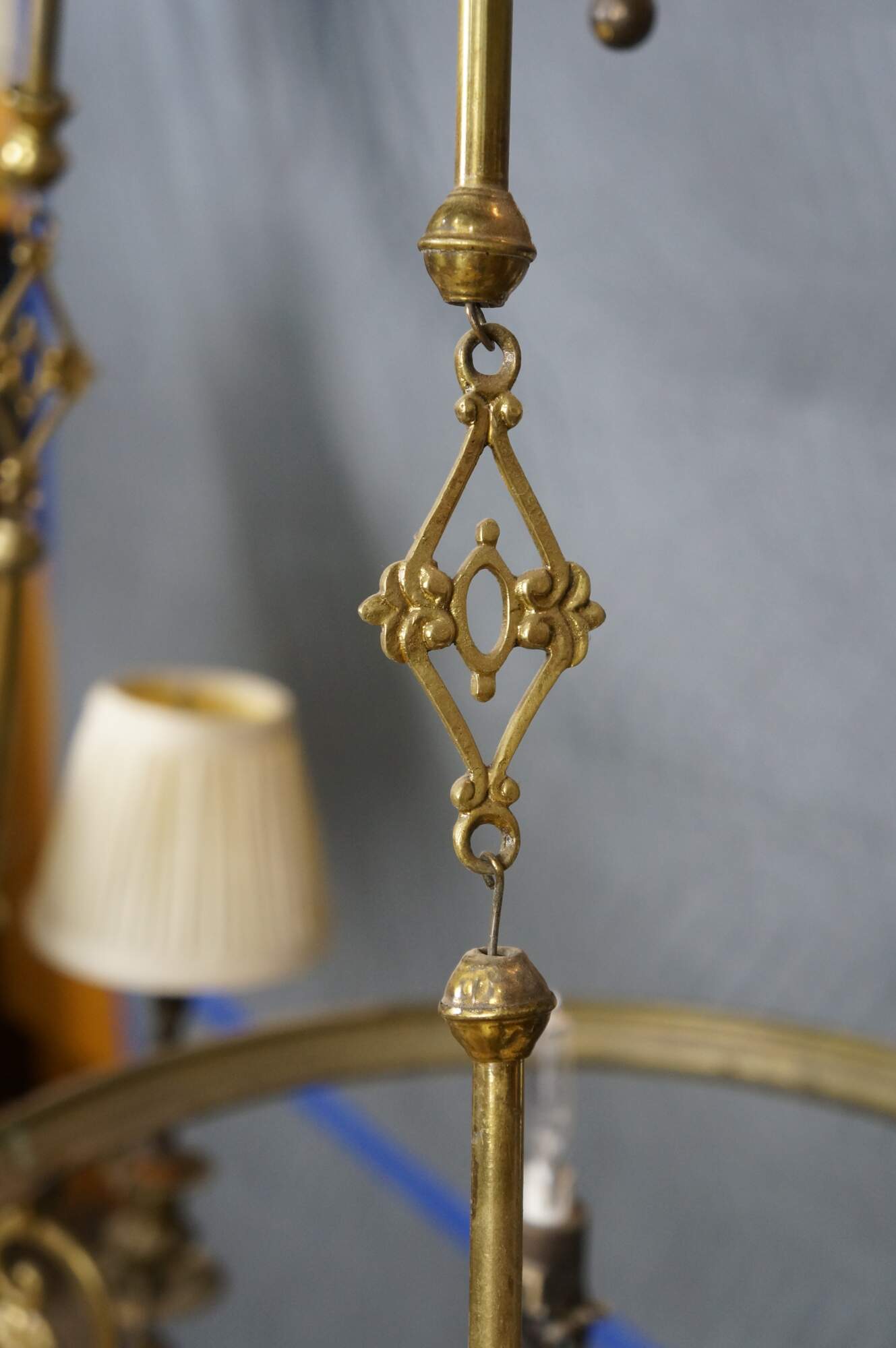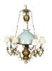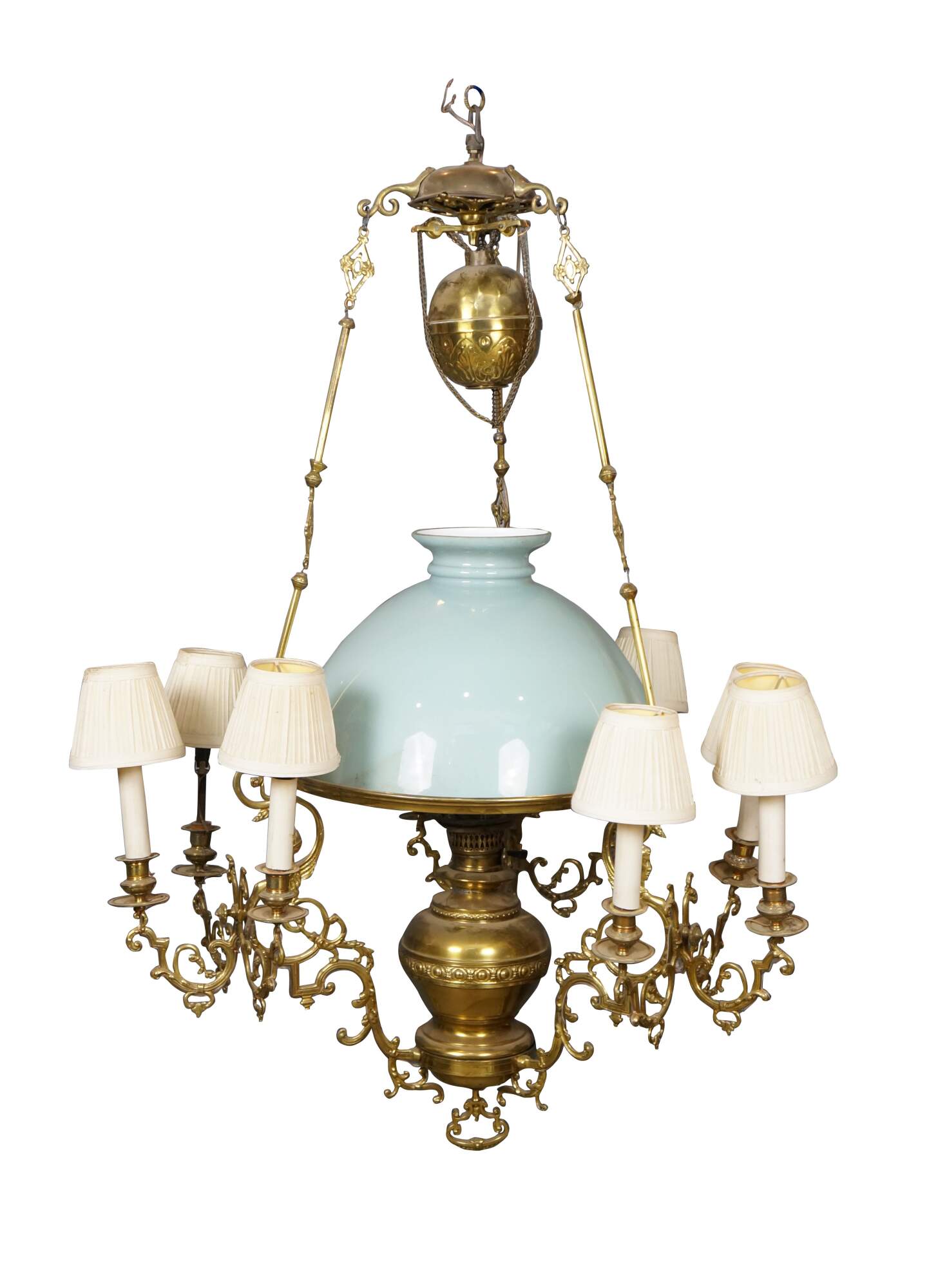 Late 19th century converted nine arm candle and oil lamp / lantern / chandelier. Made of brass with intricate scrollwork arms studded with Sphinx heads. Central bulb is shaded with a celadon glass shade. Includes nine cloth shades for faux candles. Hardwired.