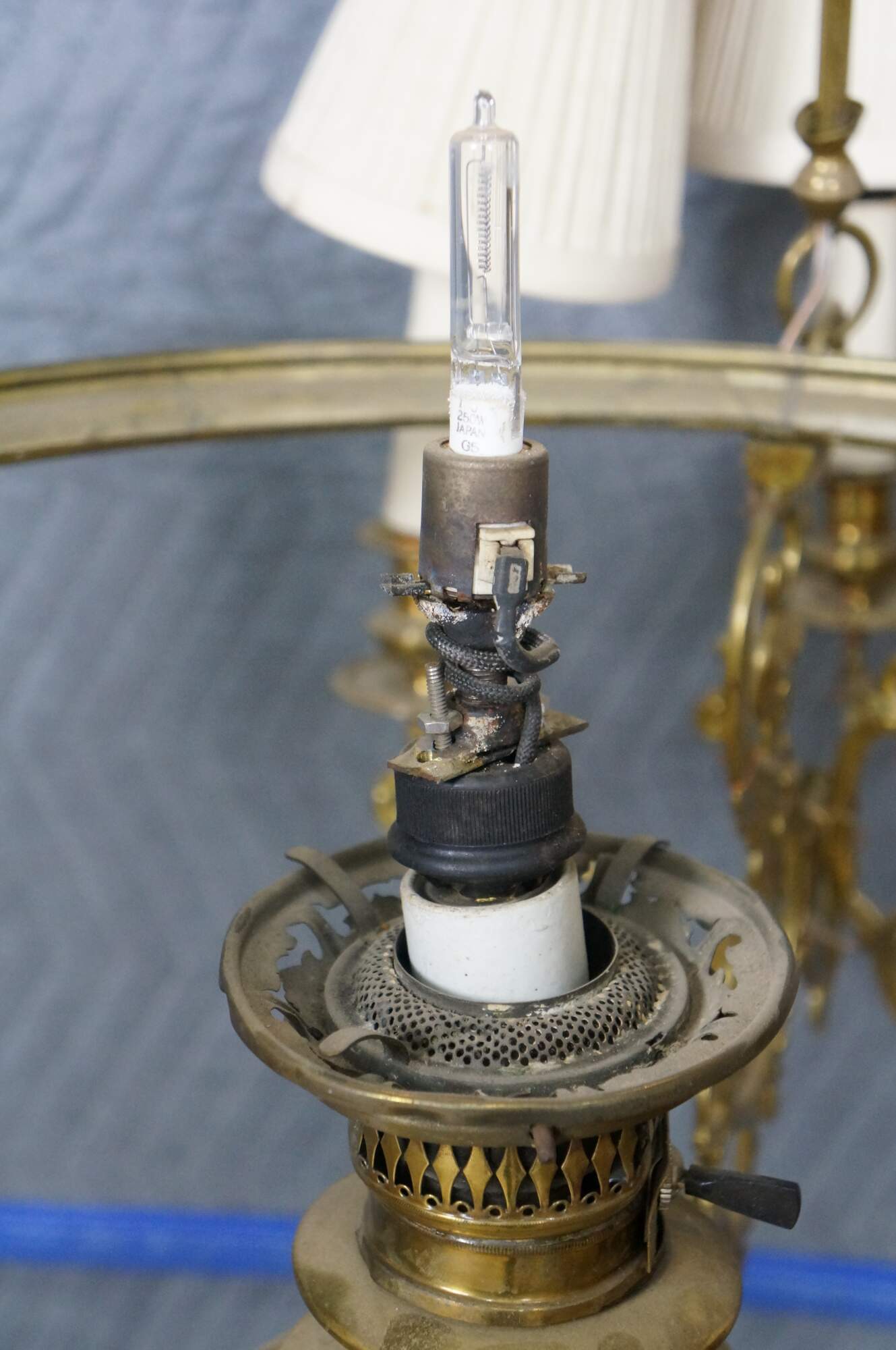 Good Overall; tested, working; tarnish; some bent arms; damage to shades; missing one candle cover; no hurricane; oil lamp shade previously adjustable but missing pieces.