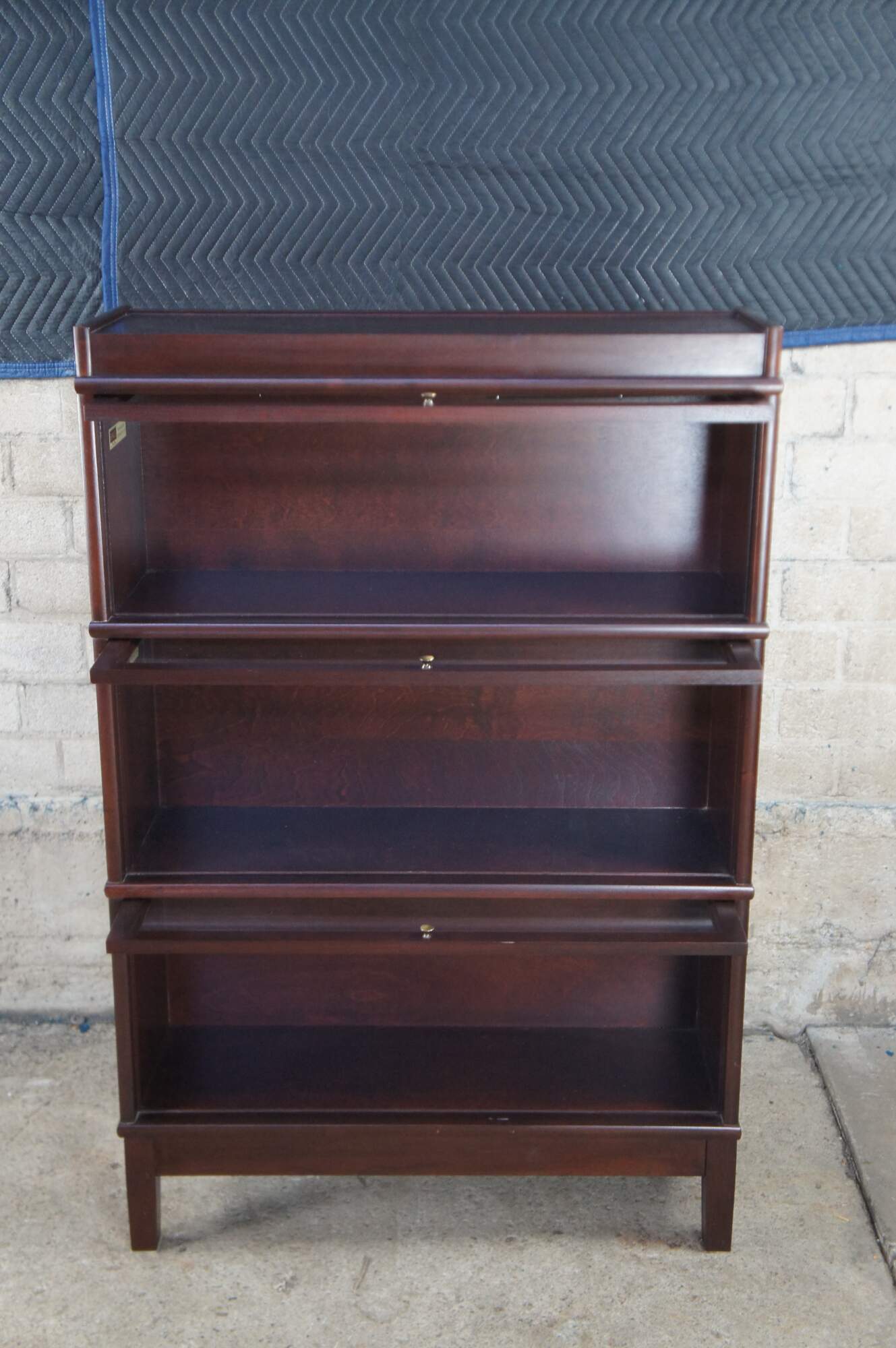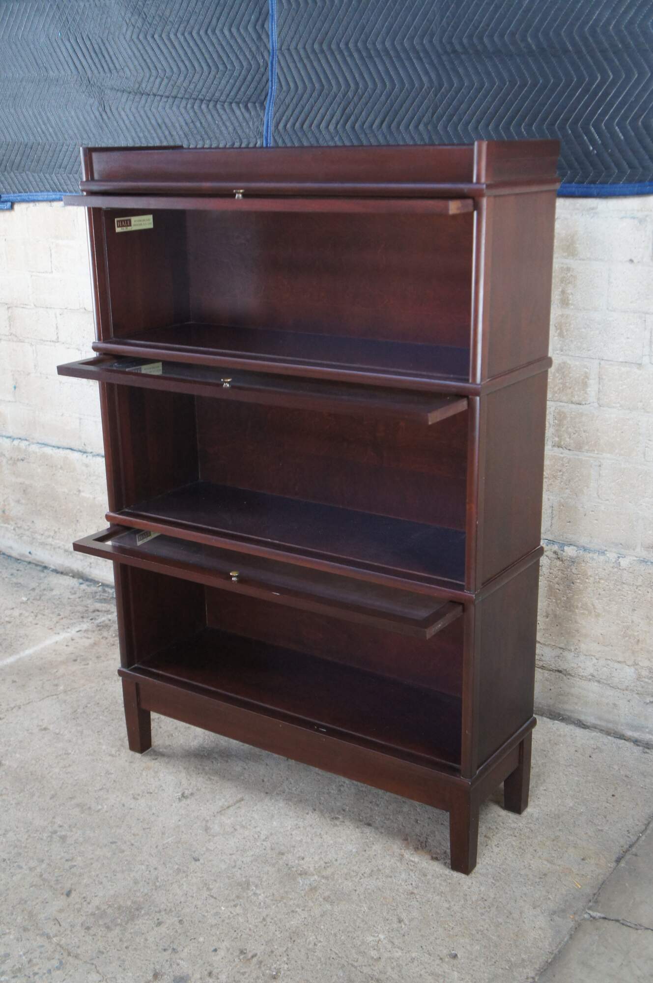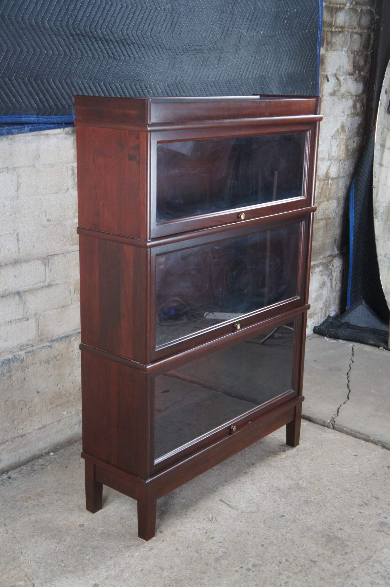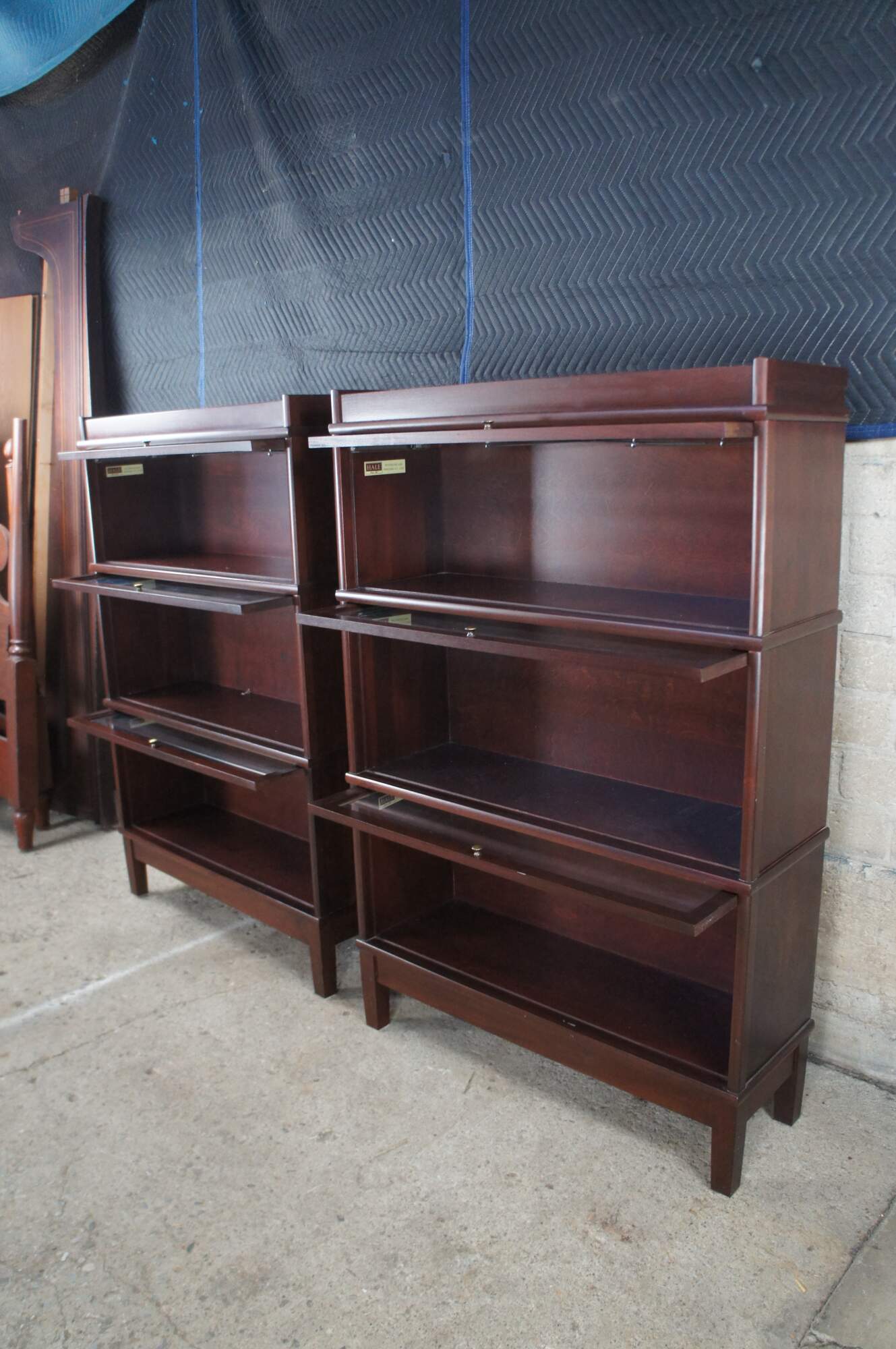 Pair of Late 20th Century Hale Industries Barrister Lawyer Stacking Bookcases. Classic Mission styling. Made from walnut with #168 mahogany finish. Features three glass display sections with brass handles.