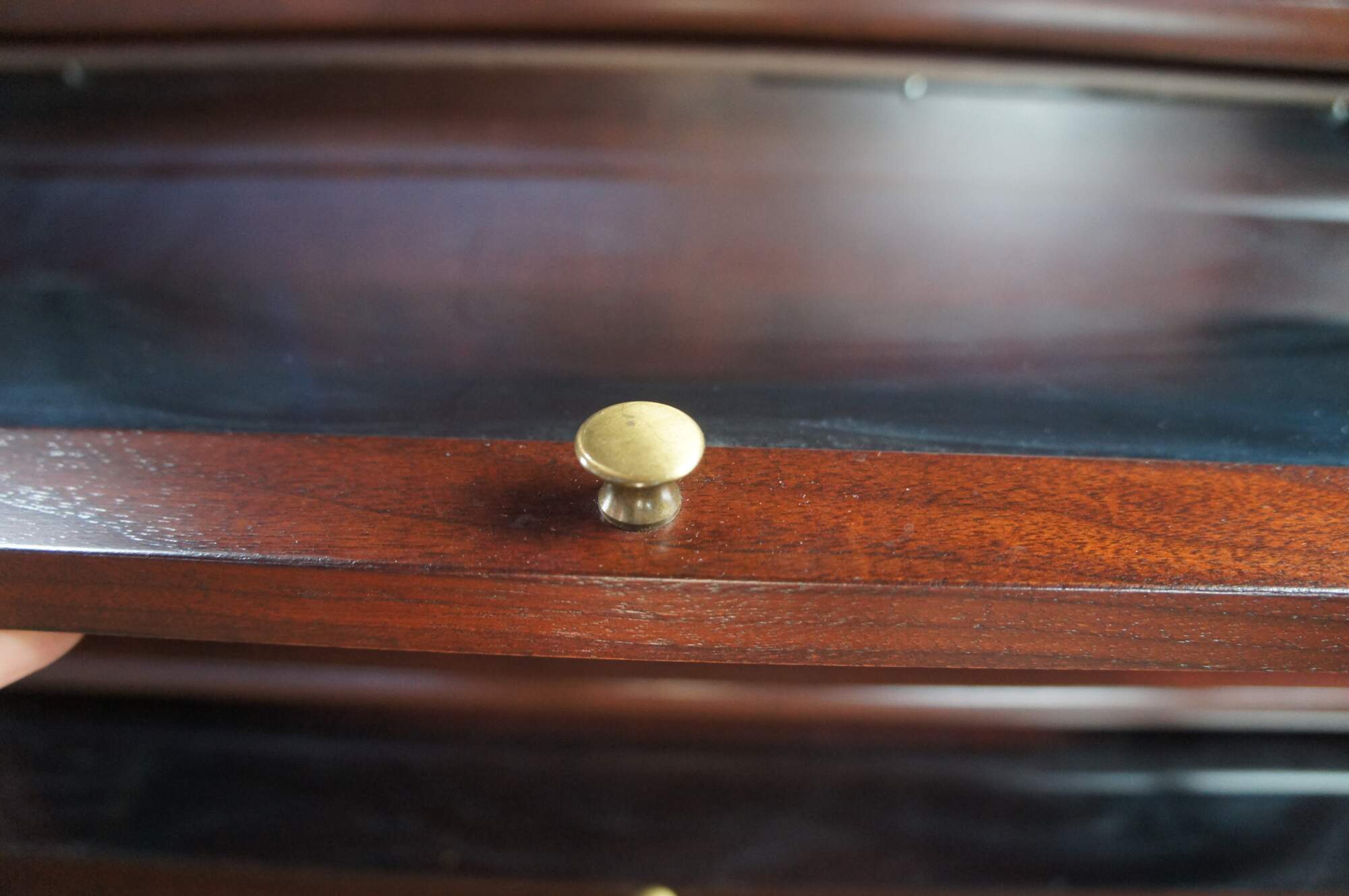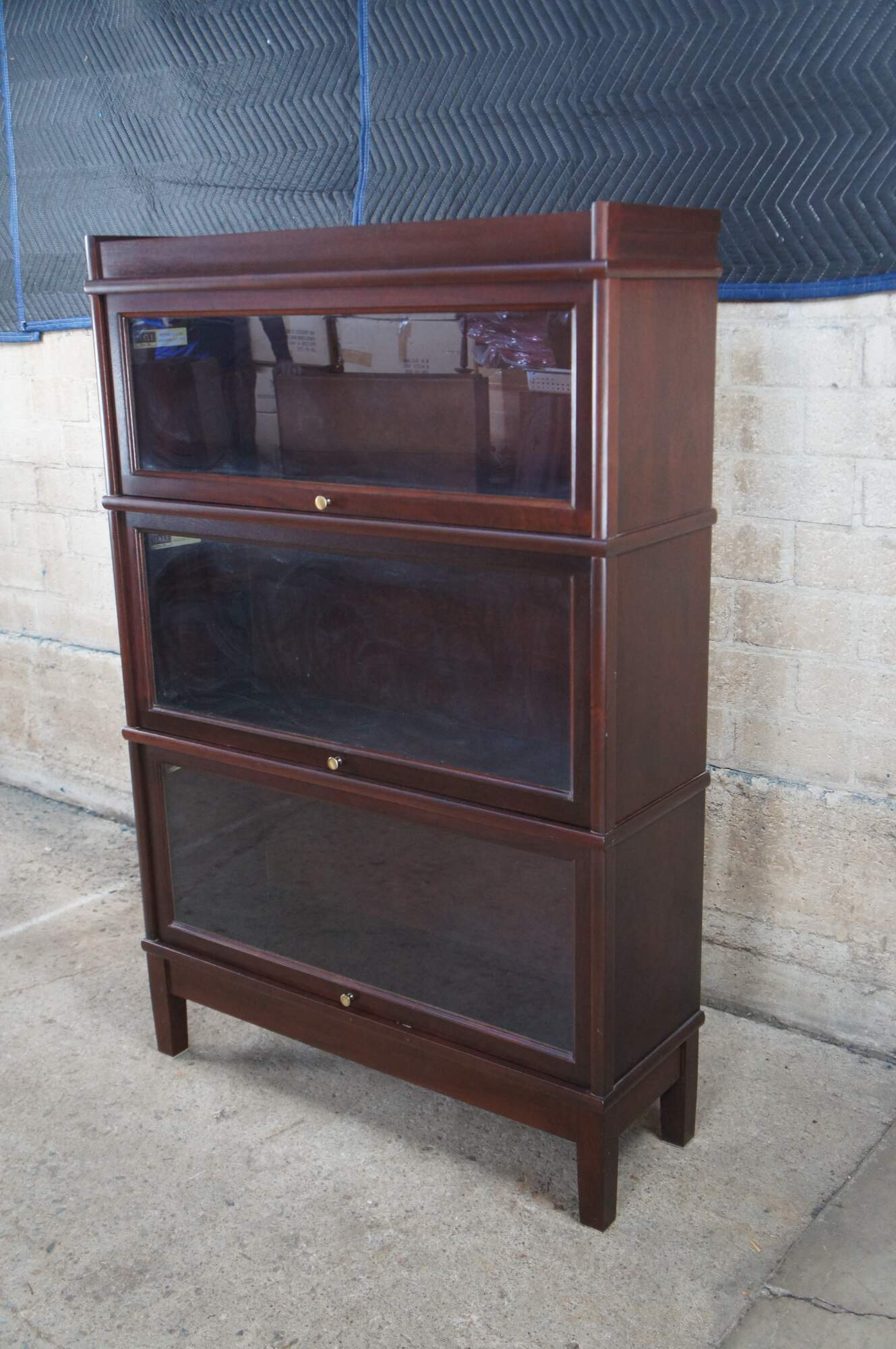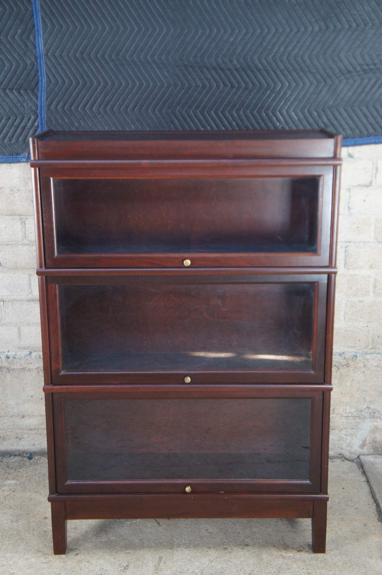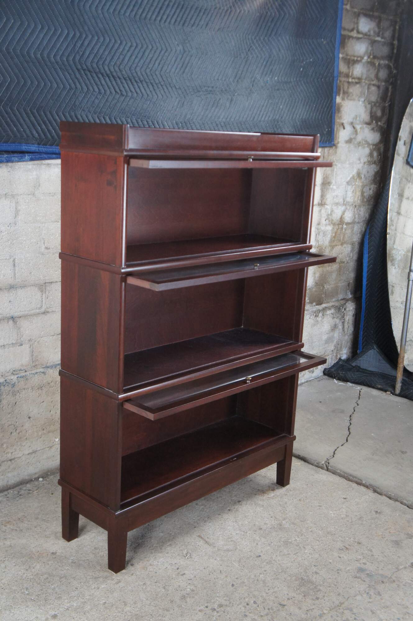 Pair of Late 20th Century Hale Industries Barrister Lawyer Stacking Bookcases. Classic Mission styling. Made from walnut with #168 mahogany finish. Features three glass display sections with brass handles.