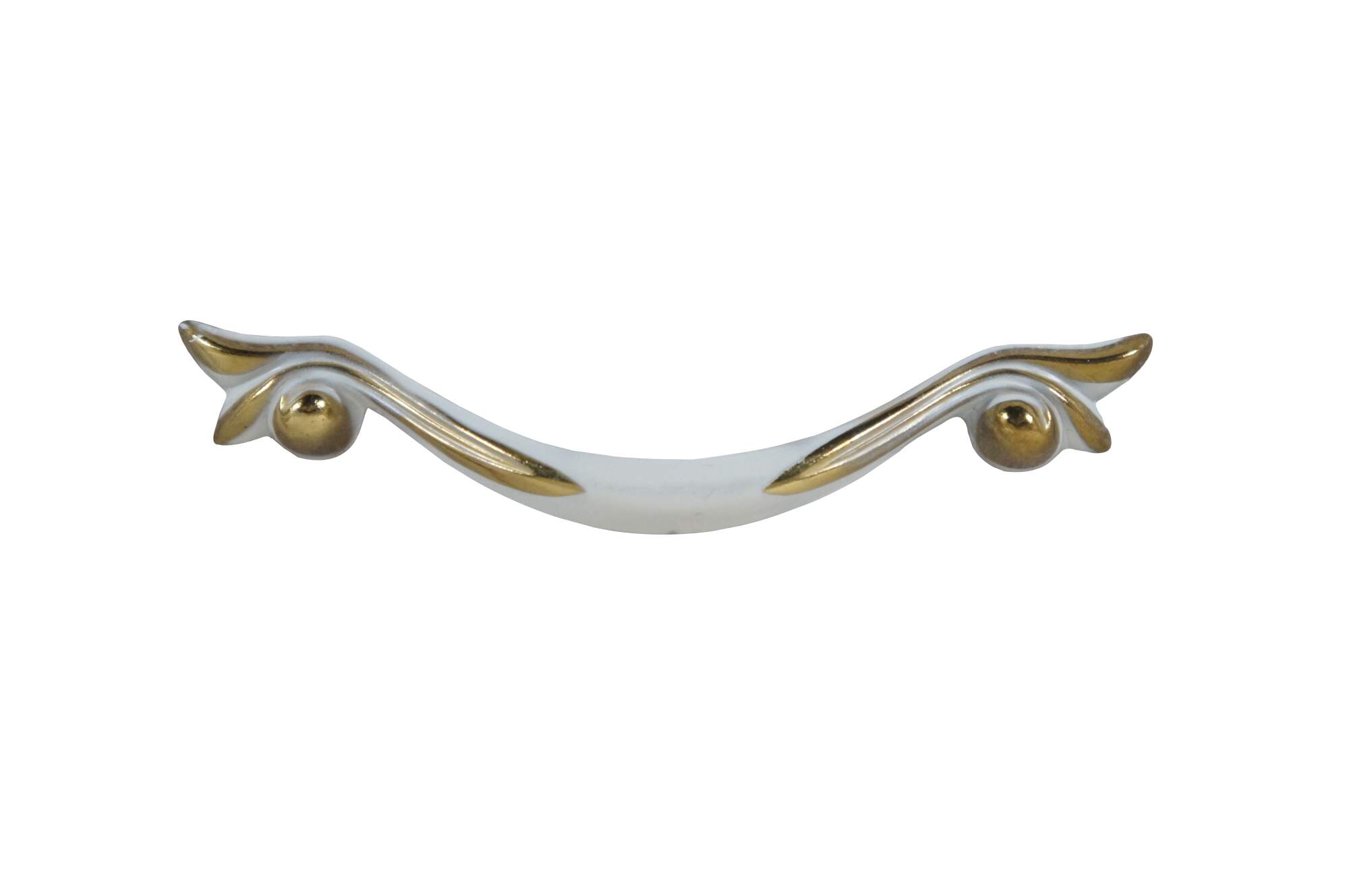 19 Available - Mid to late 20th century old-stock die cast drawer / cabinet pulls. National Lock Company - Medalist, item number C674 "French Classic" Pulls, White Gold (5C). 3" Hole Centers. Curved fixed bail design with ends shaped to resemble leaves and berries. Painted in white with gilded details.
