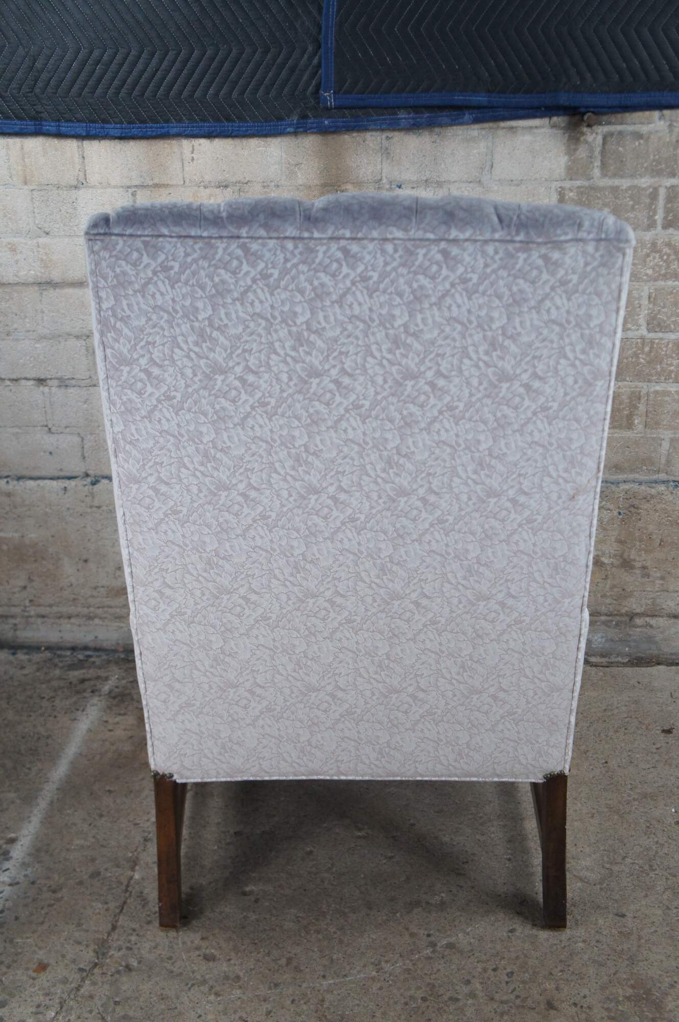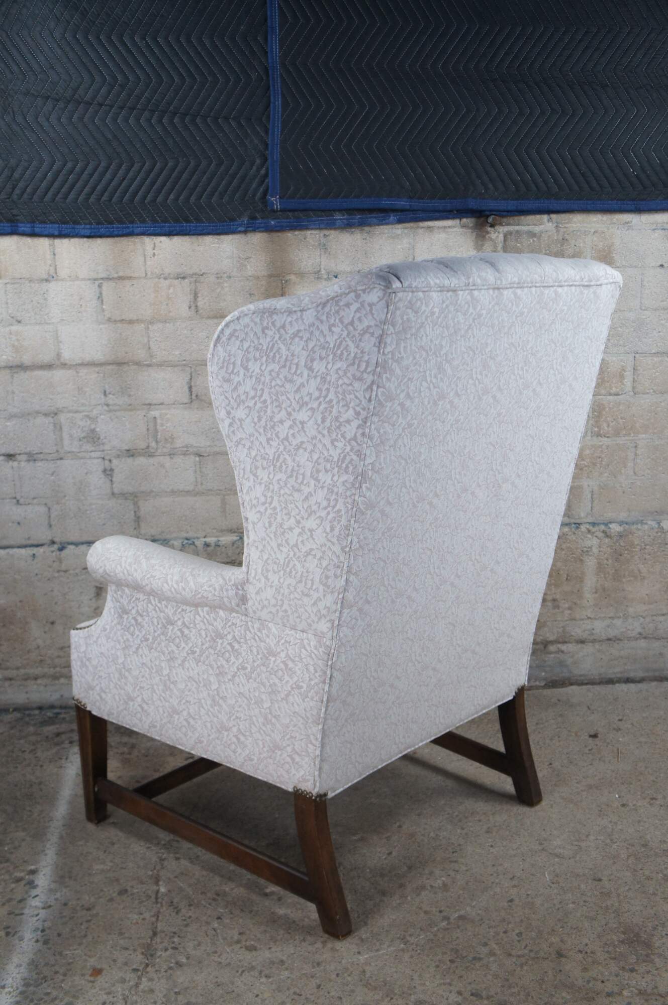 English Chippendale style wingback chair, circa last quarter 20th century. Made from mahogany with a foliate upholstered design, tufted back and nailhead trim. The chair is supported by square tapered legs connected by an H stretcher.