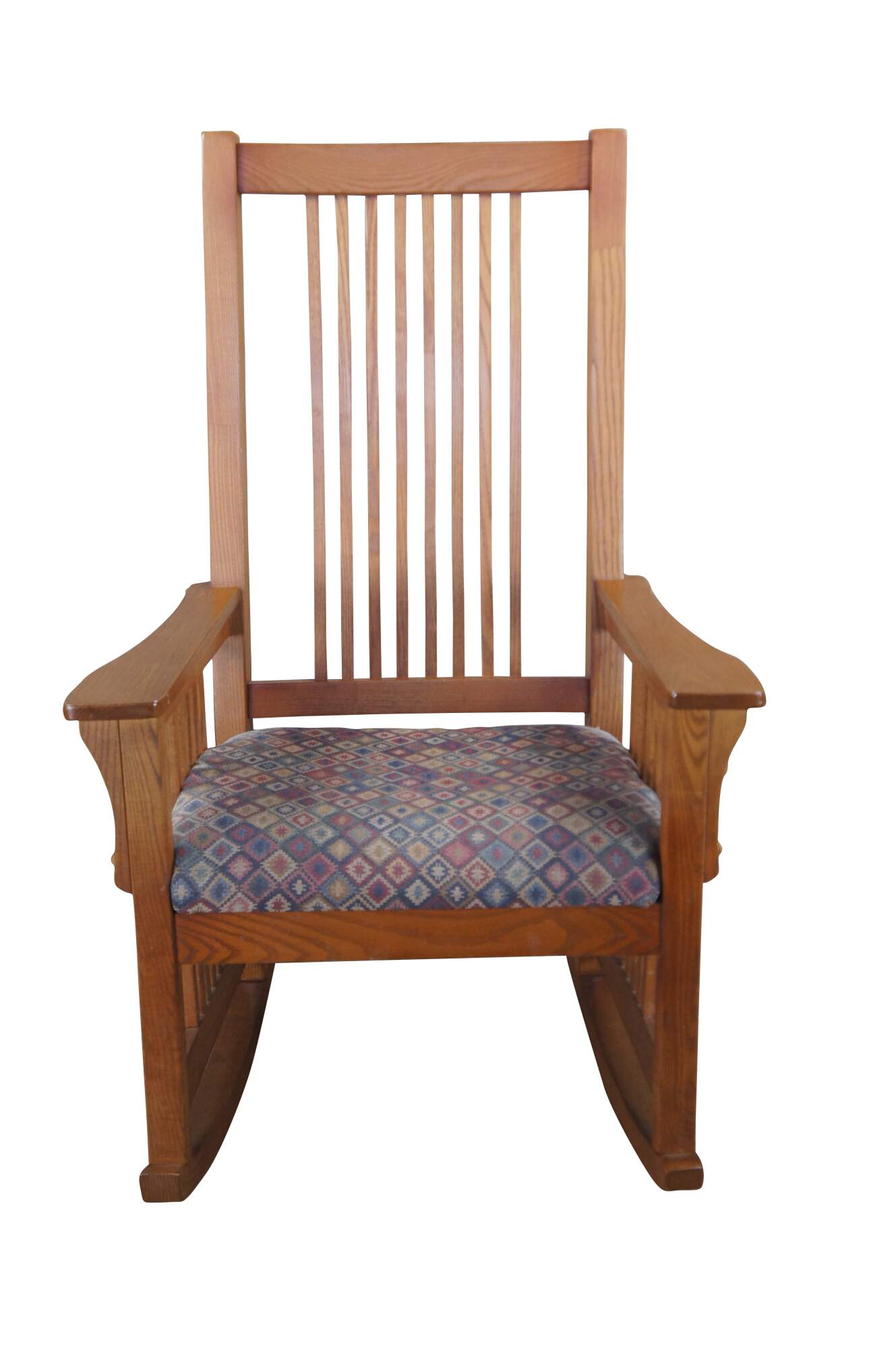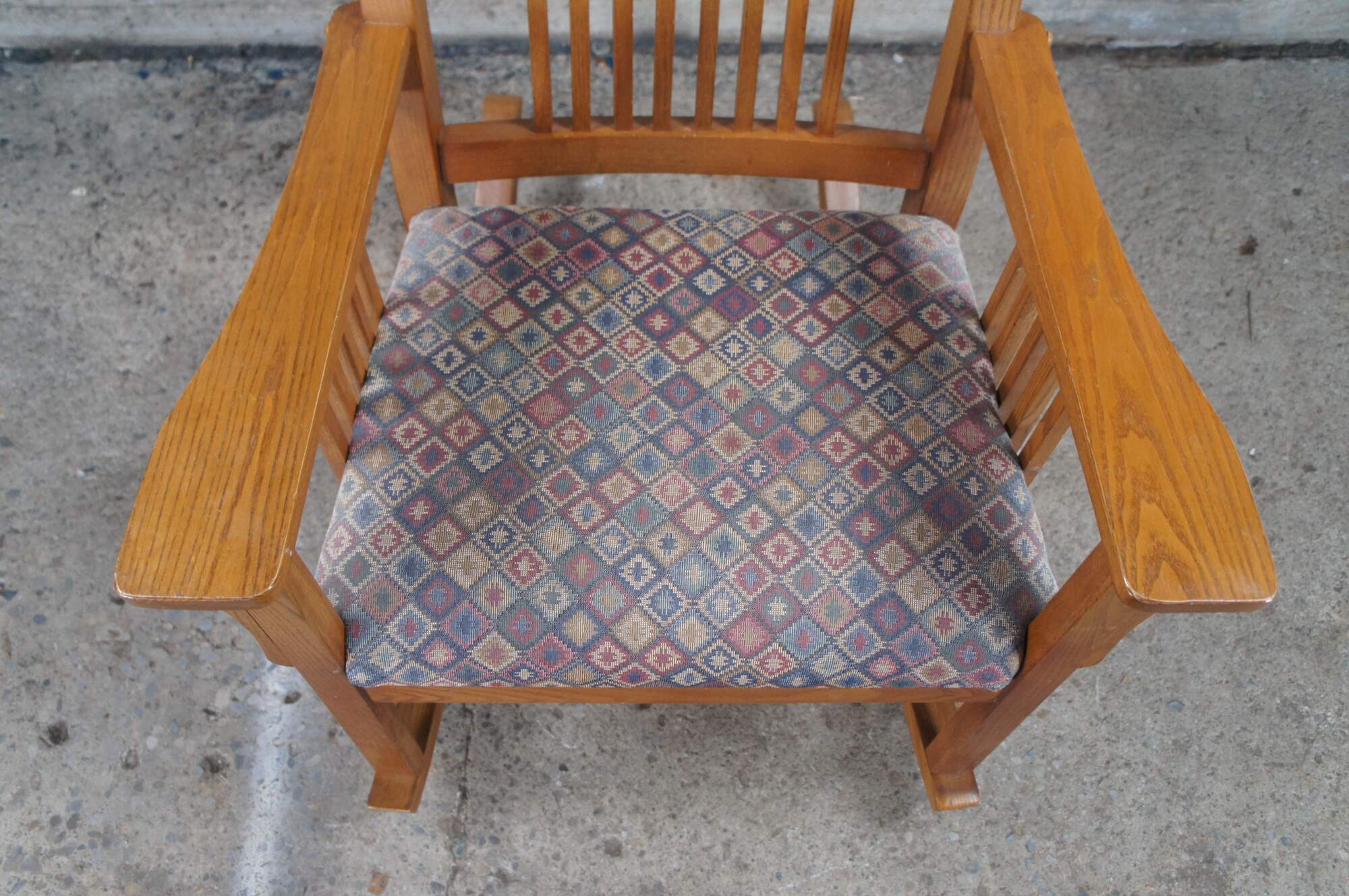 Early 21st Century rocking chair from Bassett Furniture Industries. Made from oak in Mission styling with smooth streamlined slat back and sides. The rocker features a geometric diamond pattern upholstered seat. Circa 2005