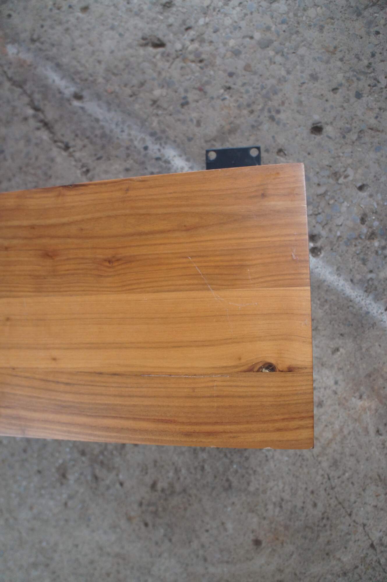 Early 21st Century Crate & Barrel Atwood Footboard. Could be repurposed and used as a console, low bookcase, or tv stand. Made from black walnut with dovetailed joints and a steel base. Originally connected to side rails and tied into a reclaimed poplar headboard.