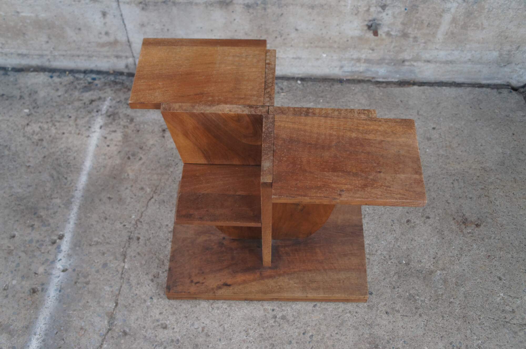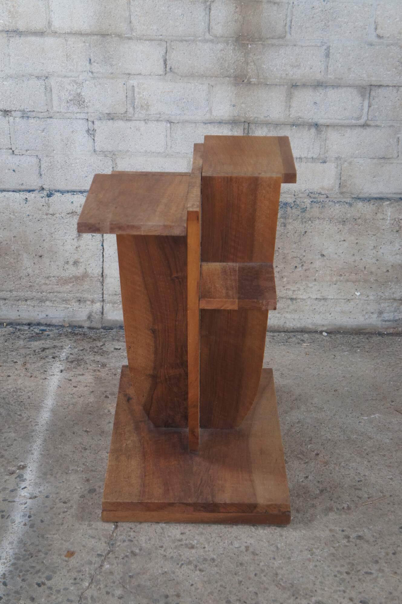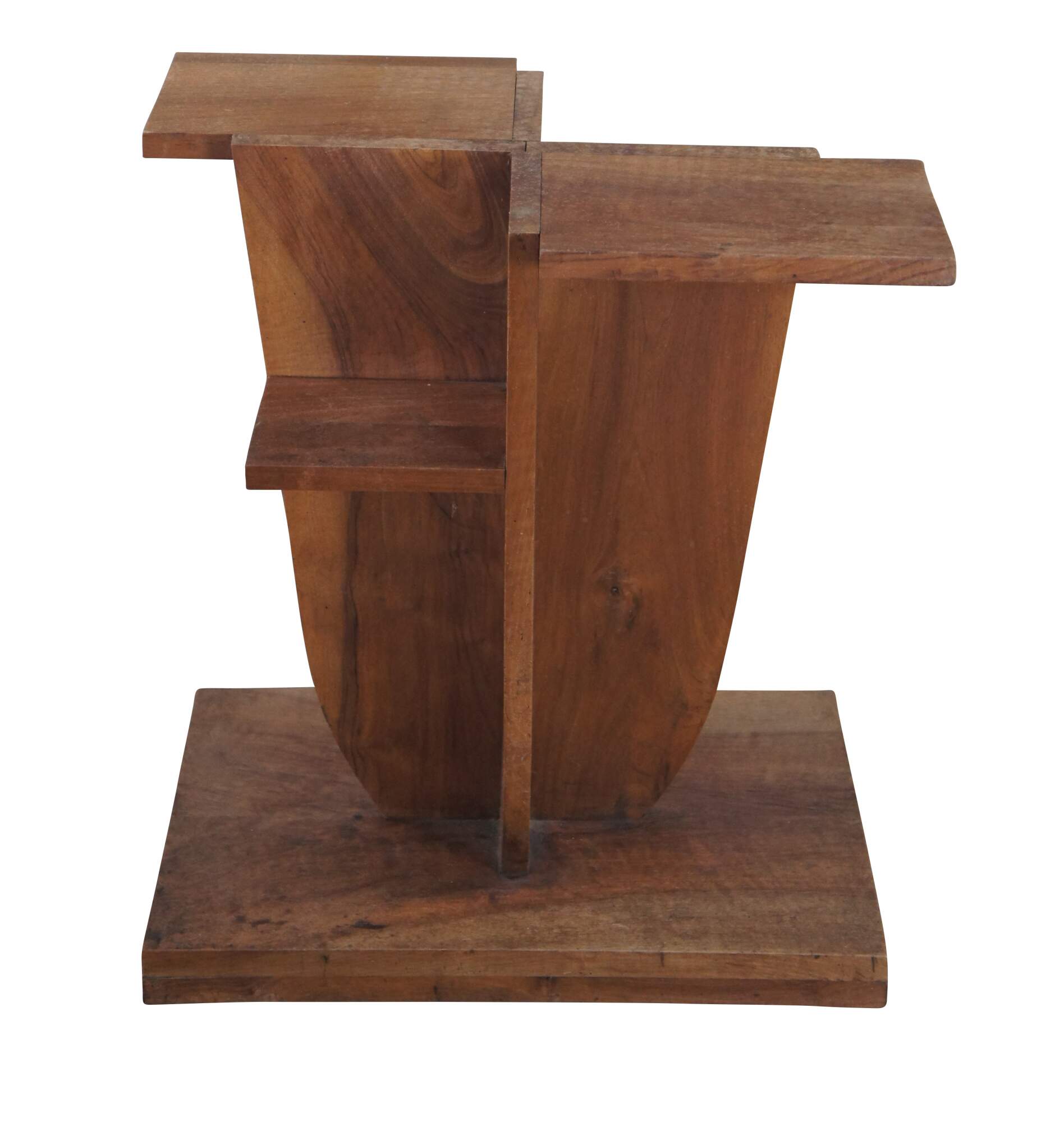 20th Century Art Deco style tiered sculpture stand or side table. Made from American walnut with an abstract form featuring an upper surface and two shelves on each side. The piece is set over a plinth base. A piece of glass could be added to use as a dining or side table.