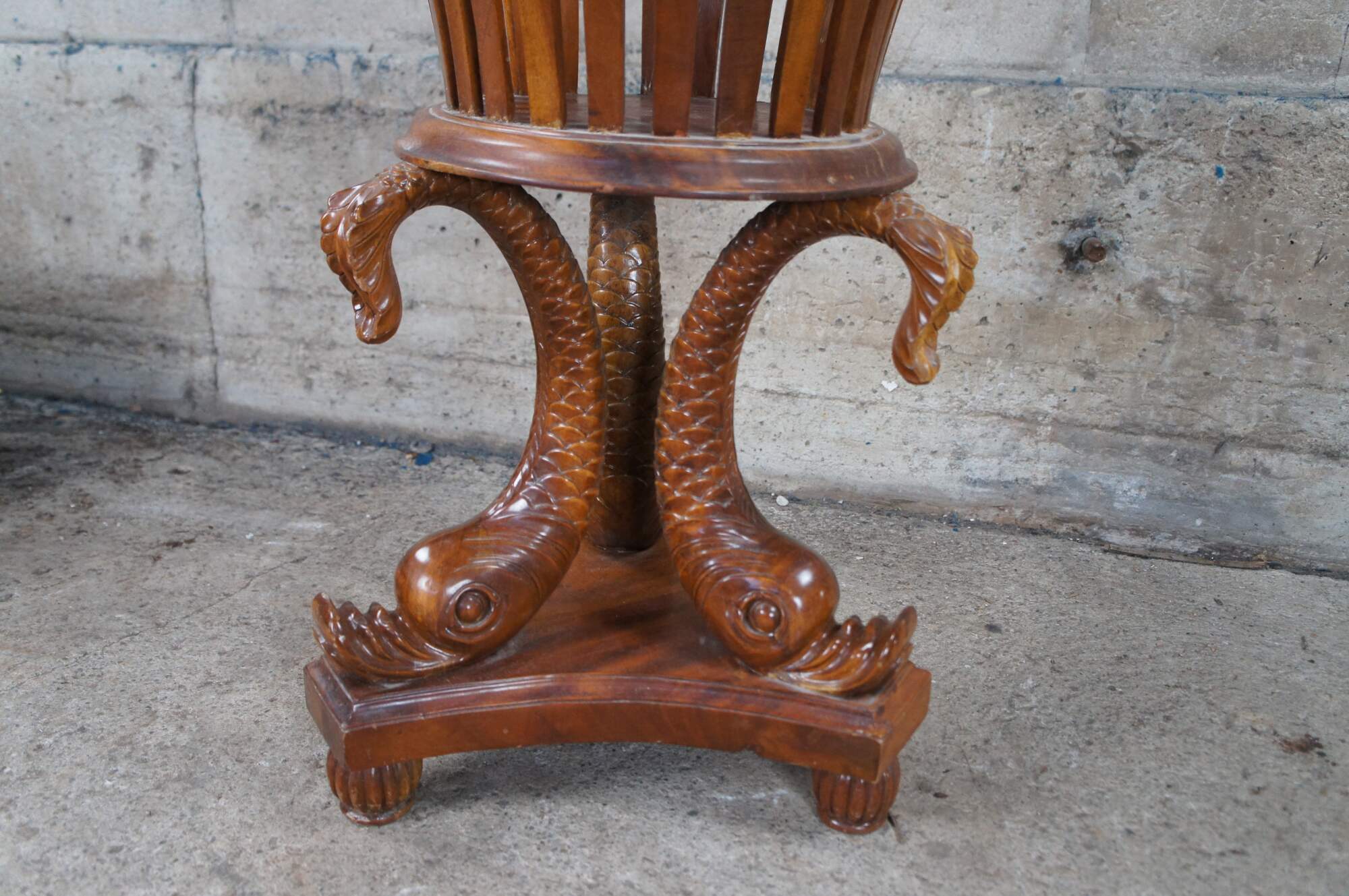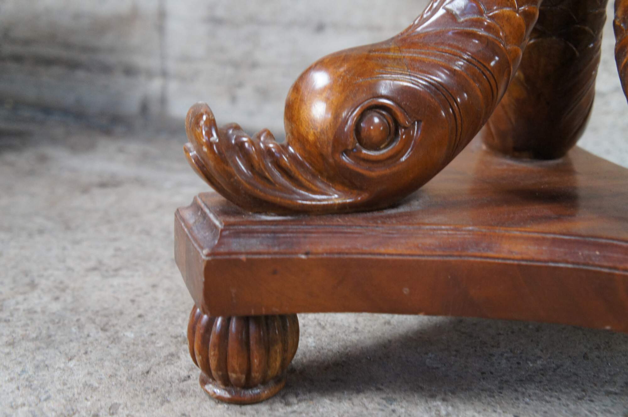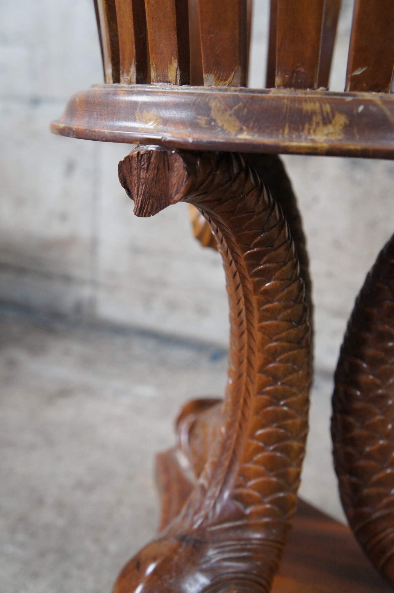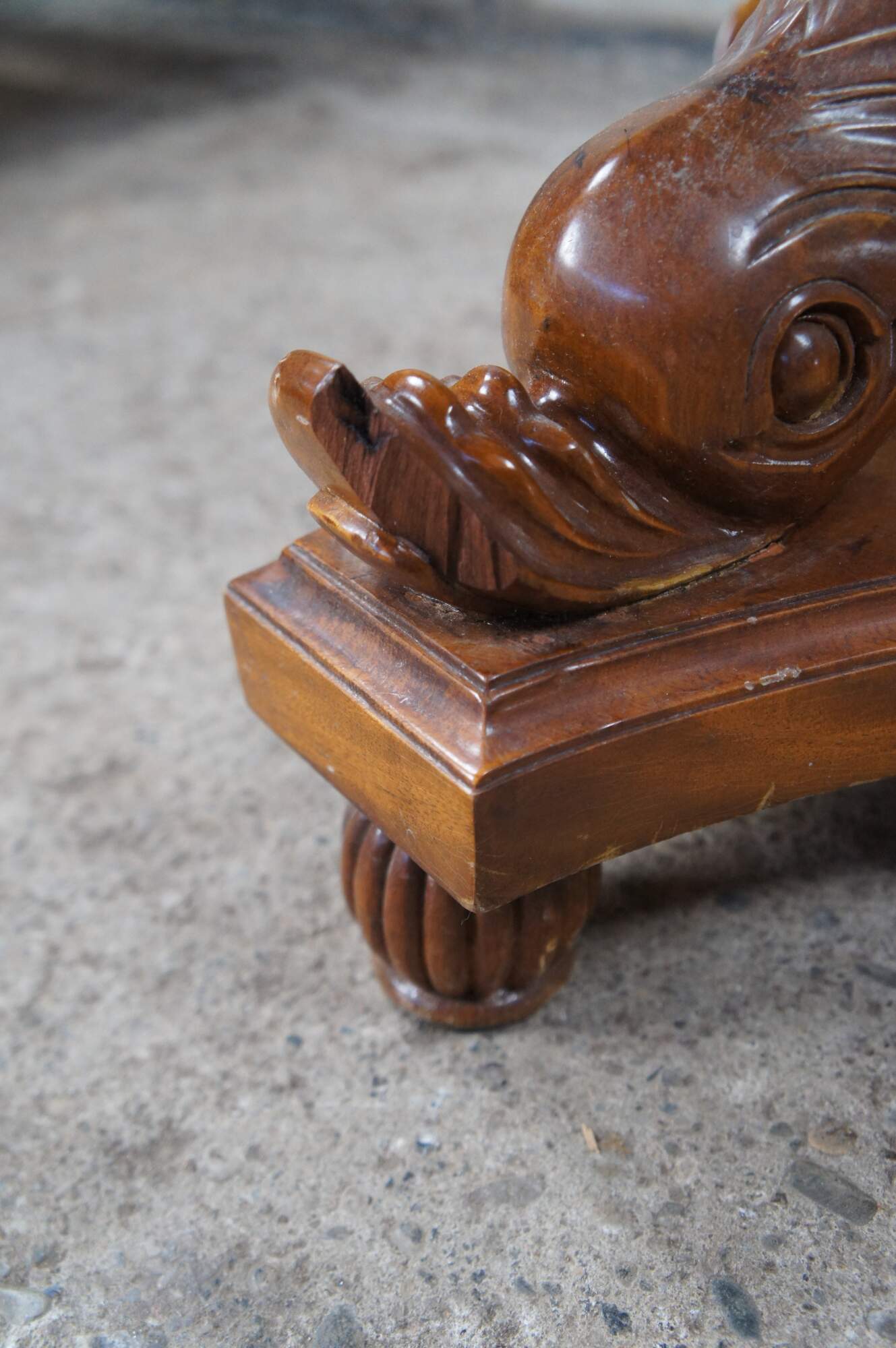 Fair; structurally solid. Broken /missing carving. The tail of one dolphin is missing and there is a chip to another’s mouth. Distressing, finish loss and marking.