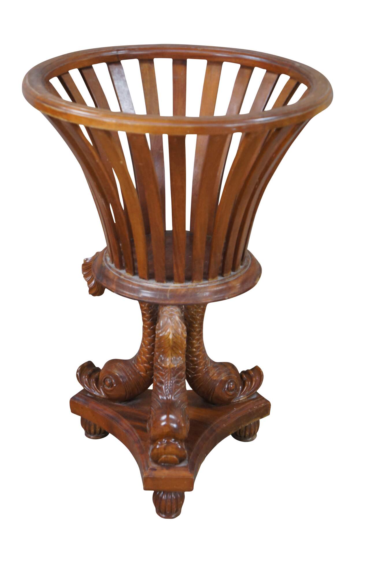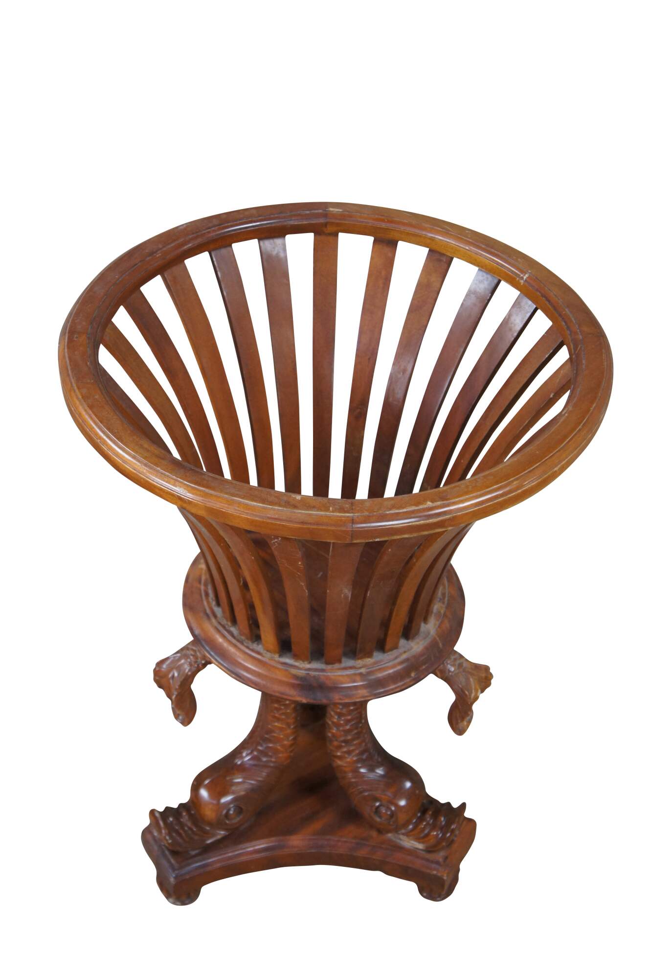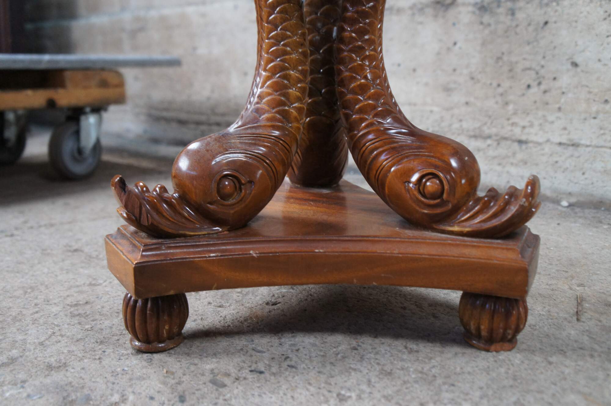 Fair; structurally solid. Broken /missing carving. The tail of one dolphin is missing and there is a chip to another’s mouth. Distressing, finish loss and marking.