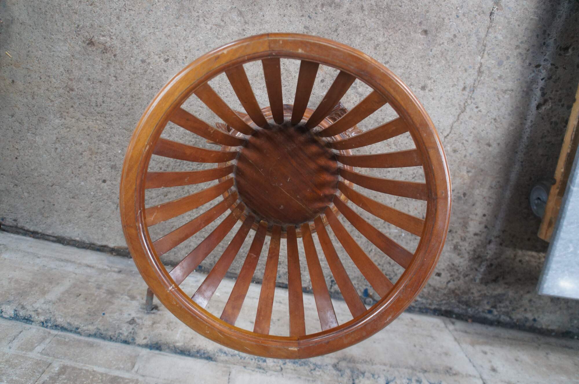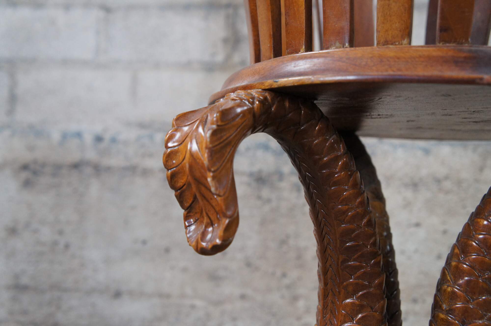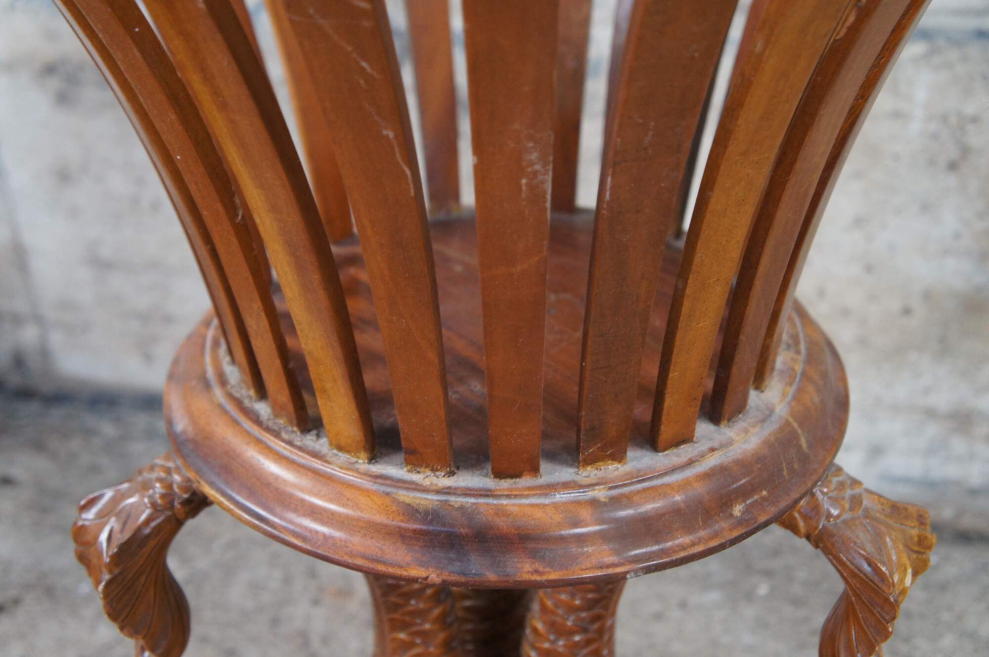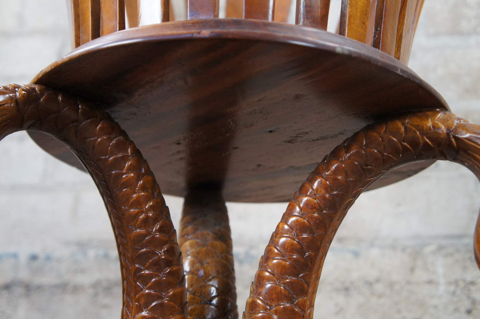 Fair; structurally solid. Broken /missing carving. The tail of one dolphin is missing and there is a chip to another’s mouth. Distressing, finish loss and marking.
